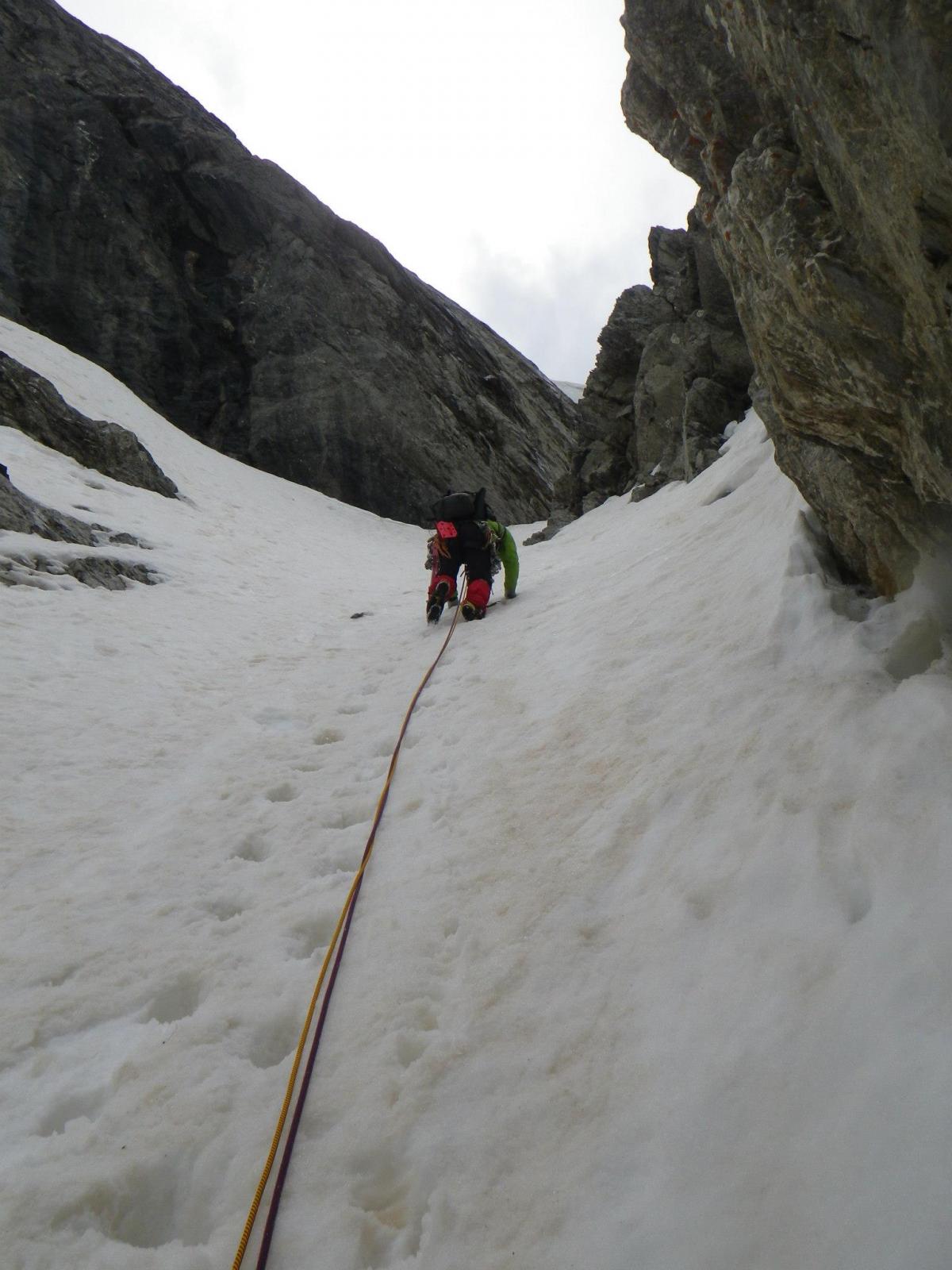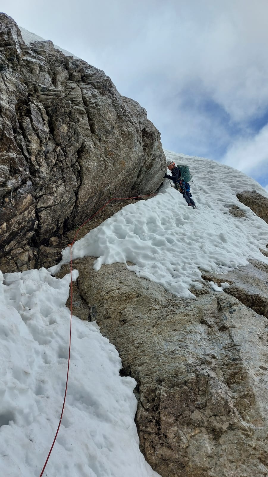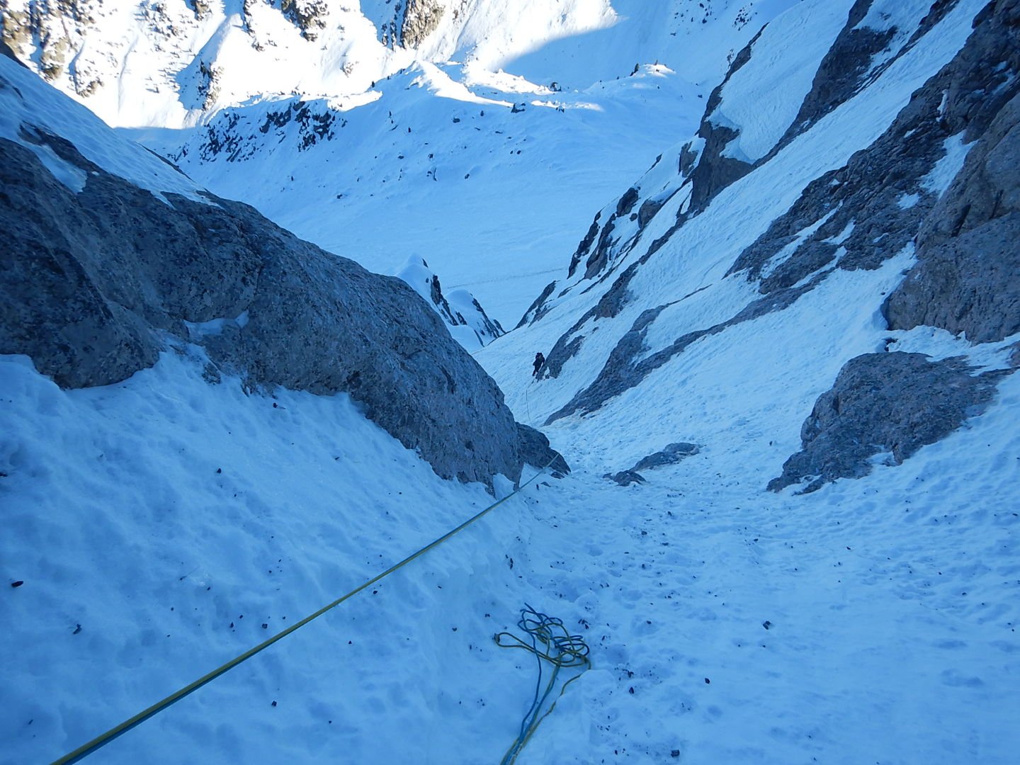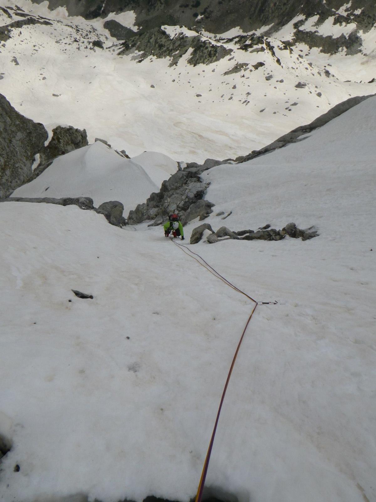 6.. Dalla sosta ci si abbassa di qualche metro, si attraversa a destra e si supera la fascia rocciosa su terreno misto (III, IV). Un breve pendio nevoso porta ad un altro affioramento roccioso, 55m 2 anelli.