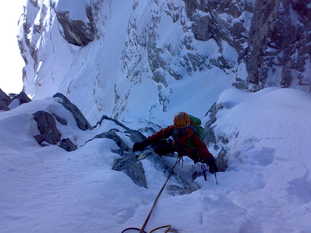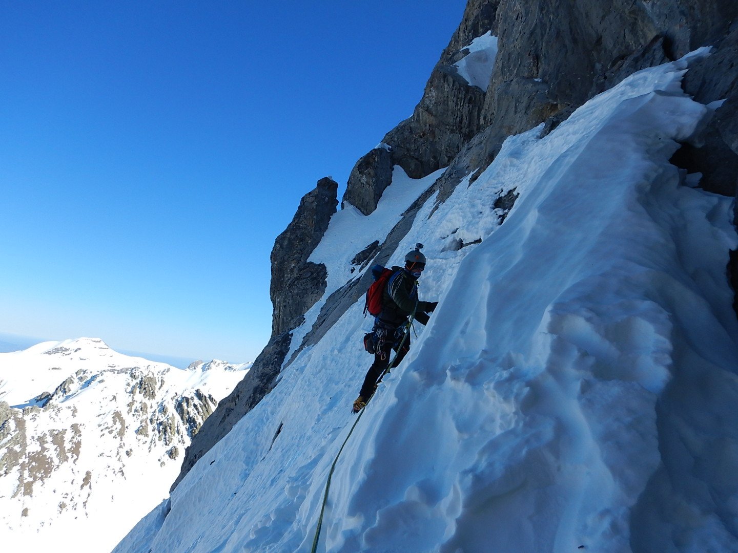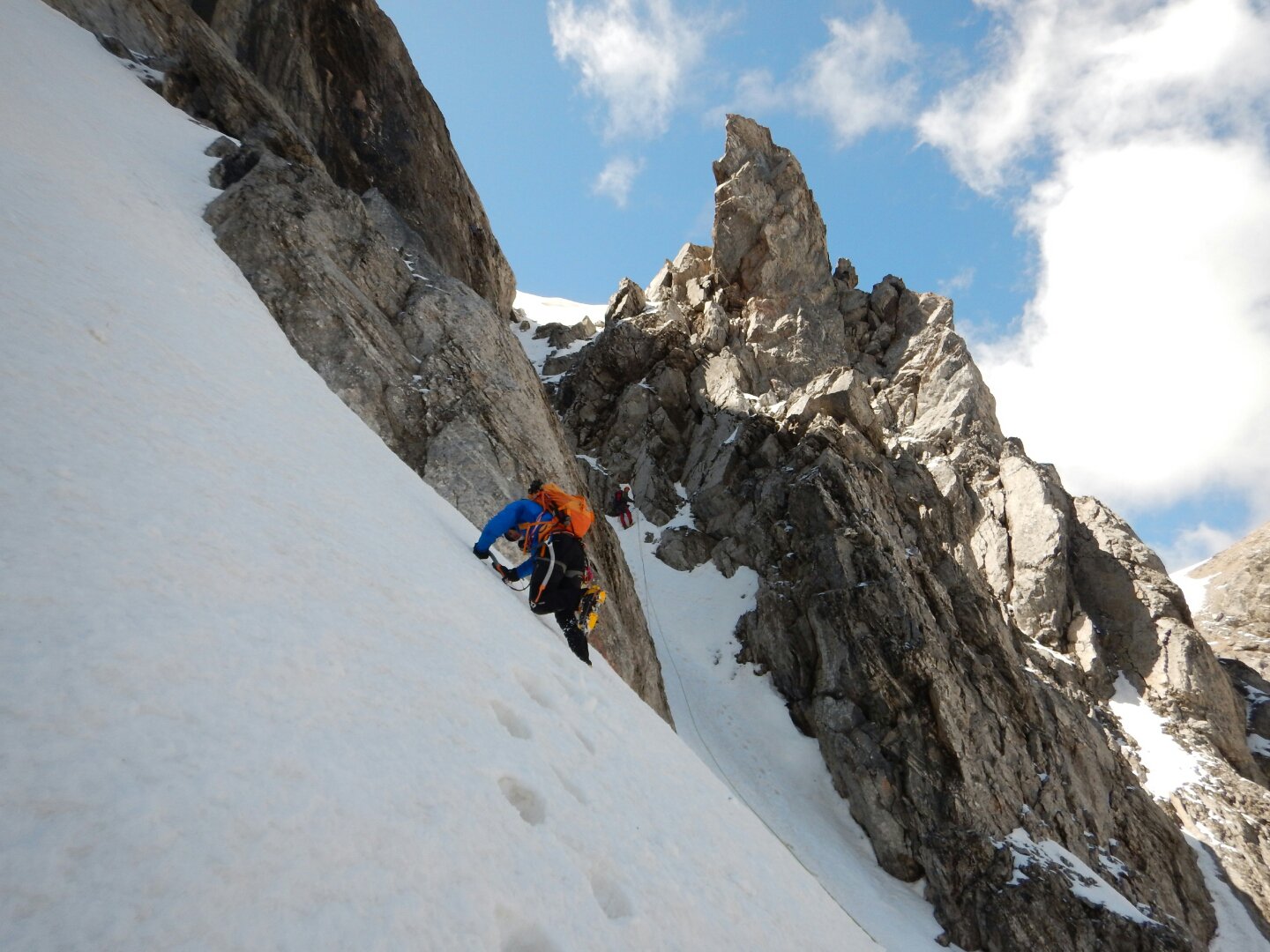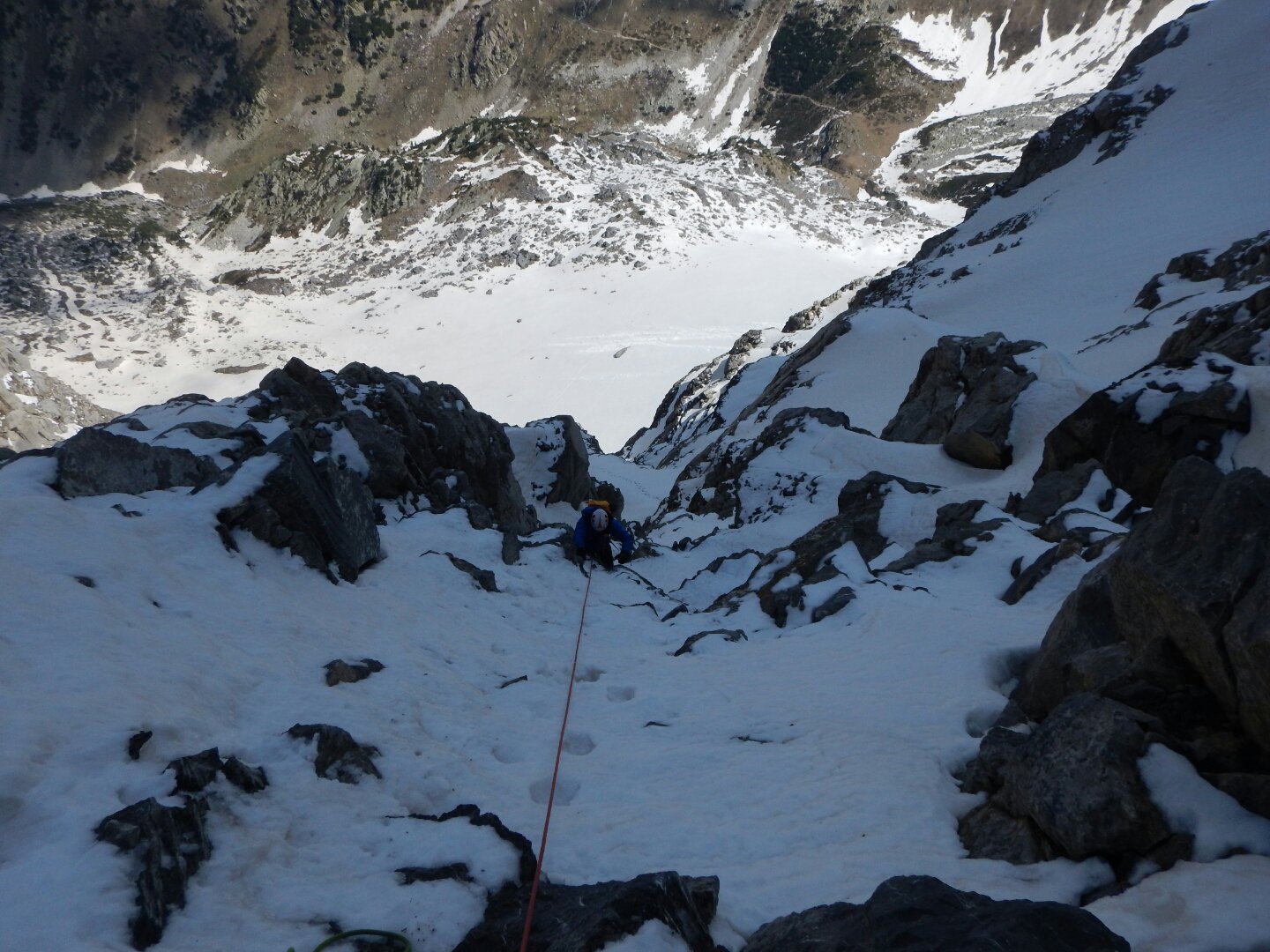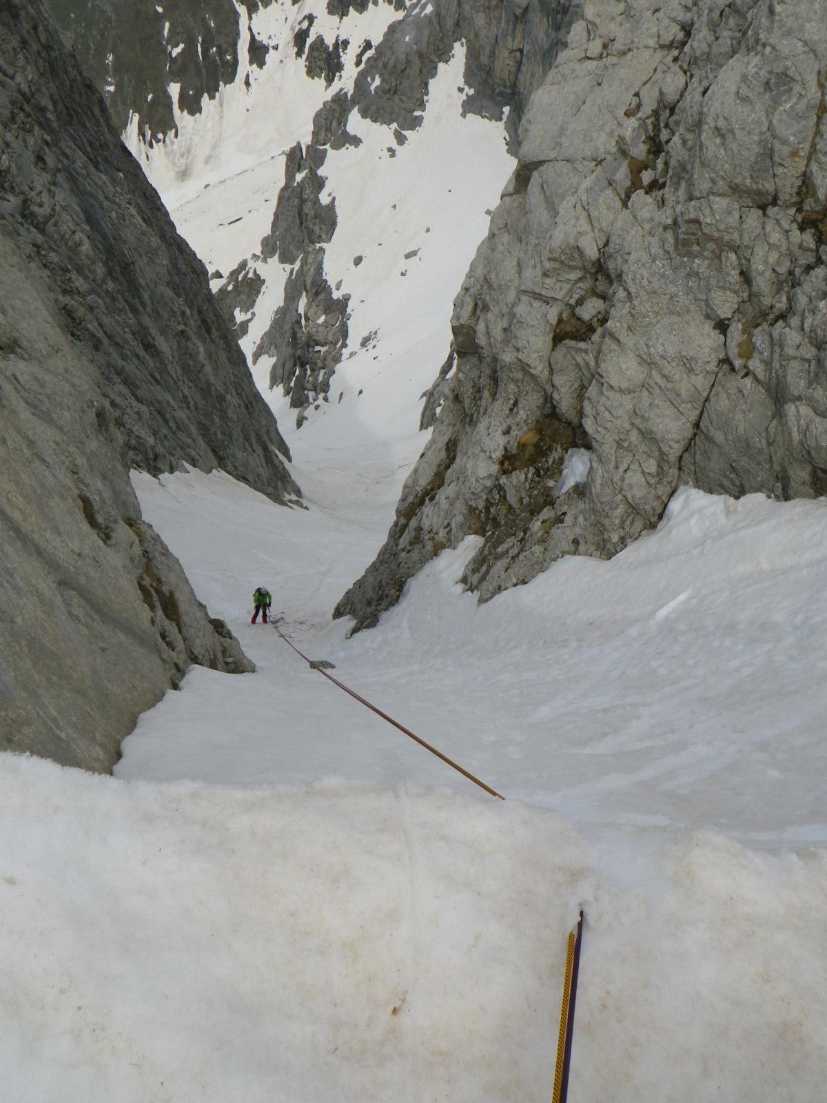 6.. Dalla sosta ci si abbassa di qualche metro, si attraversa a destra e si supera la fascia rocciosa su terreno misto (III, IV). Un breve pendio nevoso porta ad un altro affioramento roccioso, 55m 2 anelli.