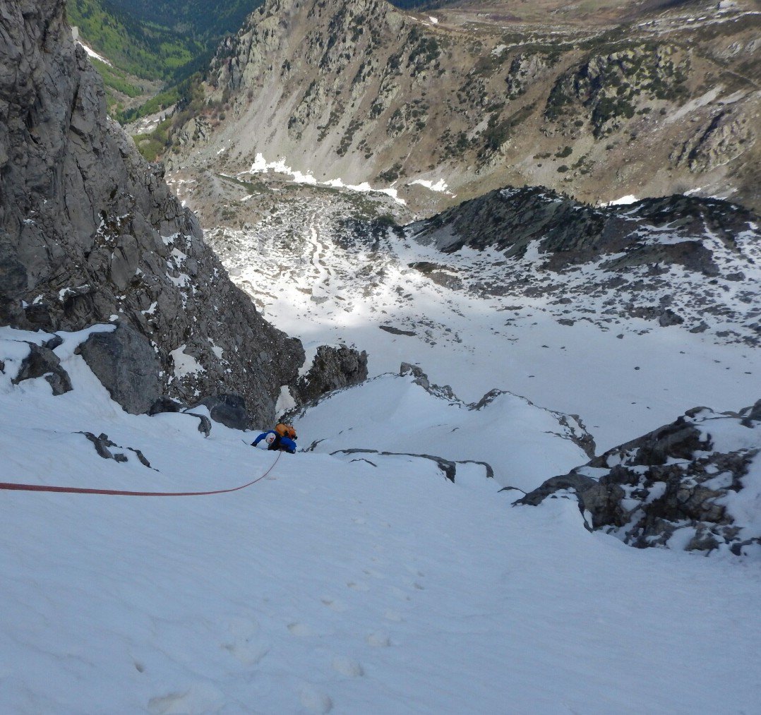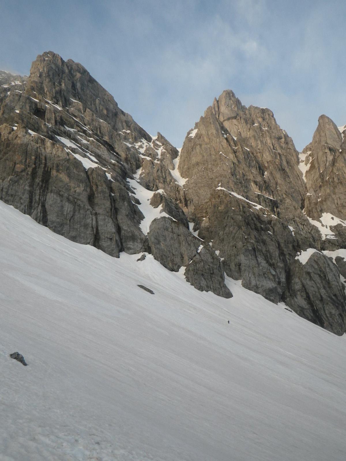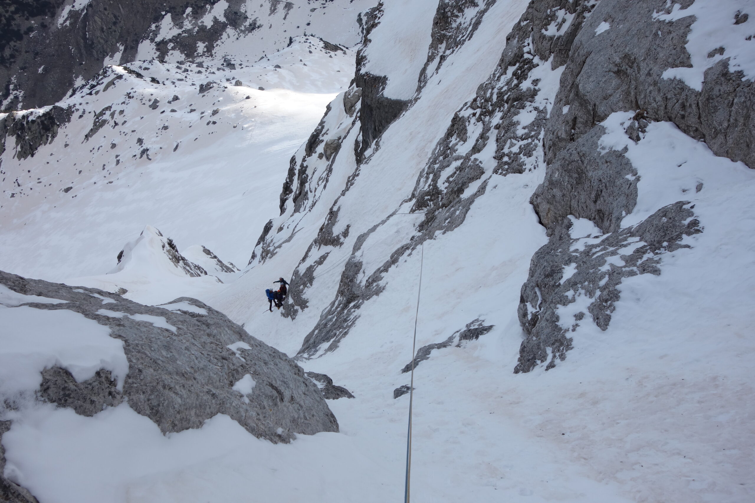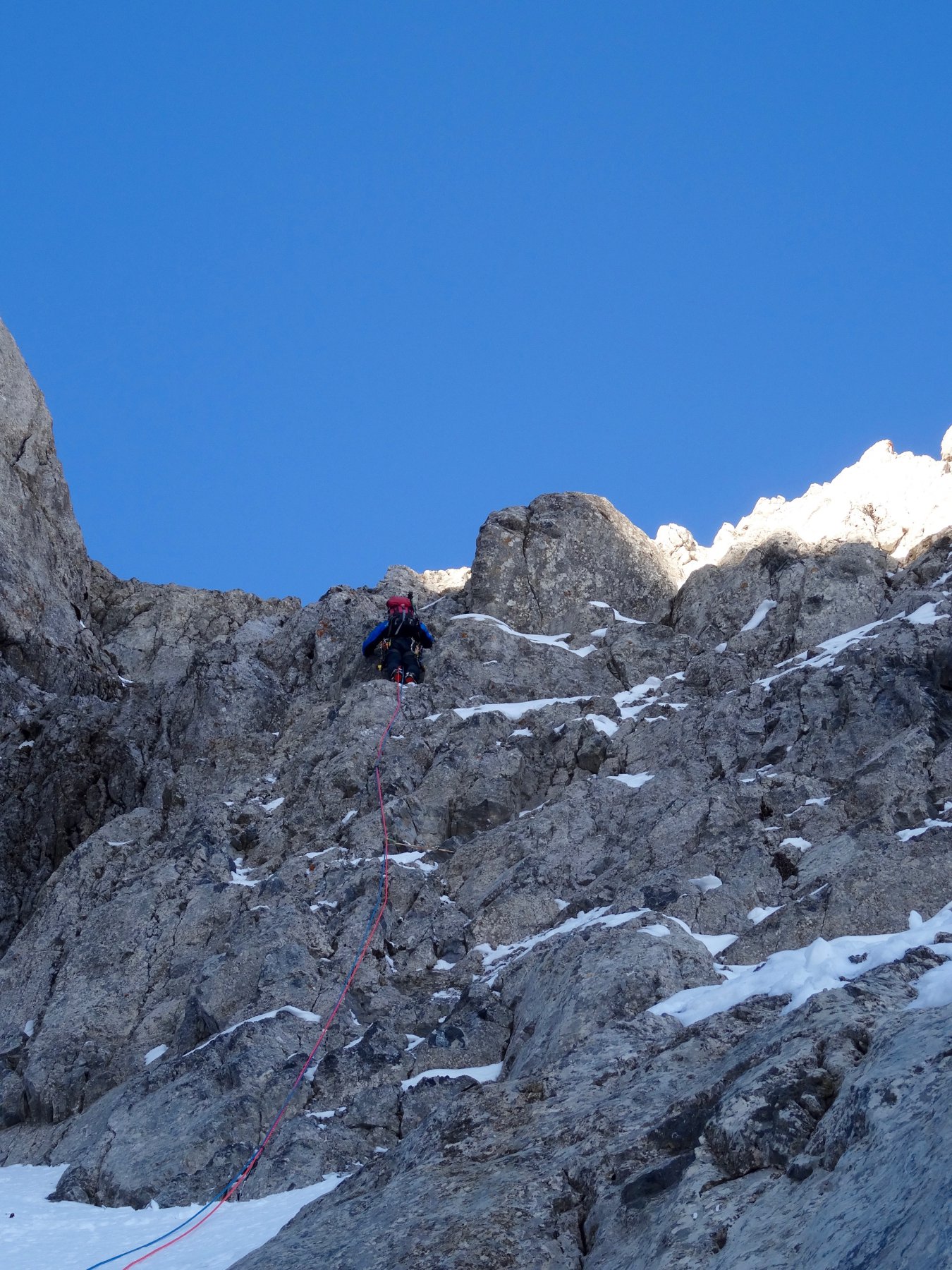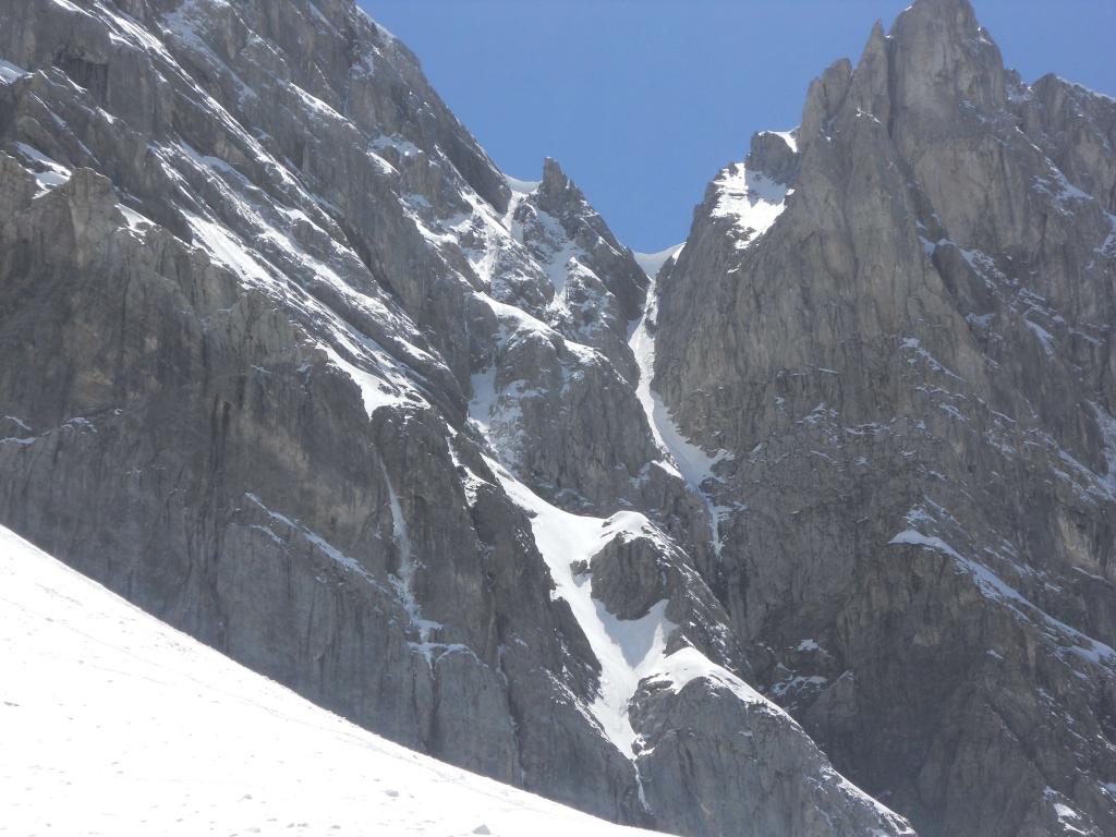 6.. Dalla sosta ci si abbassa di qualche metro, si attraversa a destra e si supera la fascia rocciosa su terreno misto (III, IV). Un breve pendio nevoso porta ad un altro affioramento roccioso, 55m 2 anelli.