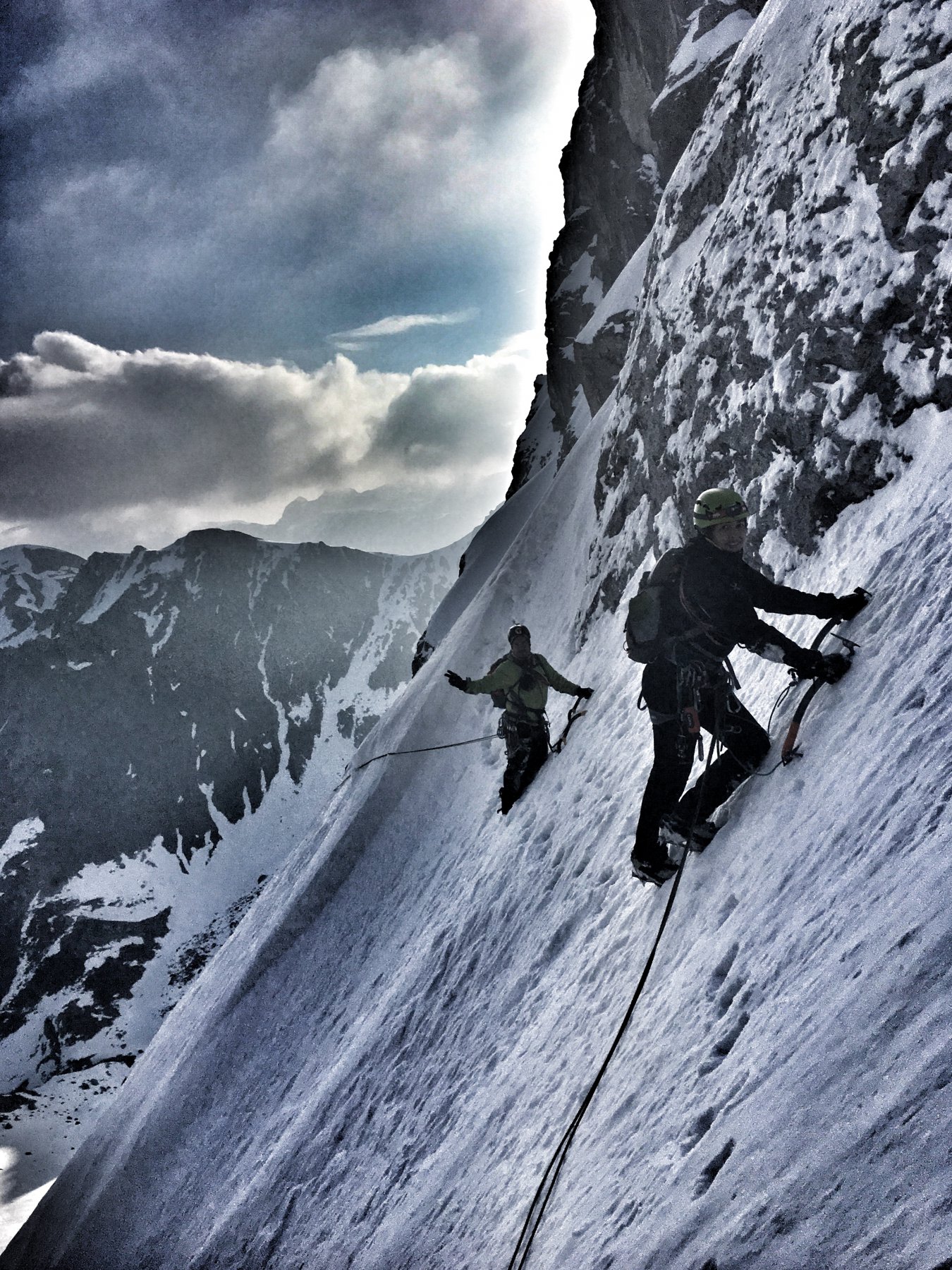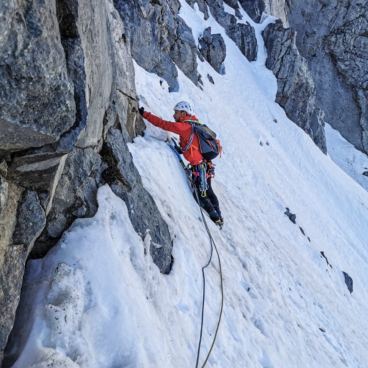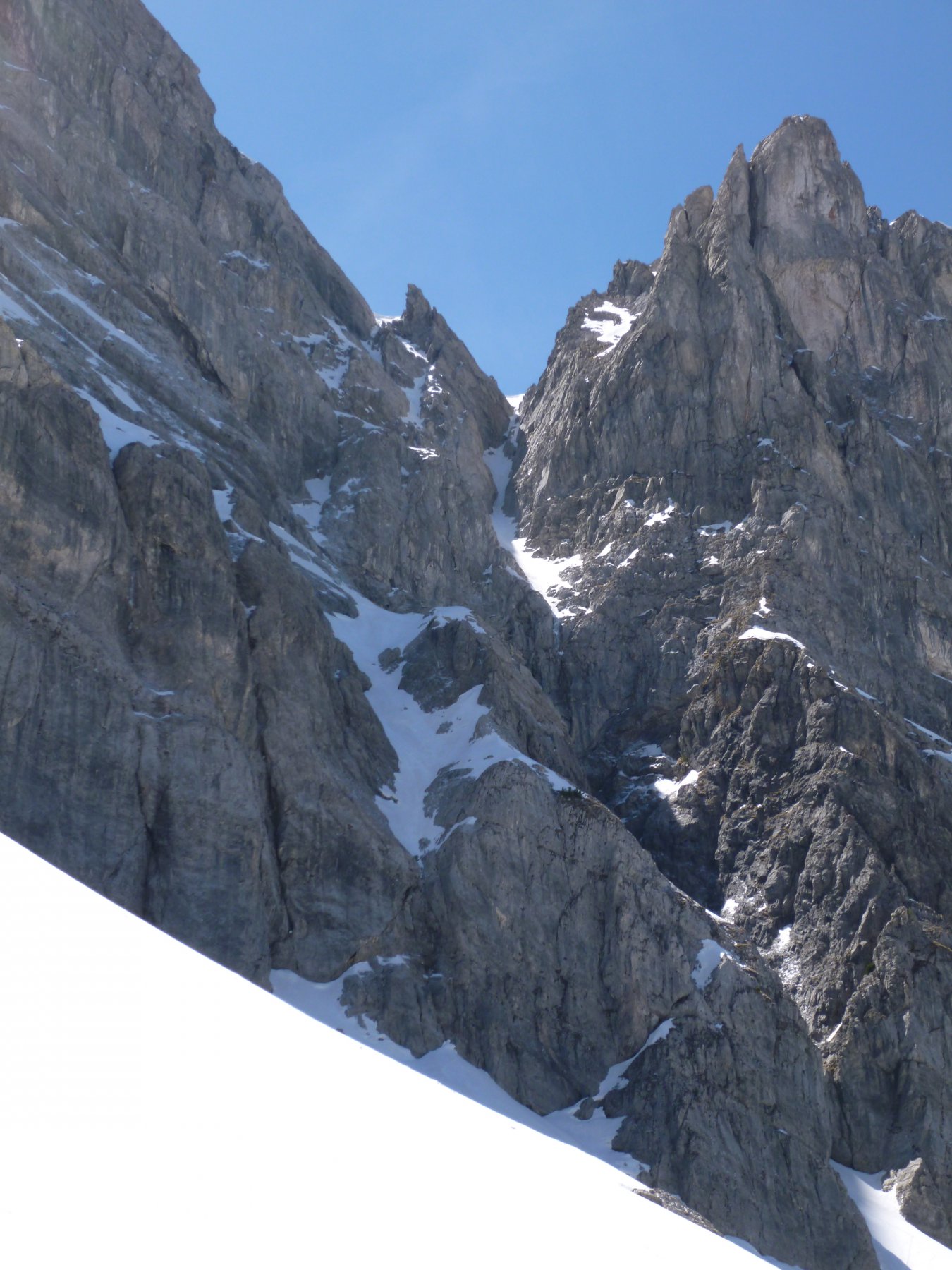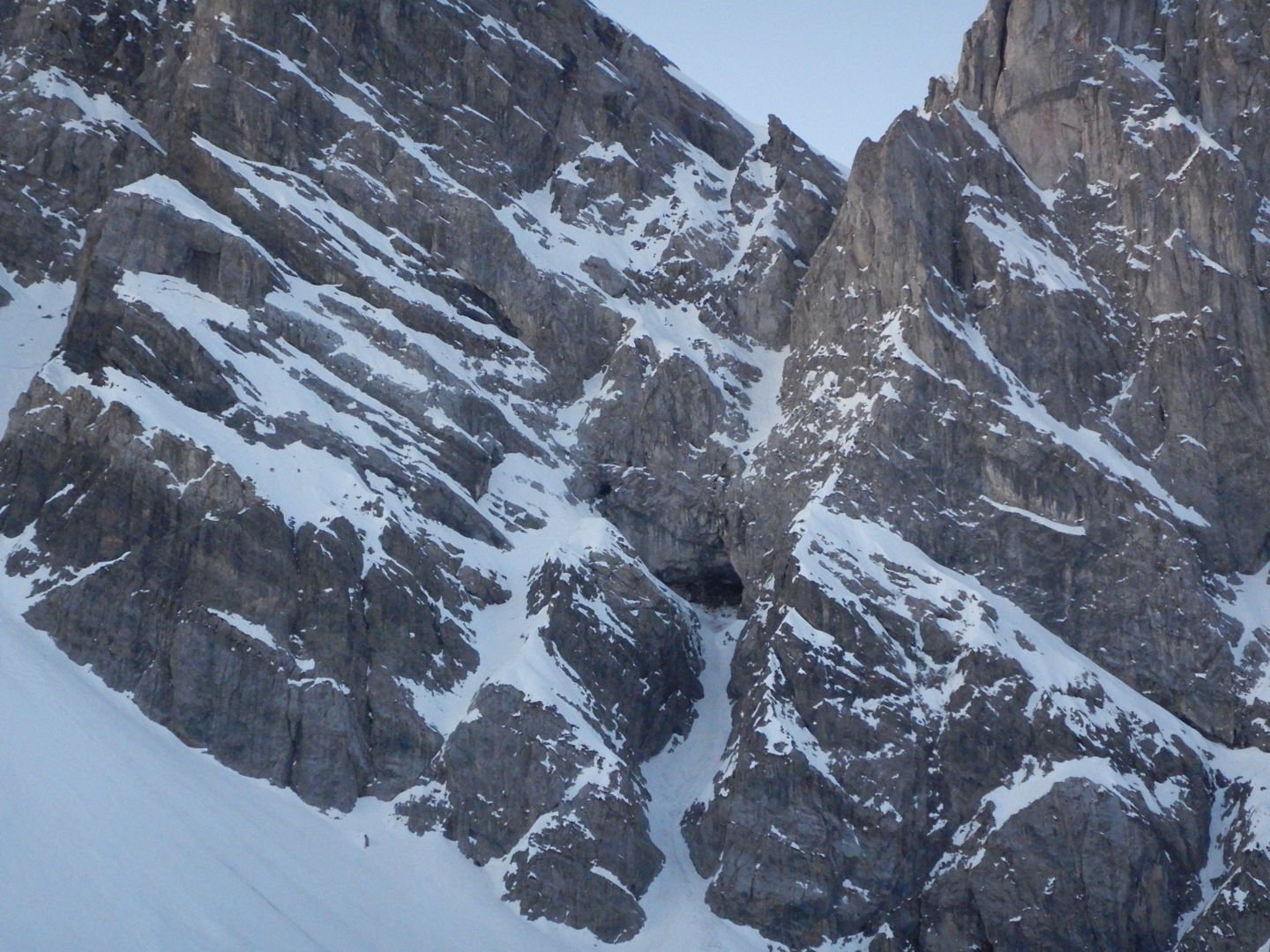 6.. Dalla sosta ci si abbassa di qualche metro, si attraversa a destra e si supera la fascia rocciosa su terreno misto (III, IV). Un breve pendio nevoso porta ad un altro affioramento roccioso, 55m 2 anelli.