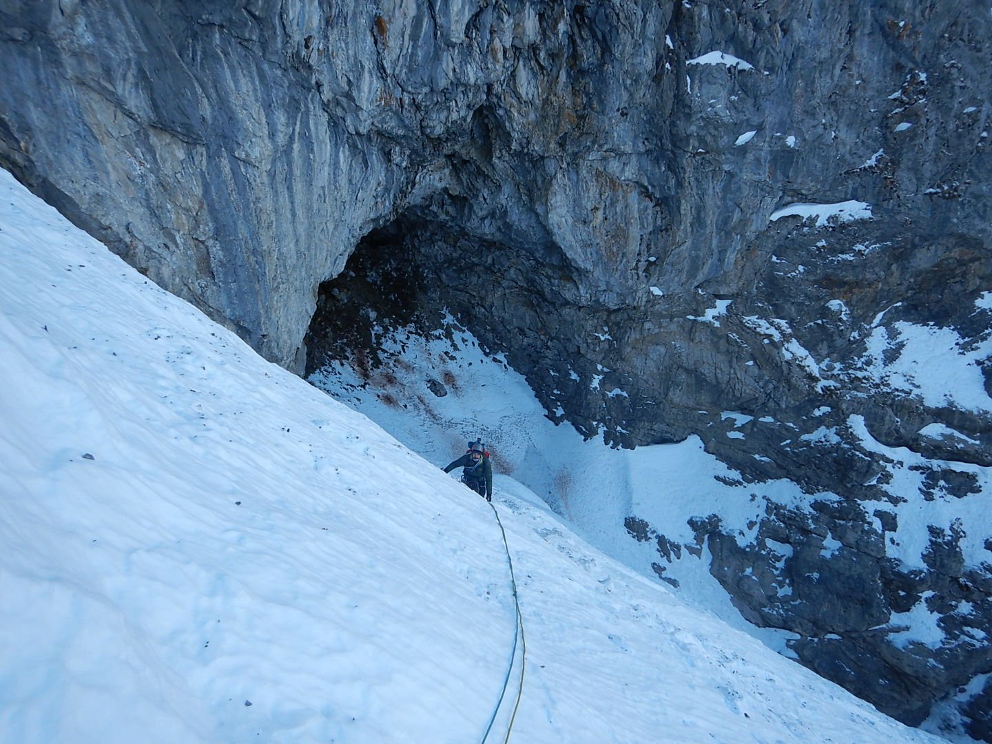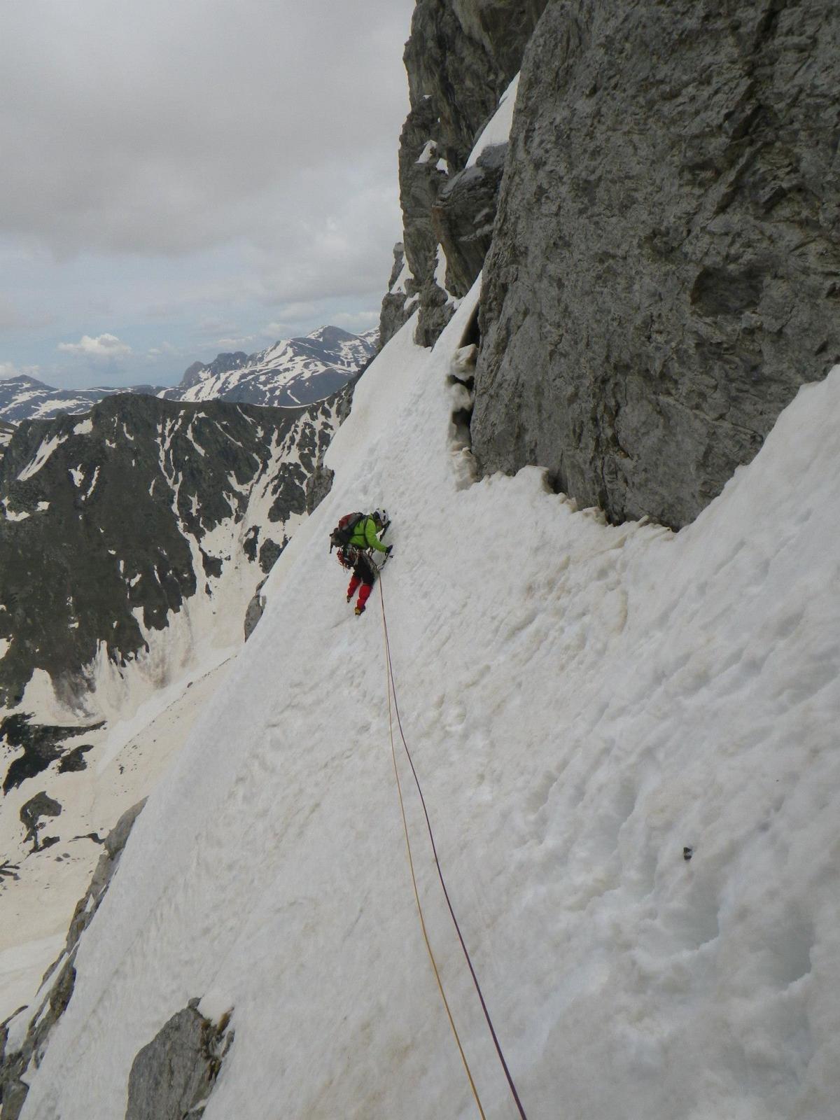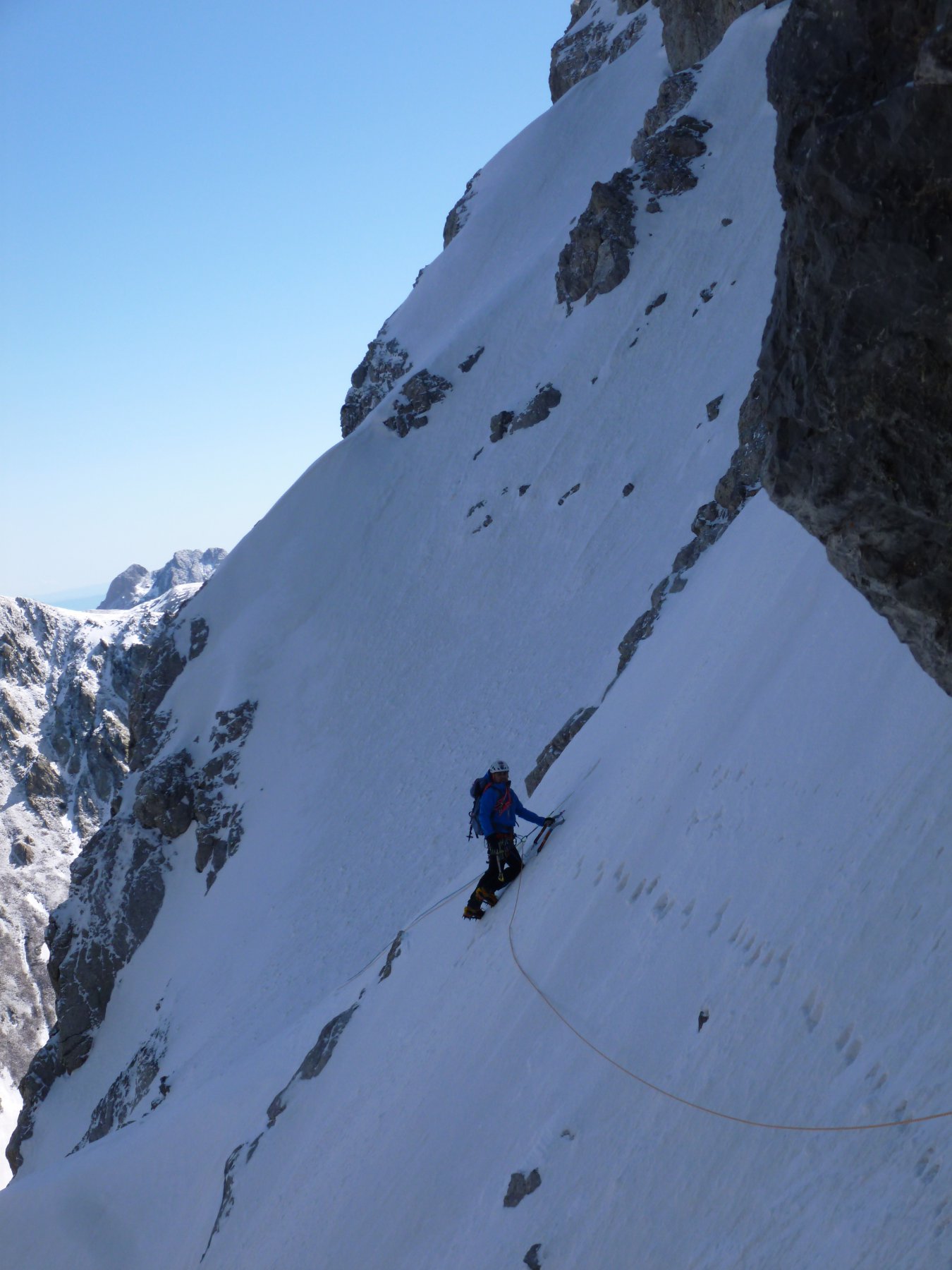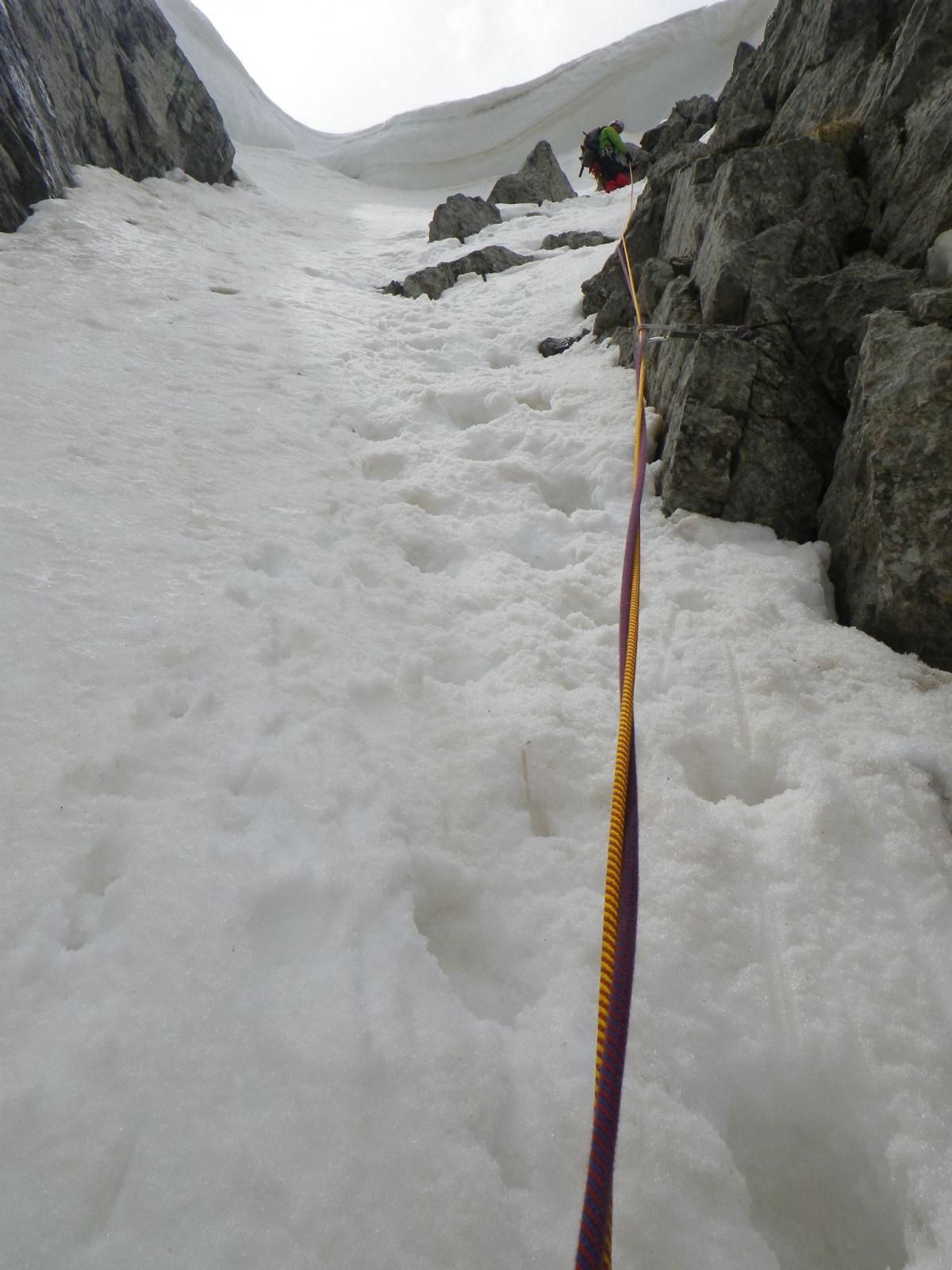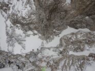 1.. Si attraversa a sinistra su cengia nevosa per 50m, 2 anelli.