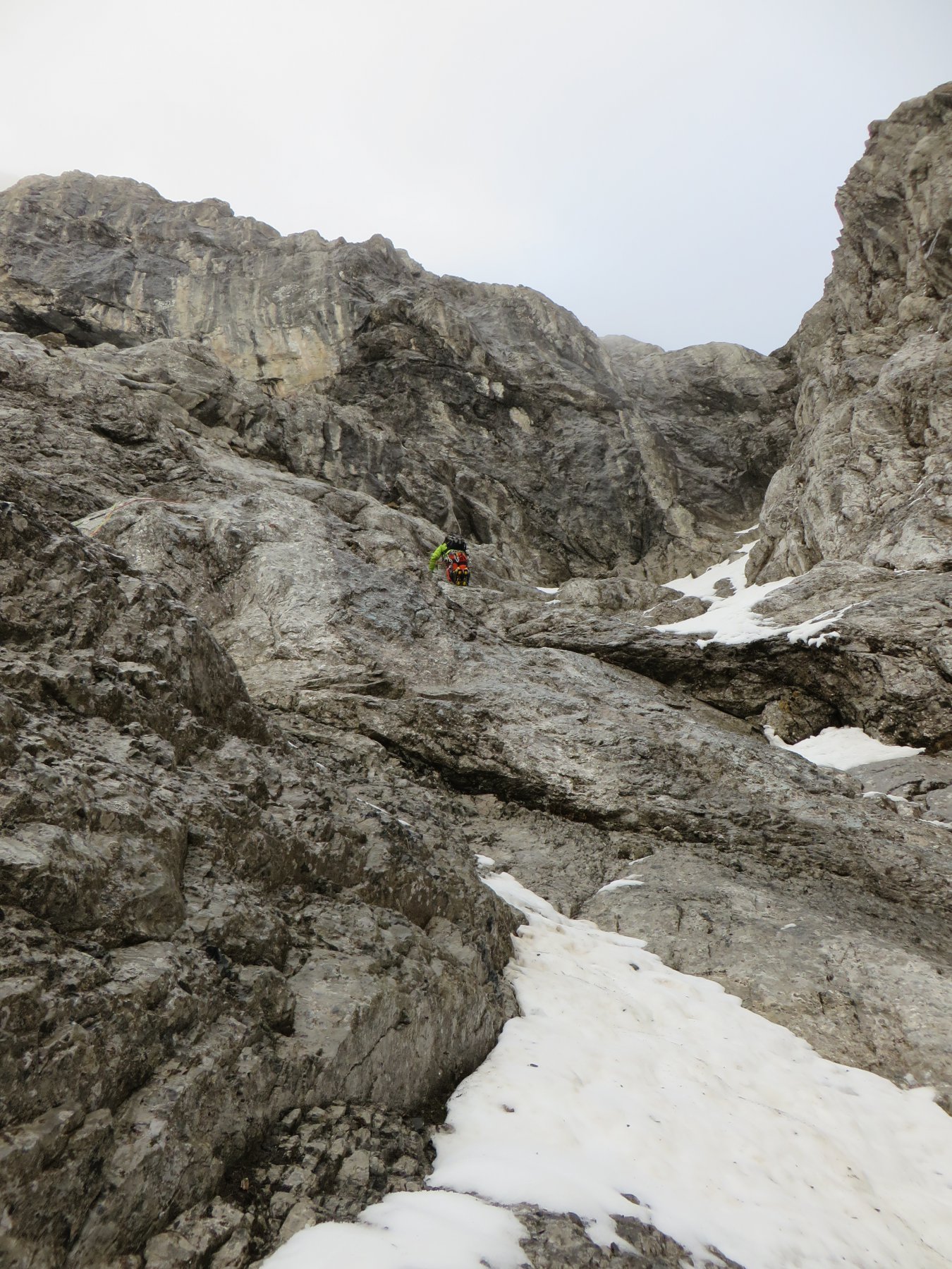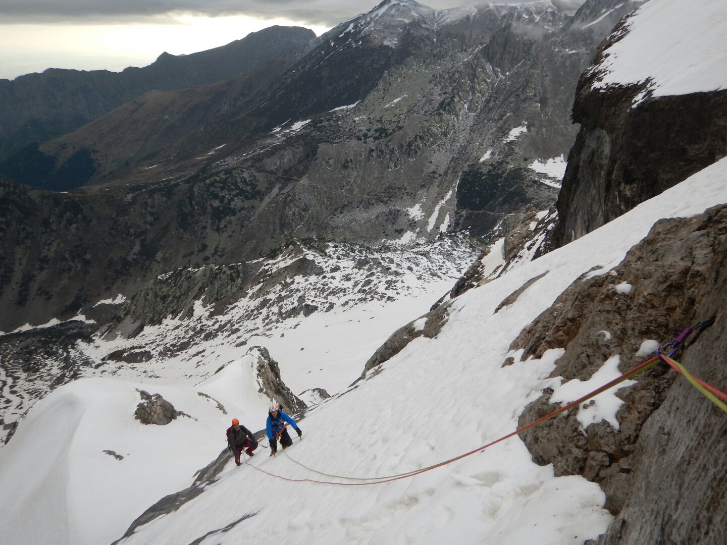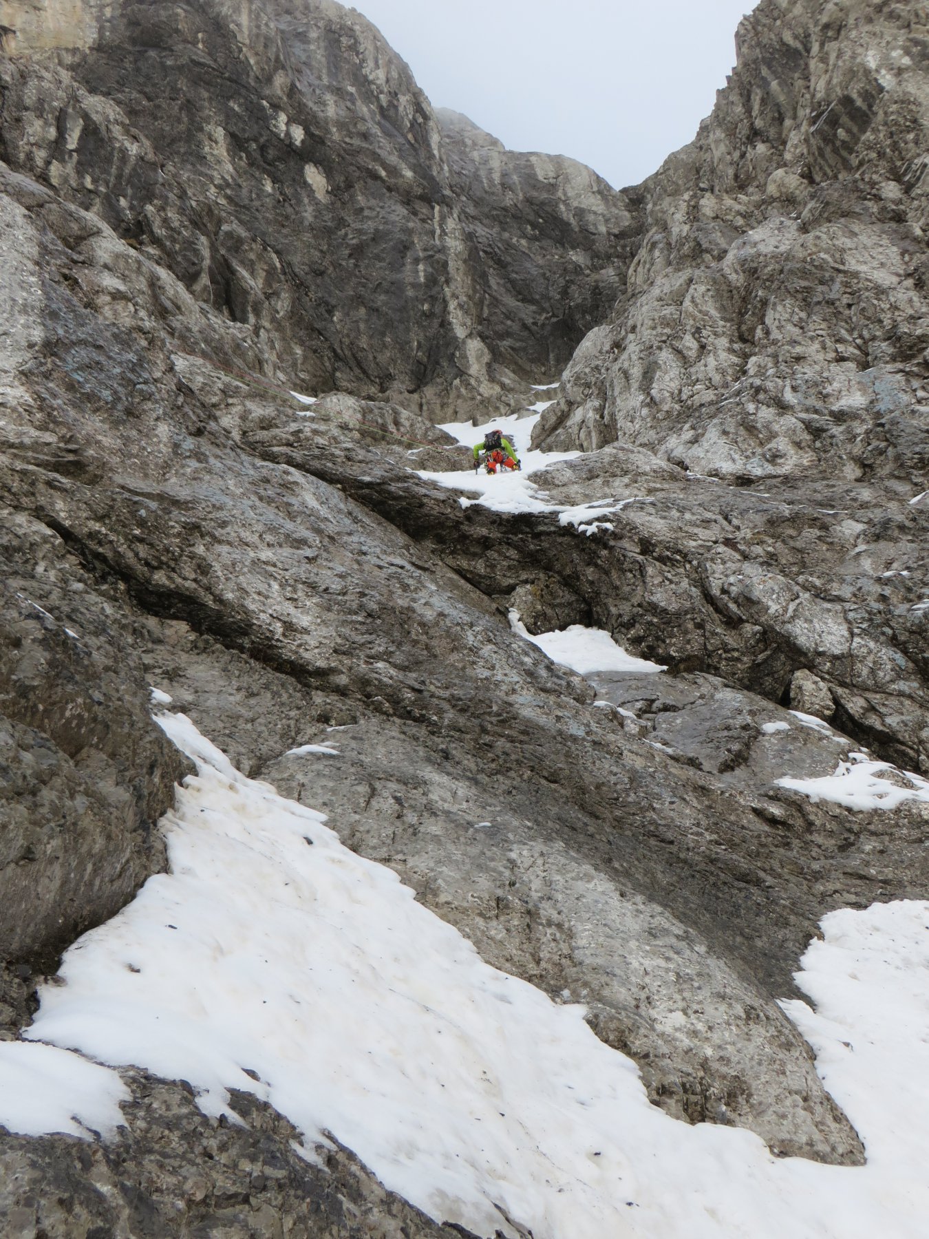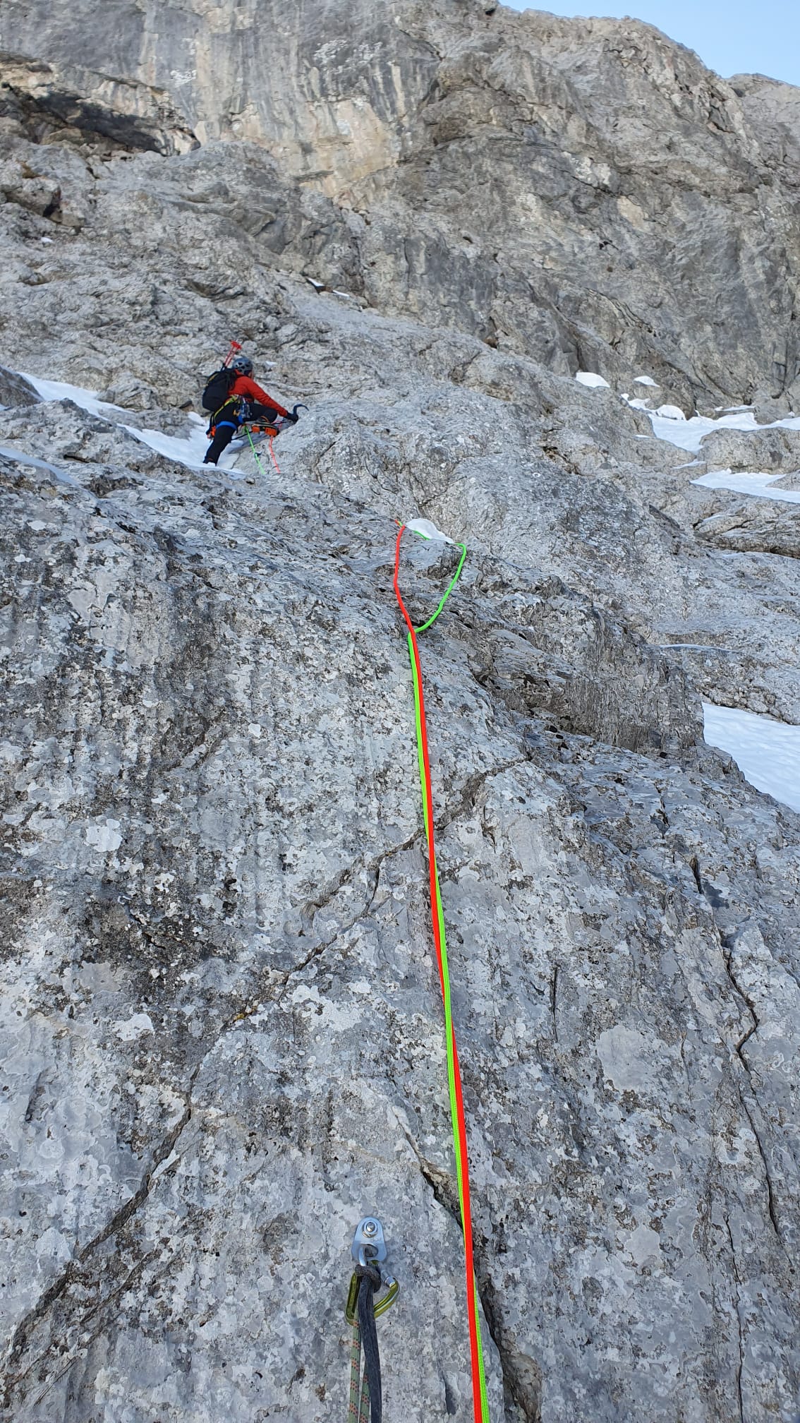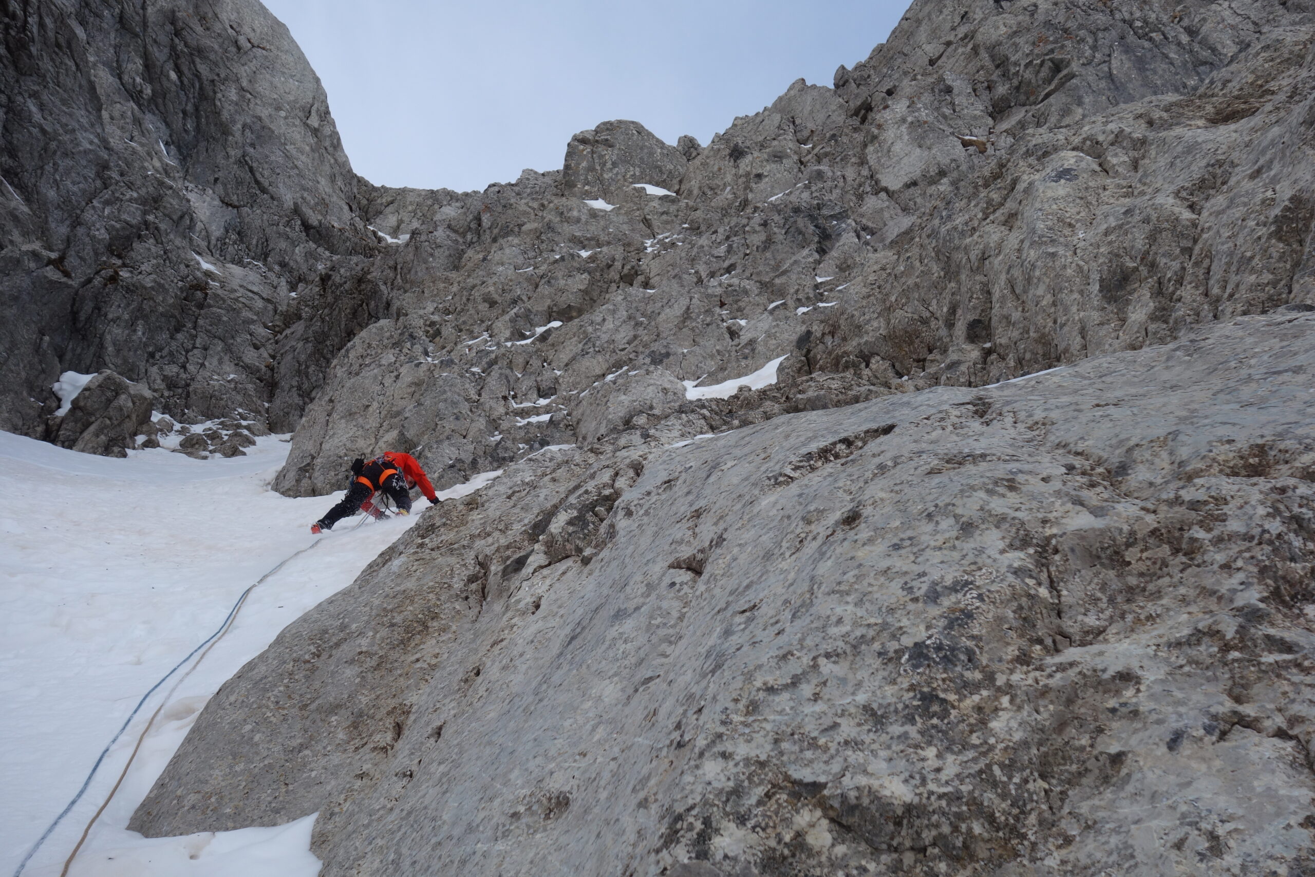 1.. Si attraversa a sinistra su cengia nevosa per 50m, 2 anelli.