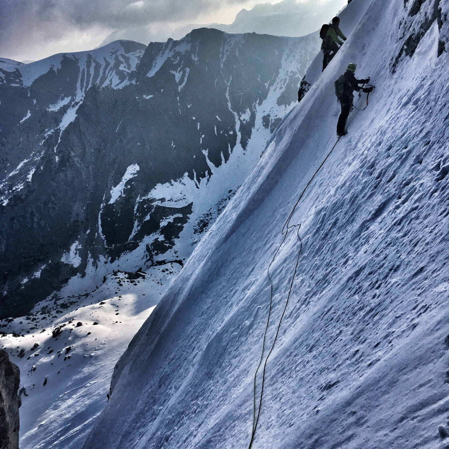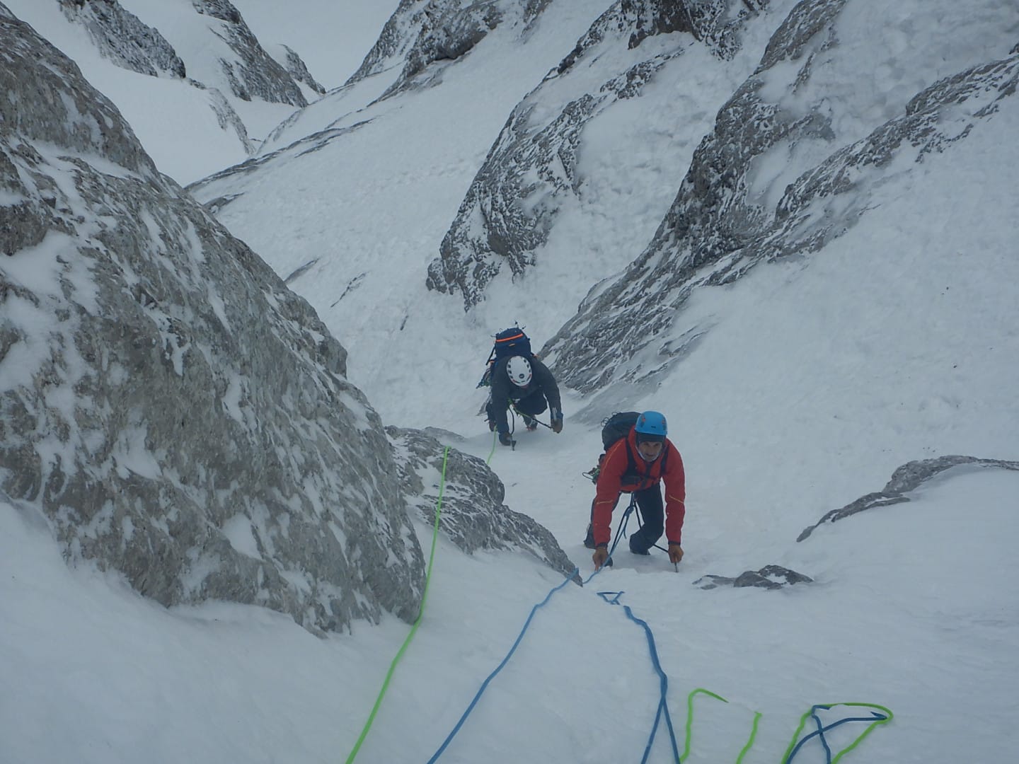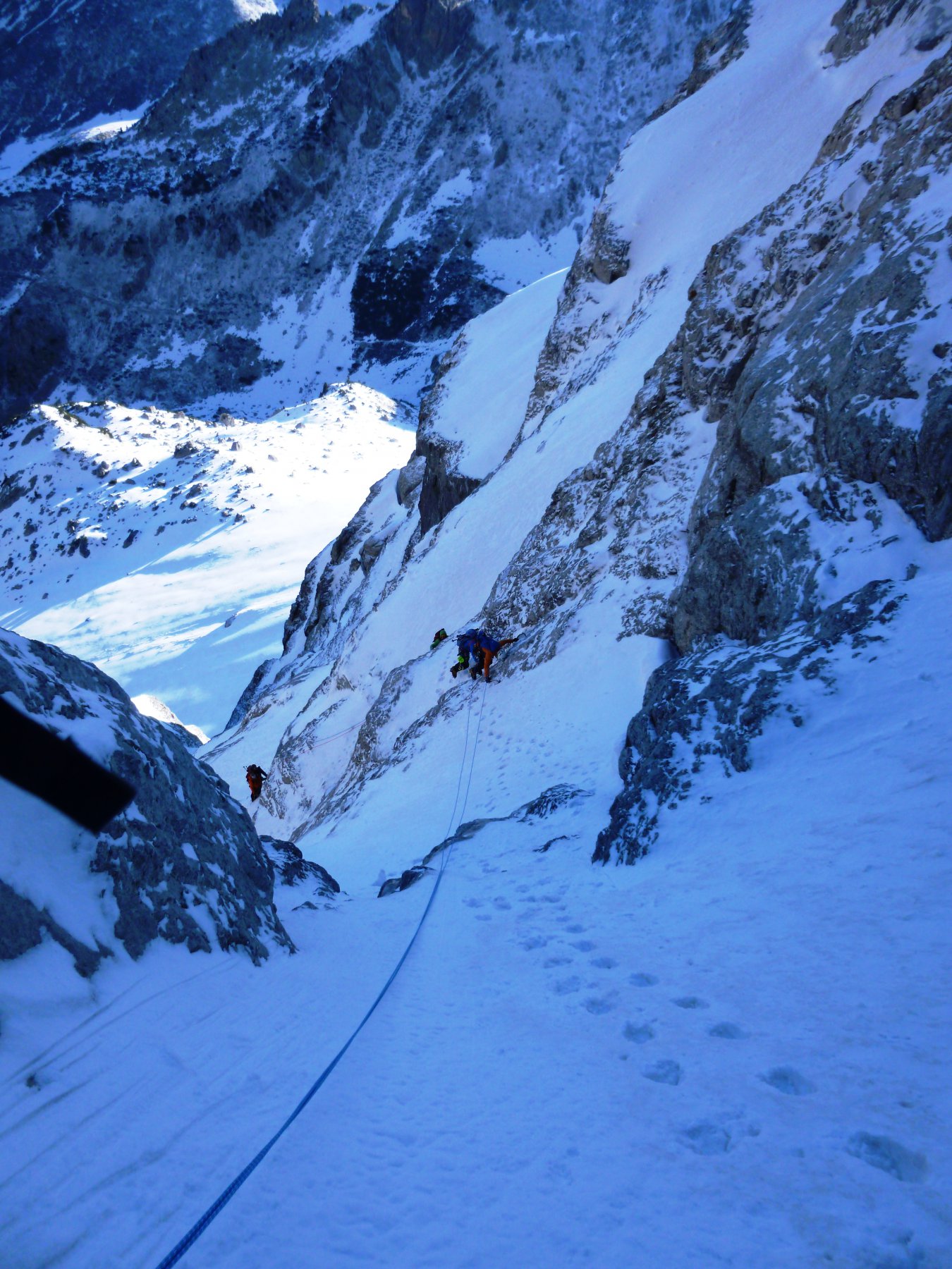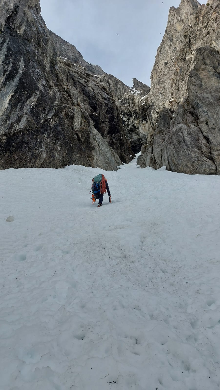 1.. Si attraversa a sinistra su cengia nevosa per 50m, 2 anelli.