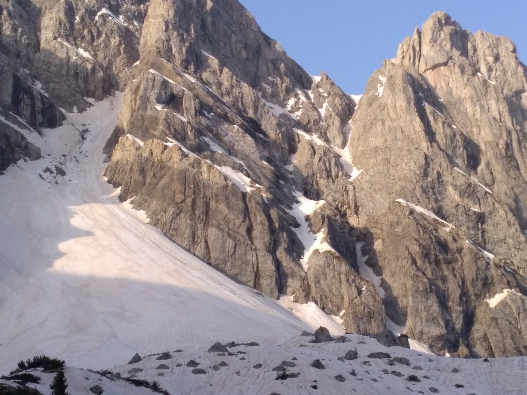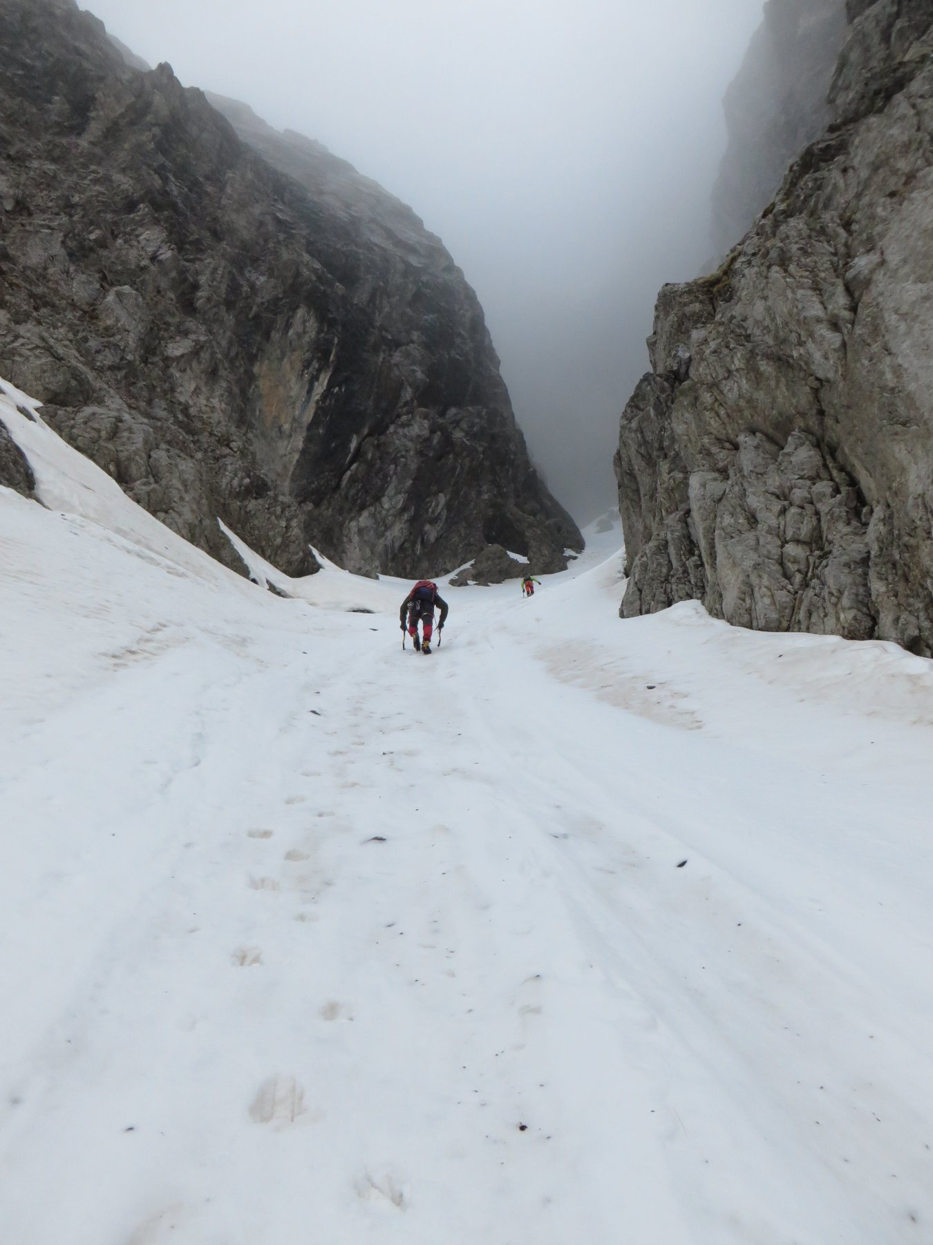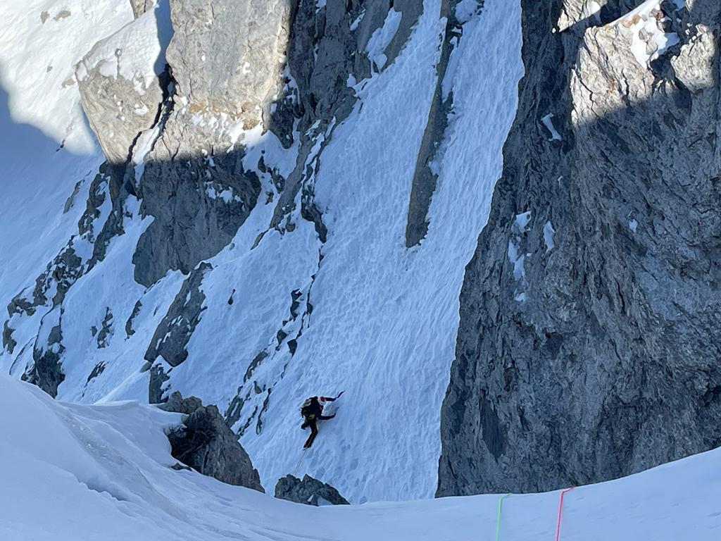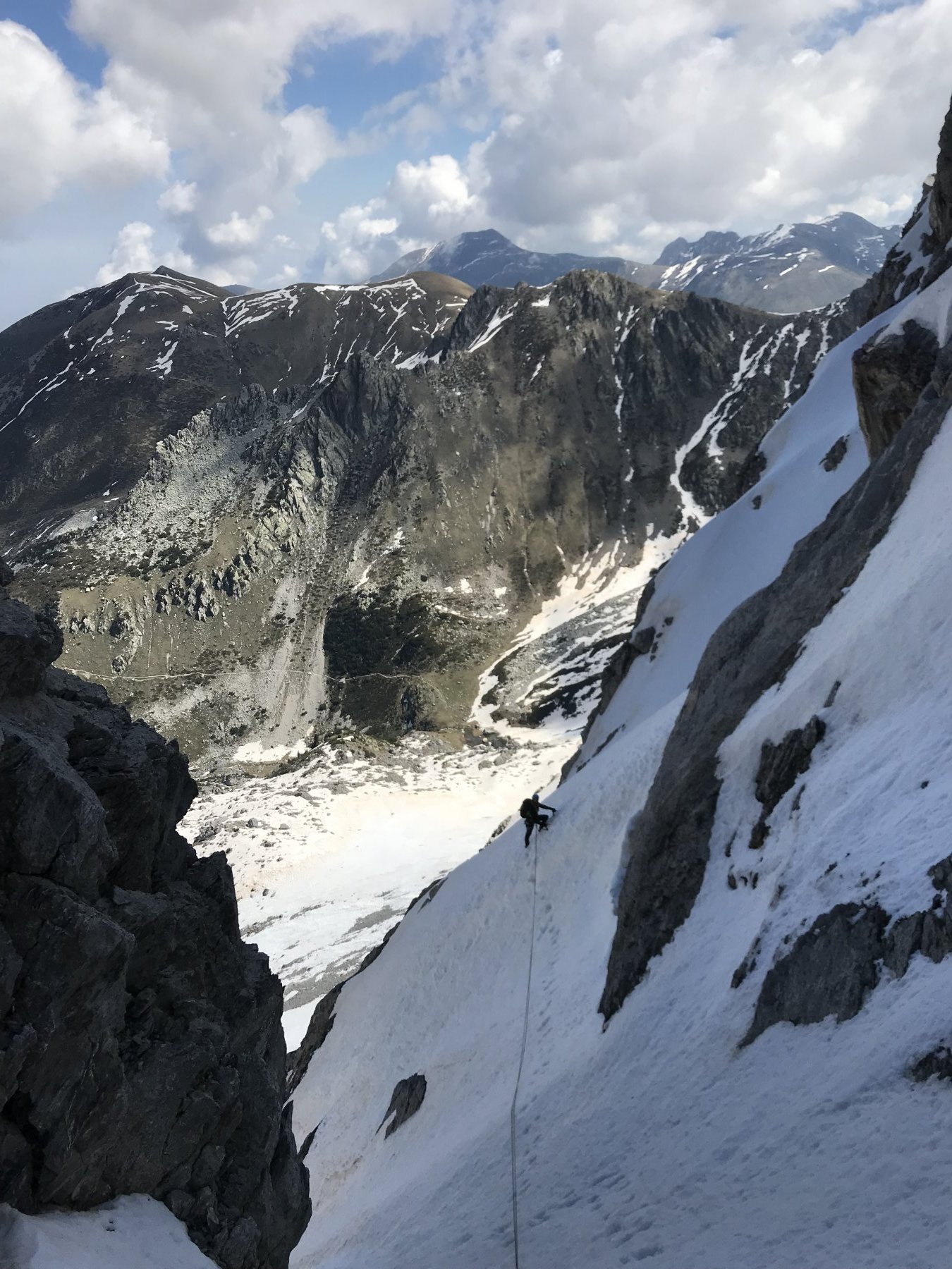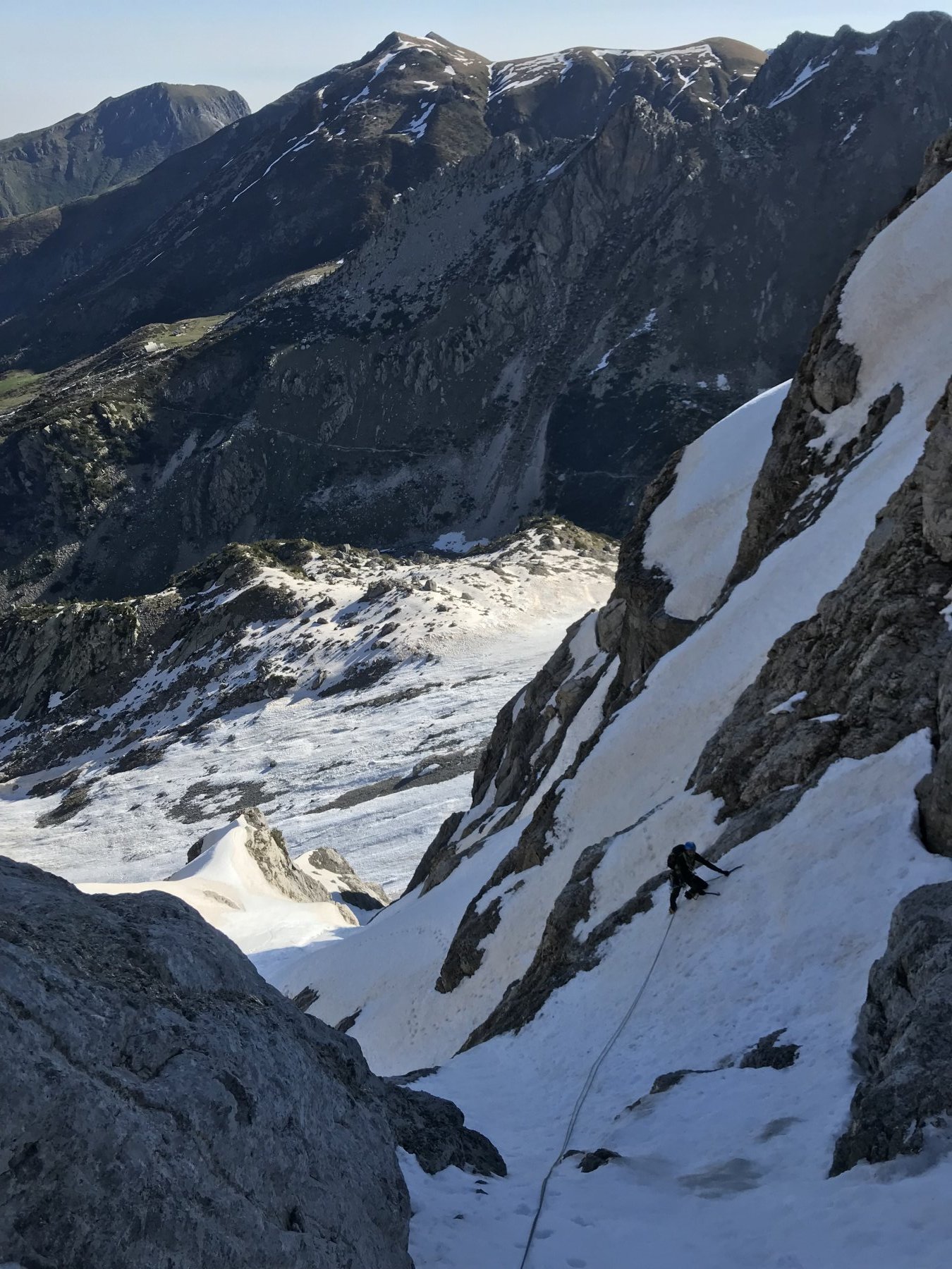 1.. Si attraversa a sinistra su cengia nevosa per 50m, 2 anelli.