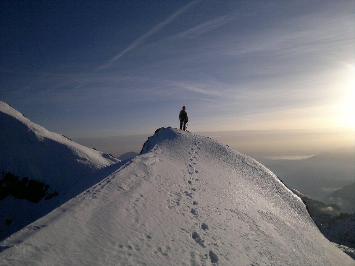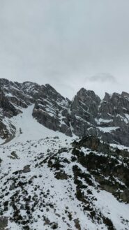 5.. Si prosegue sulla spalla nevosa fino ad un risalto di rocce alto una ventina di metri, 50m 2 anelli.