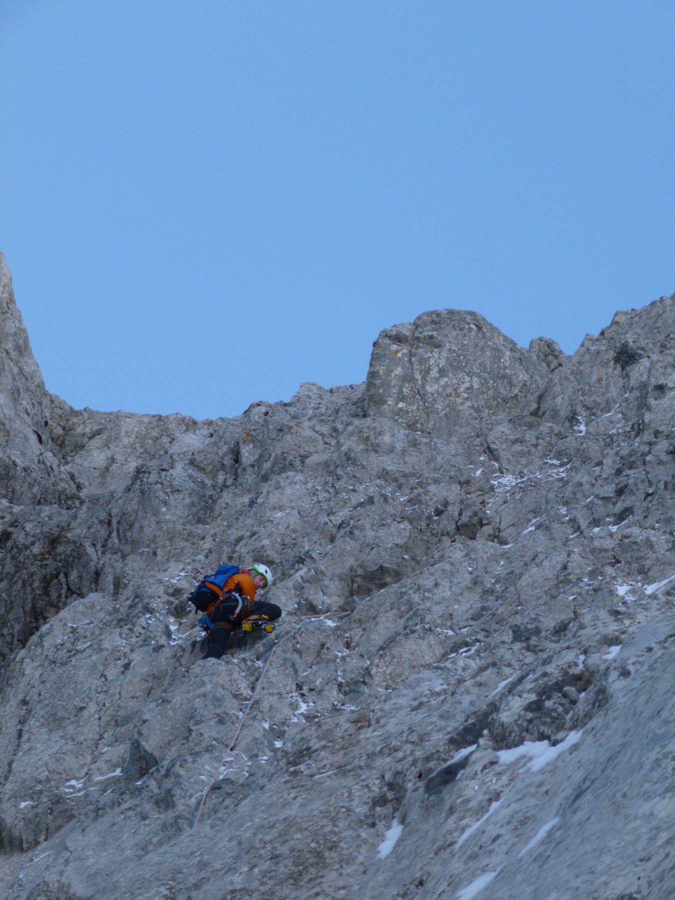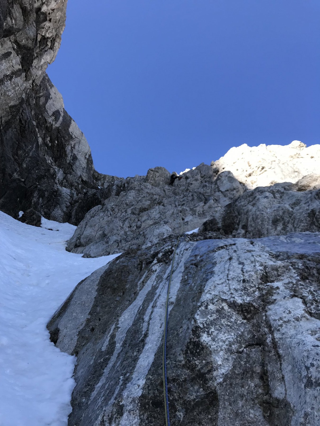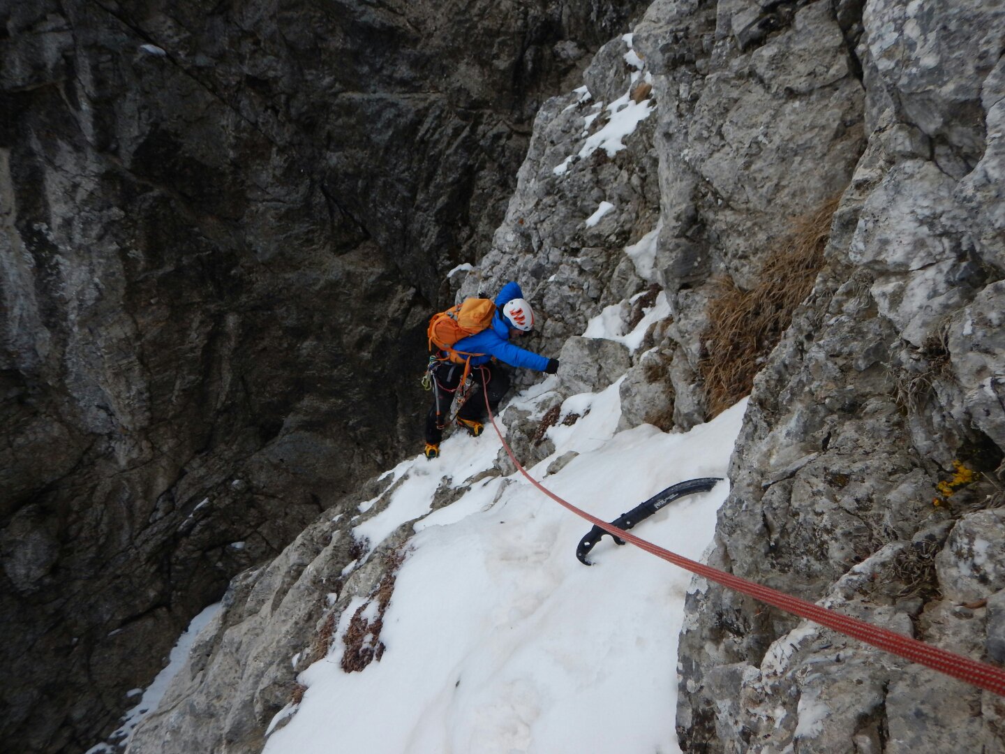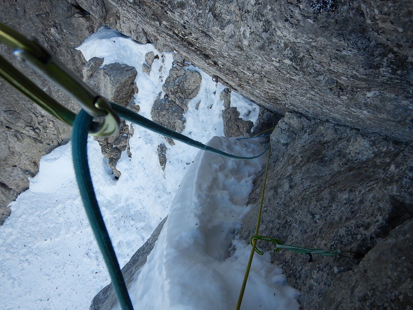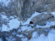 2.. Ancora a sinistra per qualche metro poi dritti su placca rocciosa coperta di neve fino ad un terrazzino, 30m 2 anelli.