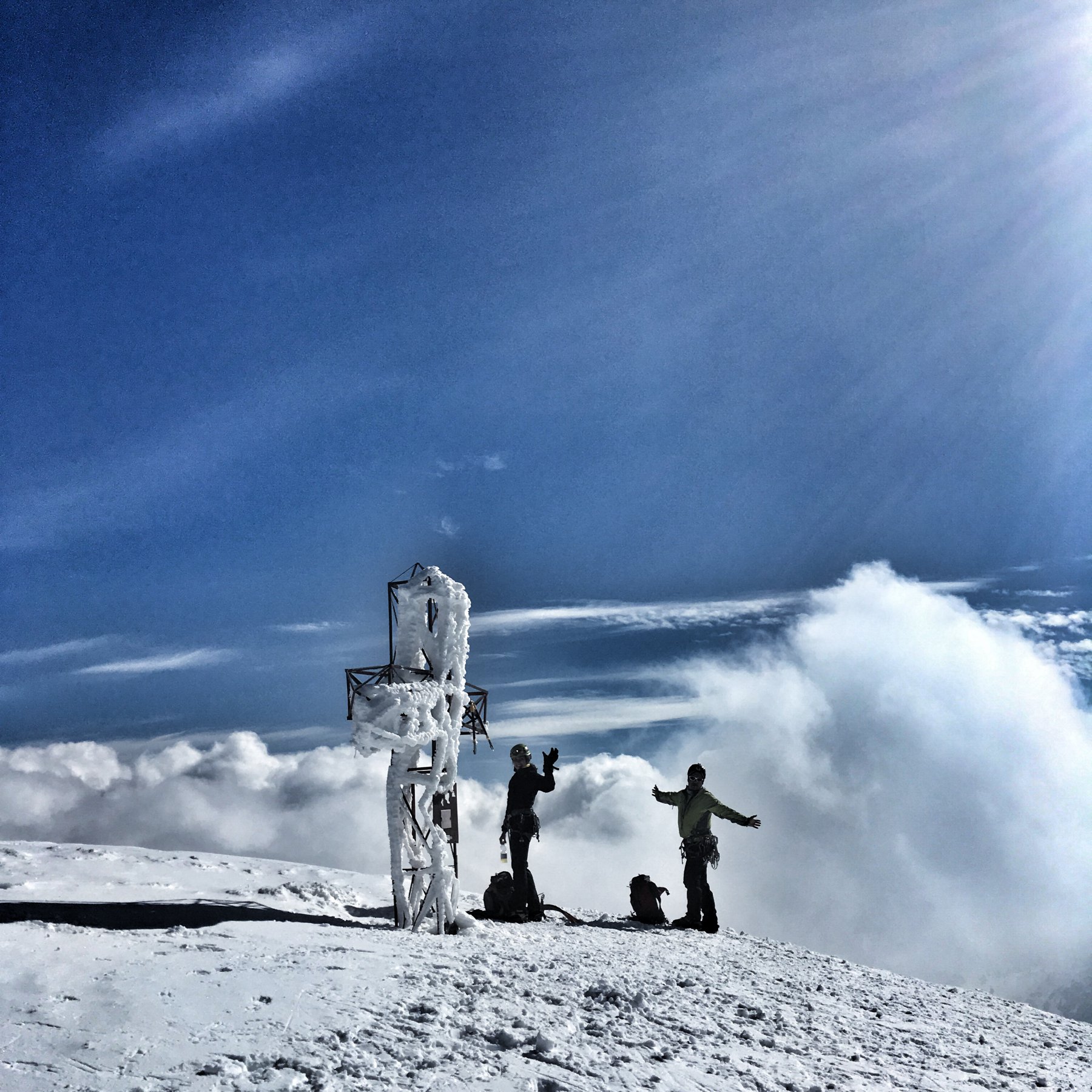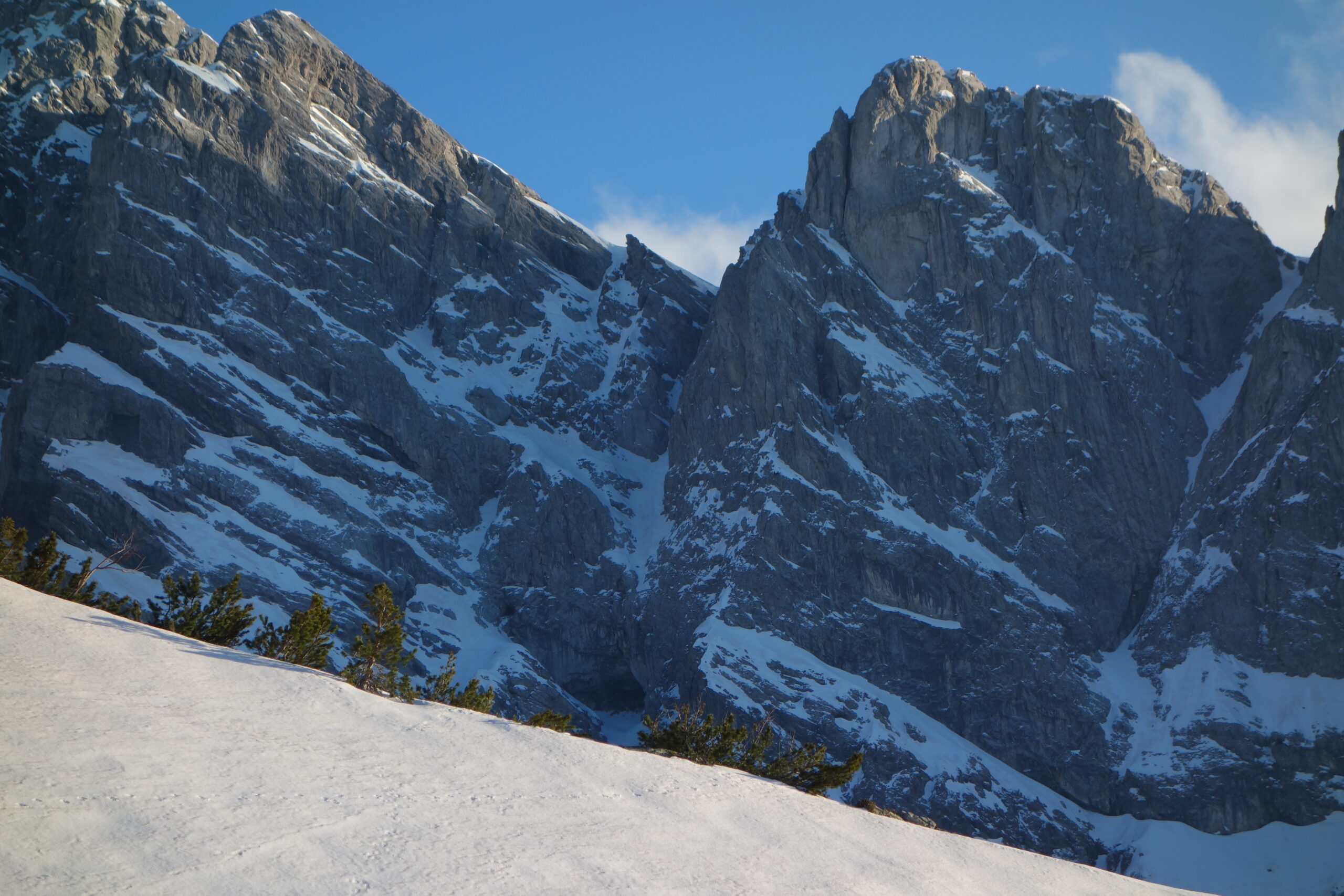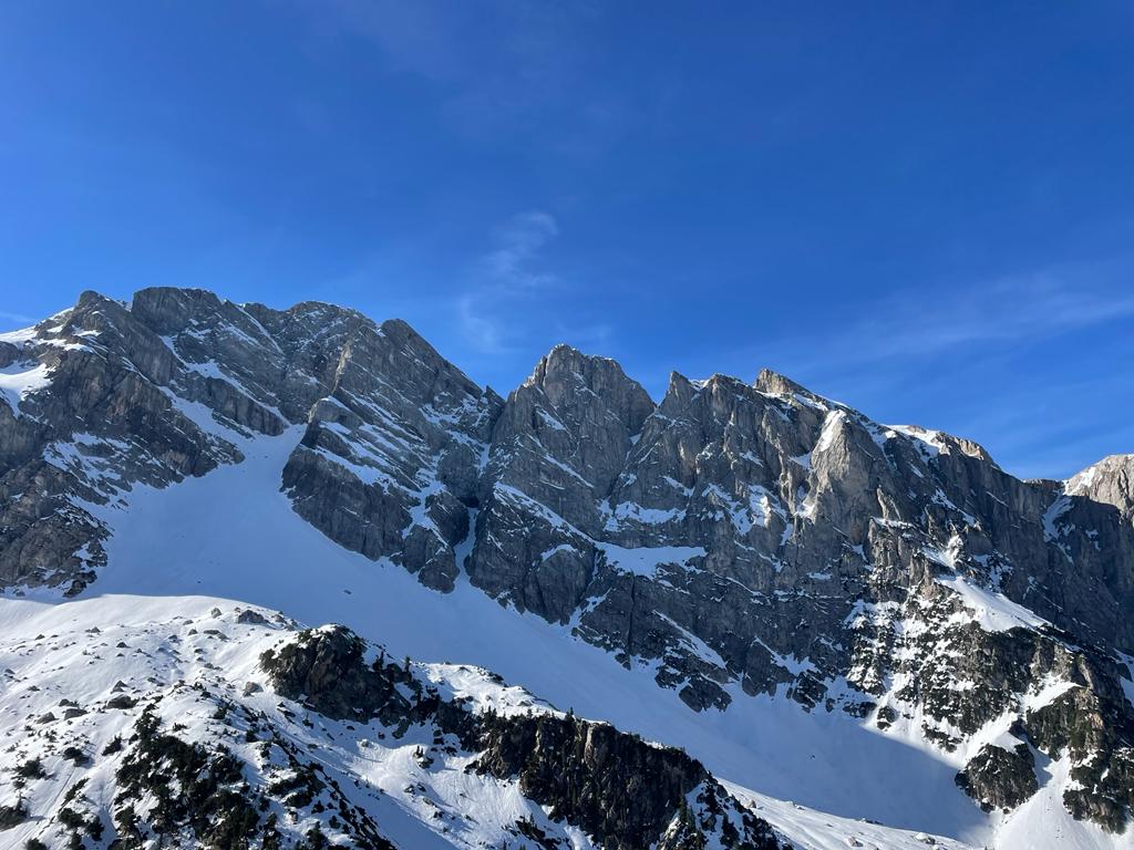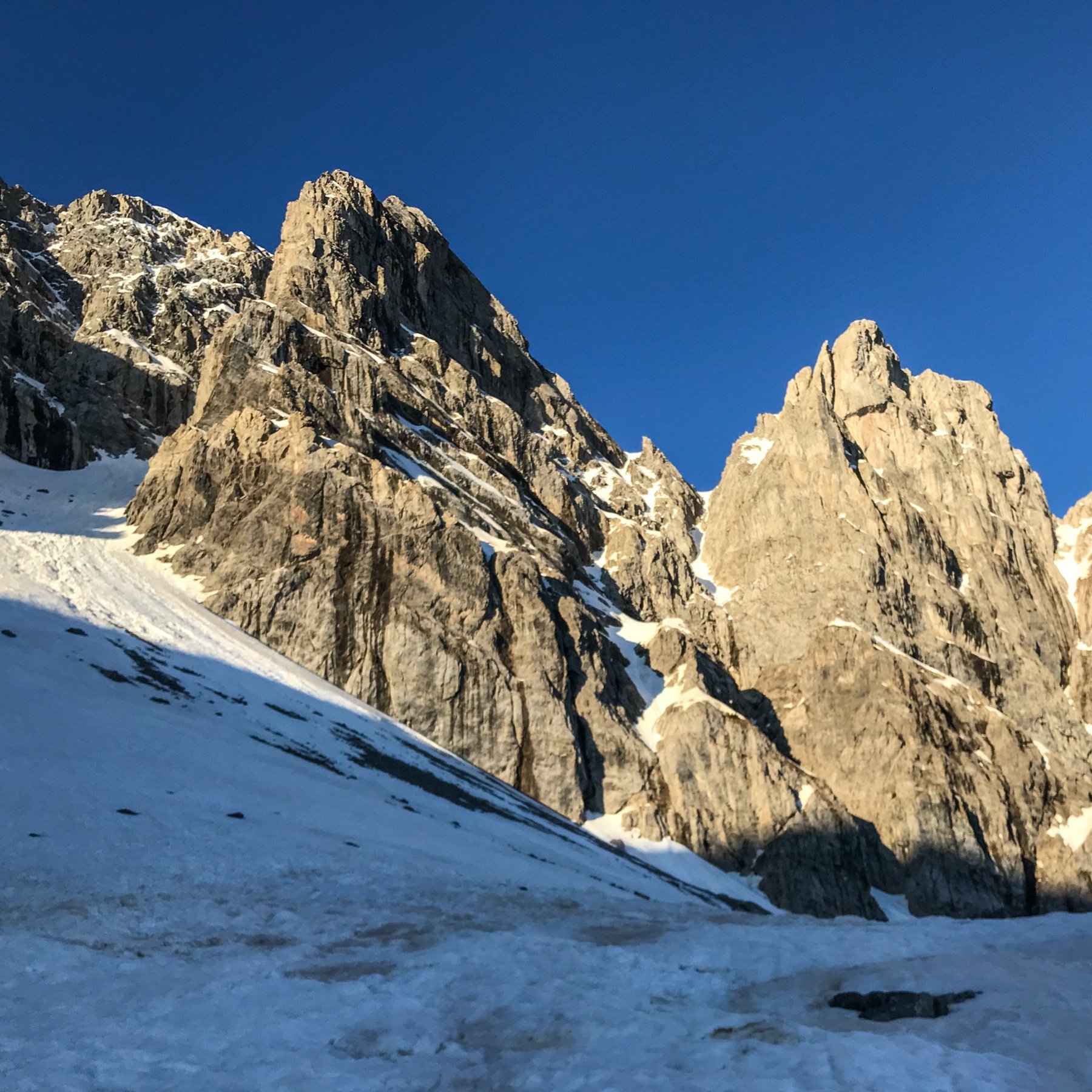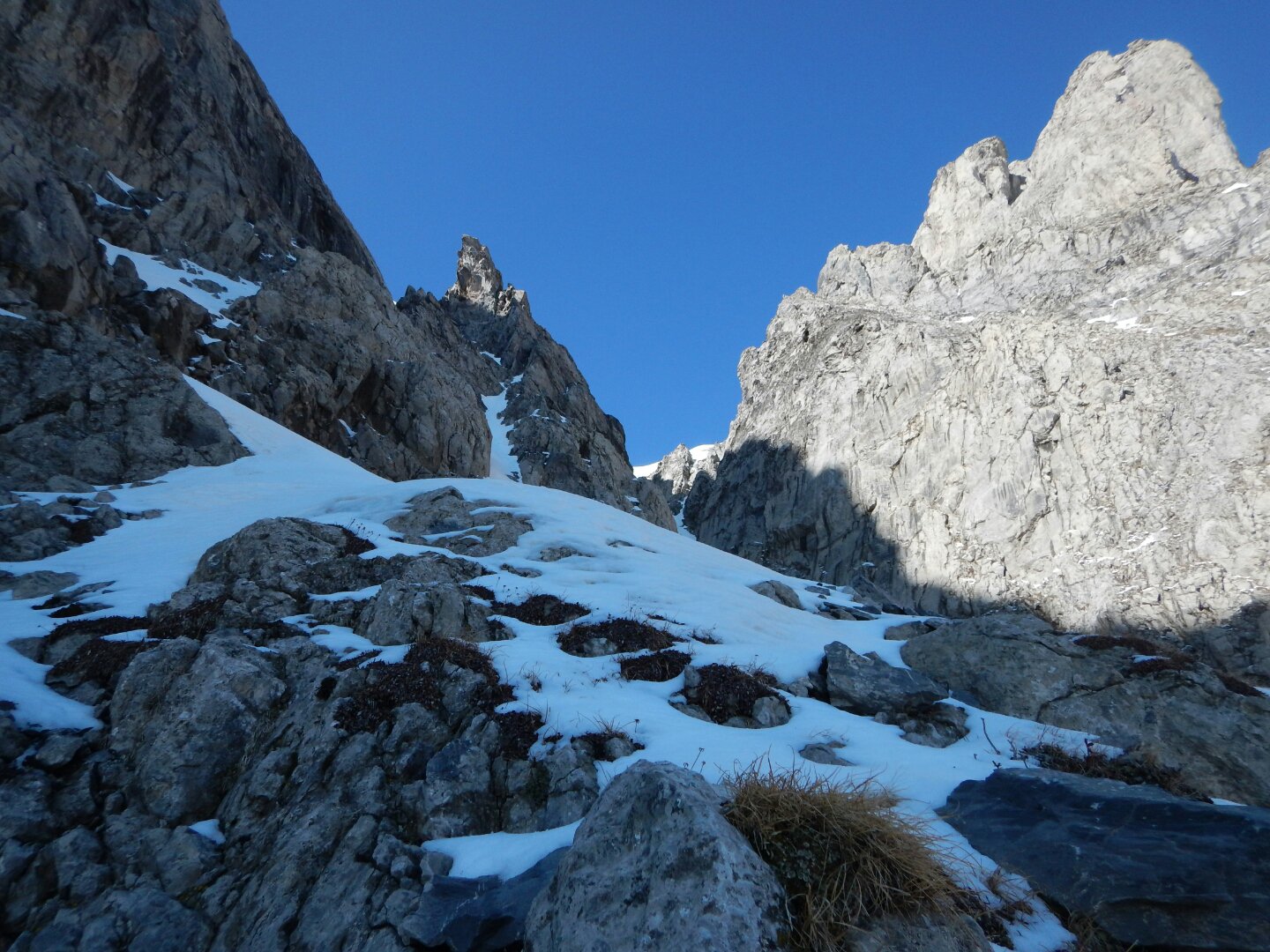 dall’uscita non puntare direttamente alla prima cima di sx (Punta Tino Prato) ma puntare tra la centrale e la terza (quella più a dx) camminando su detriti e neve.