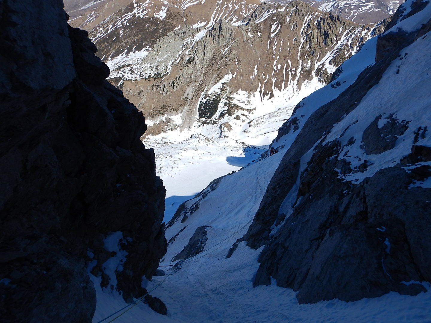 9.. Superando un paio di strozzature si raggiunge il colle, 50m 2 anelli sulla placca a sinistra del canale.