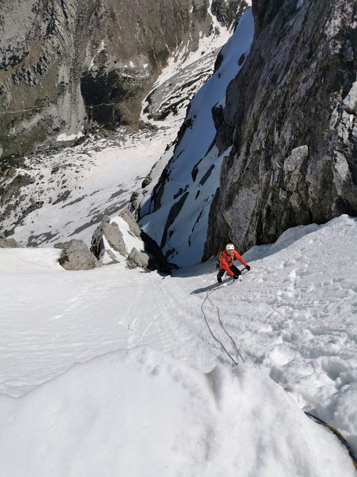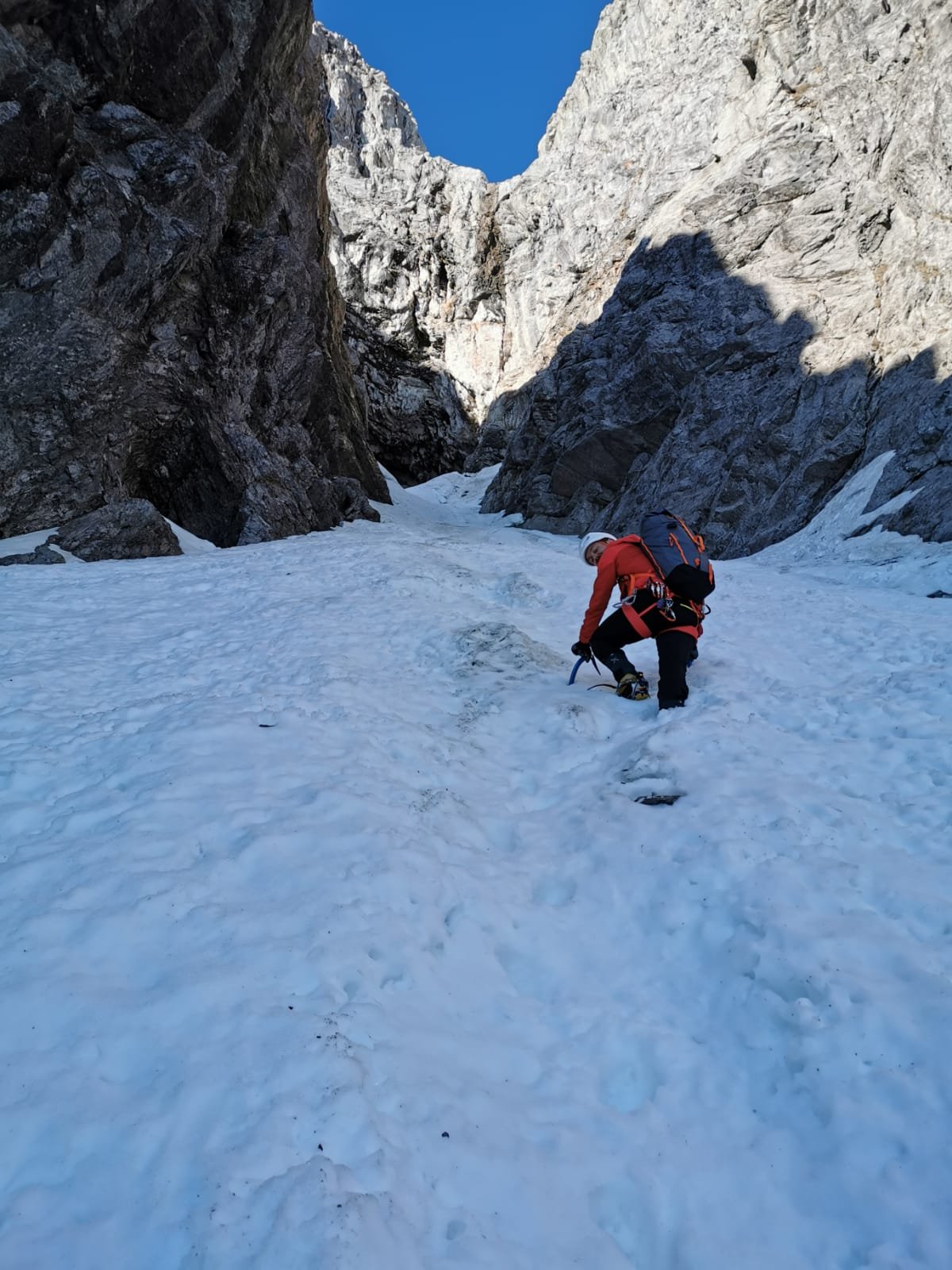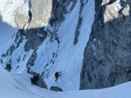 8.. Si attraversa il ripido nevaio orizzontalmente verso destra e si entra nell’ultimo canalino, 50m 2 anelli sulla destra del canale.