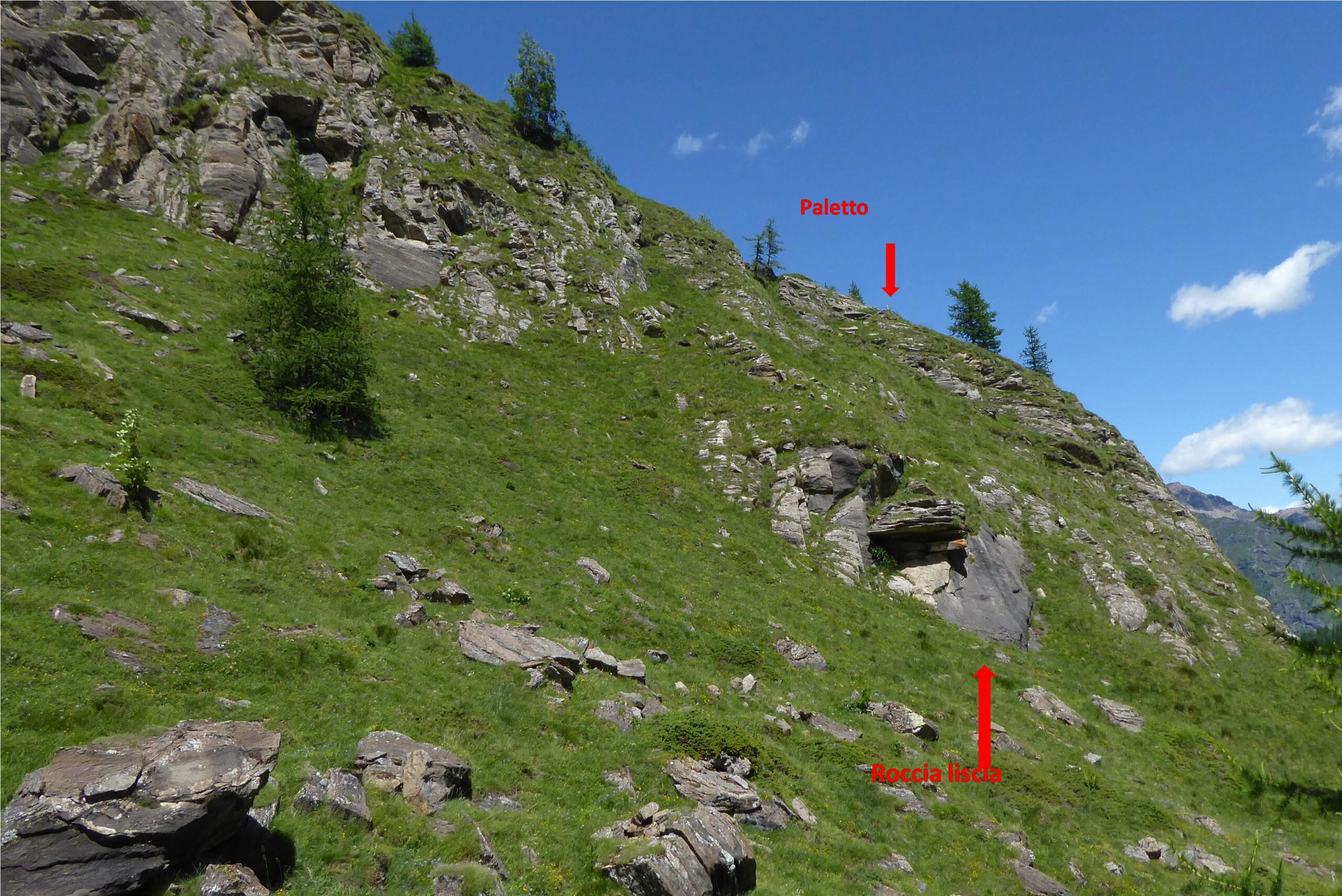 Dal Pian Lunella attraversare il corso d’acqua e puntare verso un roccione con alla base i resti di una baracca, che era usata dai minatori della zona. A destra del roccione inizia una traccia individuata da sbiaditi segni rossi. La si segue in traverso verso sud fino a svoltare nel valloncello che porta al col Forcola. Si prosegue per poco fino a trovare a destra una roccia liscia verticale poco rilevata sul prato. In alto sulla dorsale si vede un paletto dipinto con segno bianco-rosso.