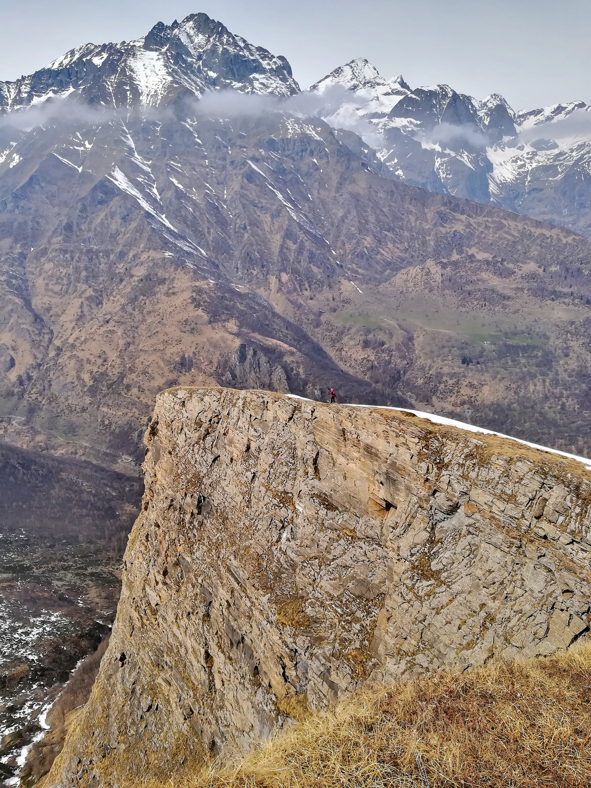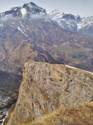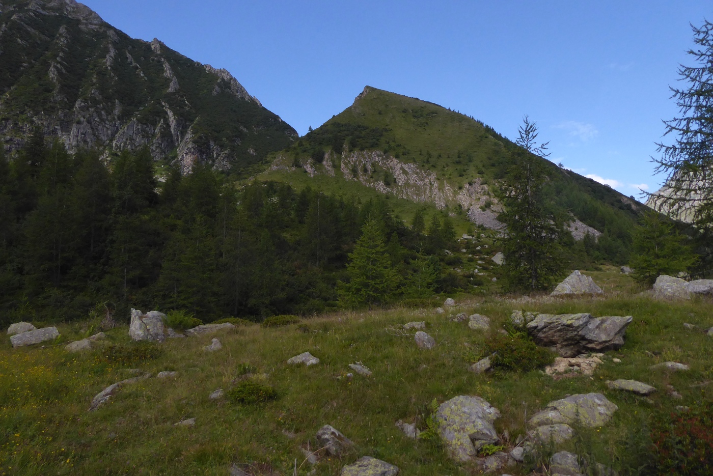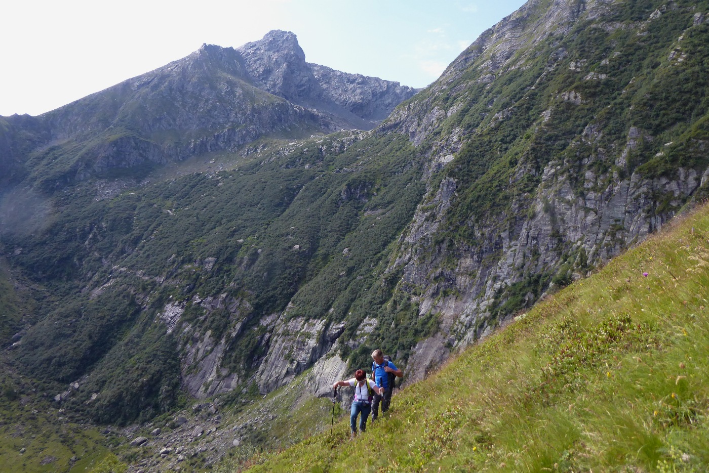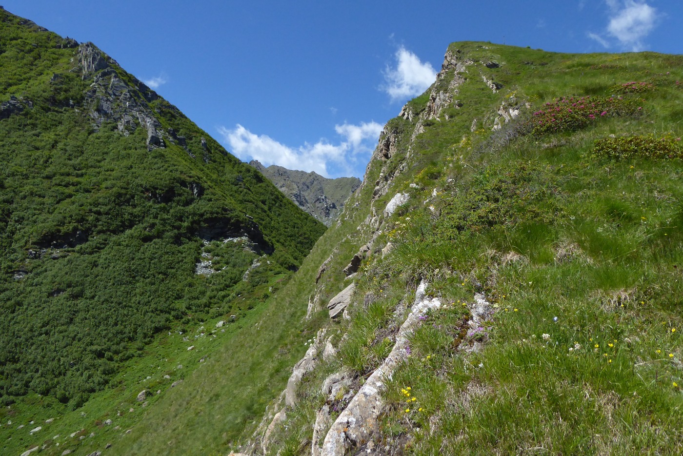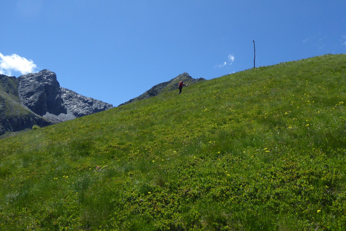 Si sale quindi al meglio puntando al paletto su lieve traccia. Raggiunto il paletto si prosegue tenendosi quasi sul bordo della parete che scende nel valloncello, guidati da altri paletti e segni sulle pietre, fino a raggiungere nei prati la vetta, contraddistinta da un alto palo con libro di vetta.