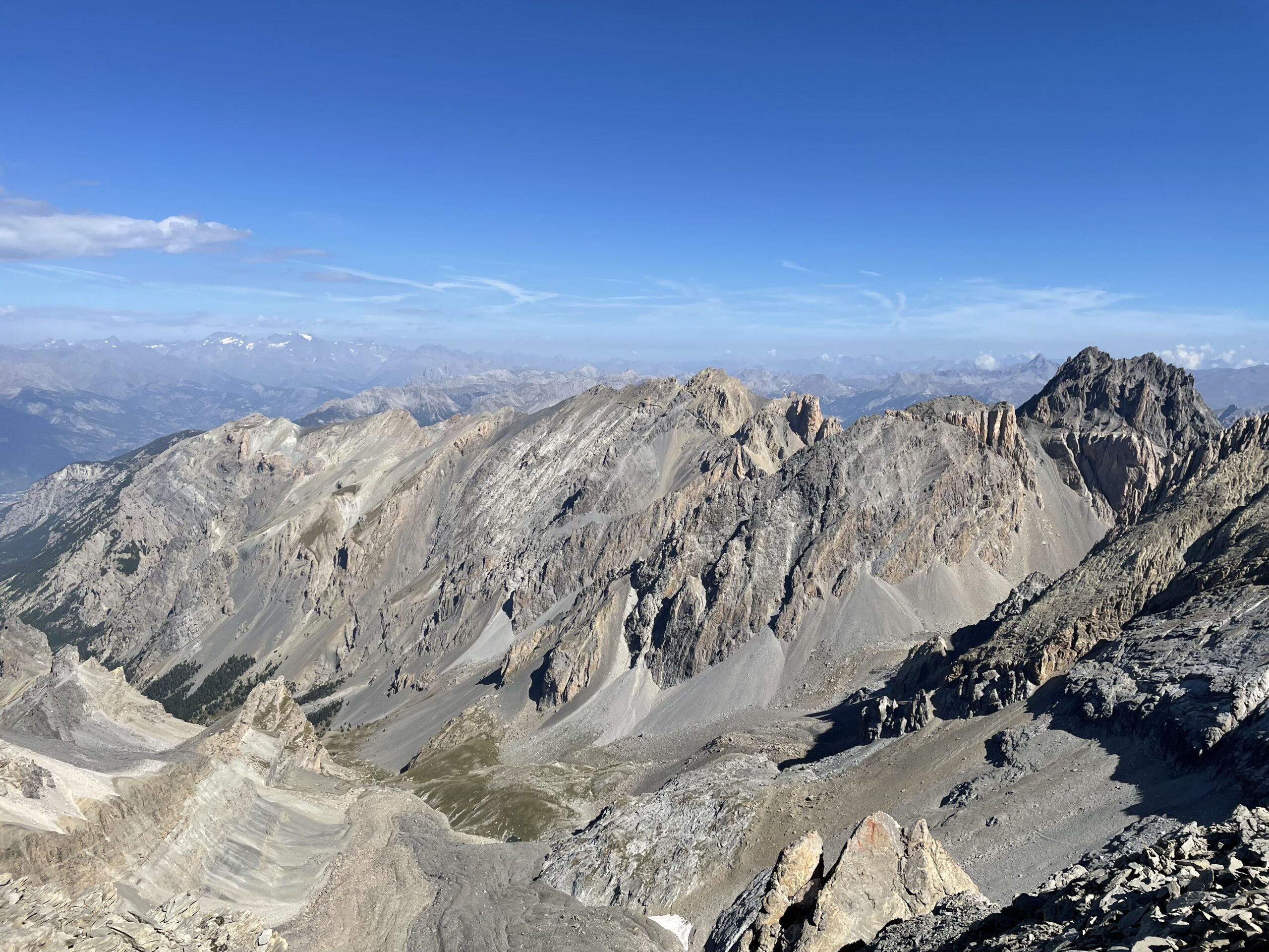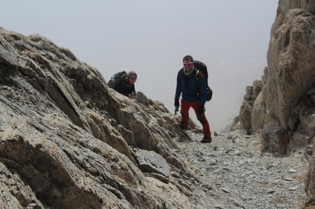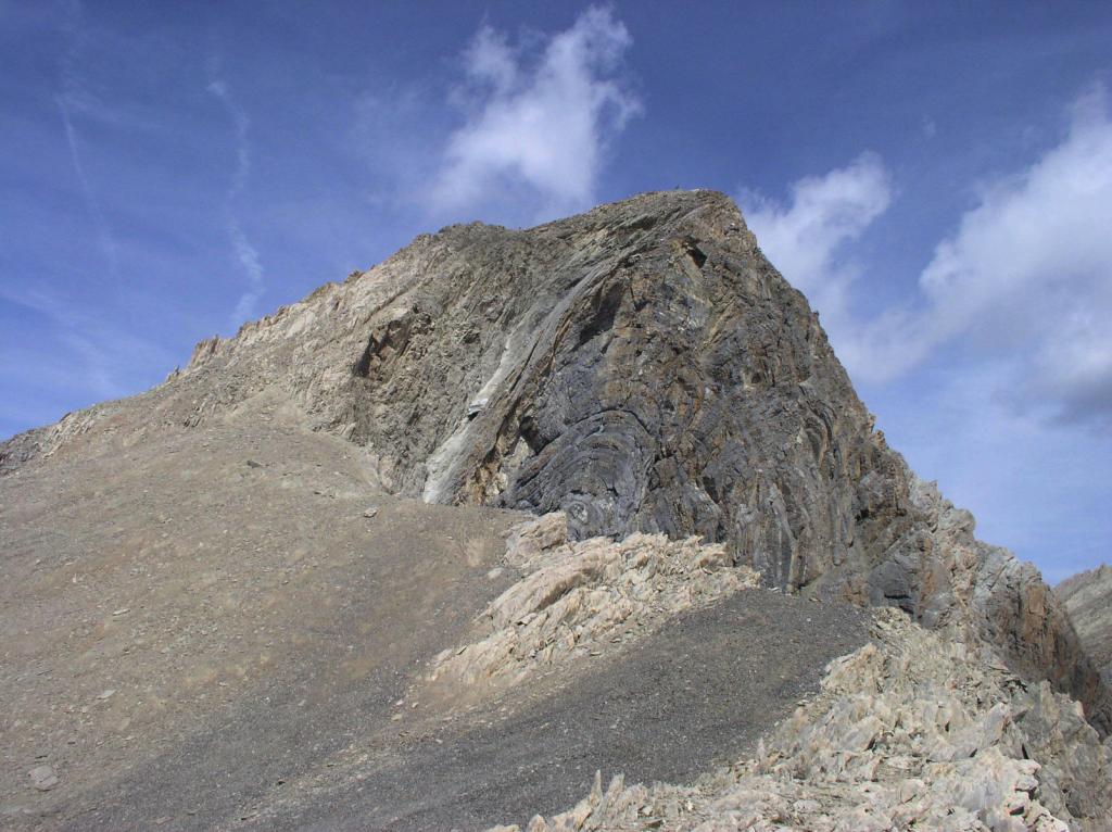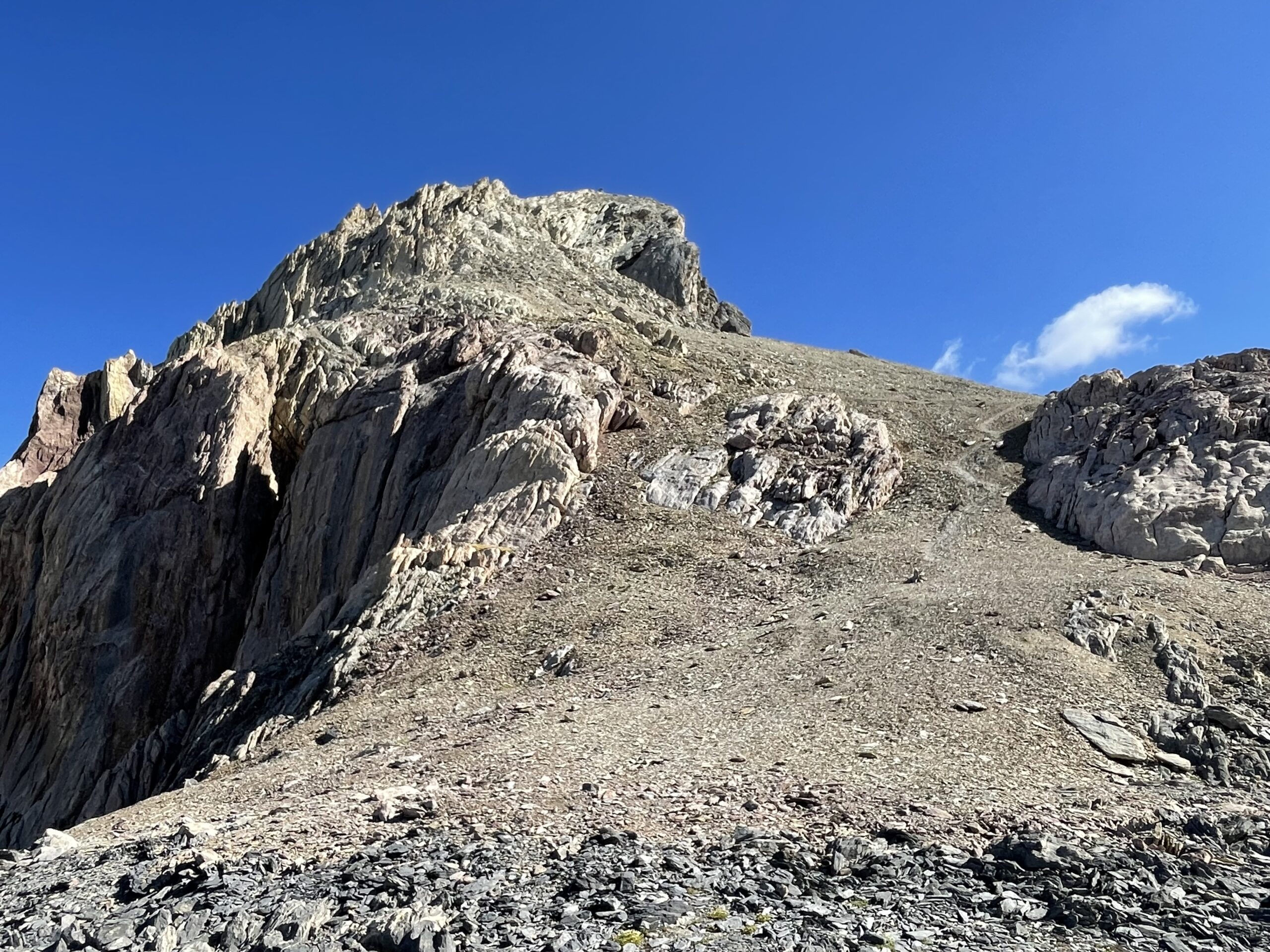 Dal passo si volge decisamente a sinistra salendo l’ampia cresta Sud, inizialmente agevole, si supera una prima breve fascia rocciosa e poi il terreno inizia a farsi più ripido arrivando sotto il tratto terminale della cresta. Qui si trovano due canalini posti tra nervature e costoni rocciosi, si sale preferibilmente per il canalino di sinistra, ripido e abbastanza stretto, ma con buone prese per le mani (quello di destra è molto più sfasciato, faticoso ed esposto verso la parete che scende sul versante rivolto verso Maljasset).