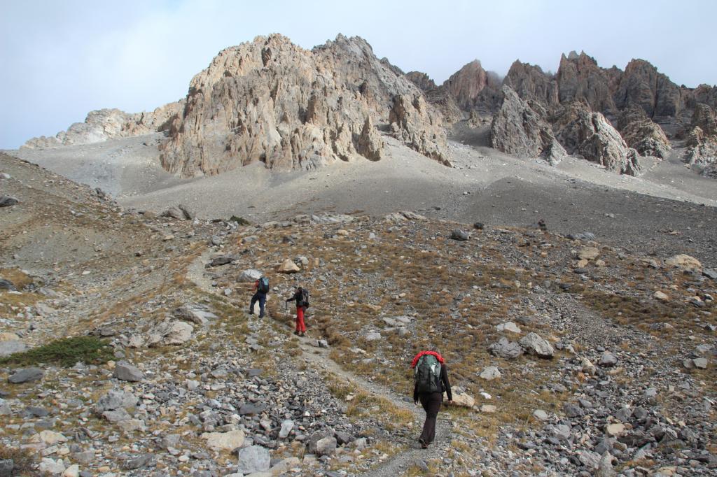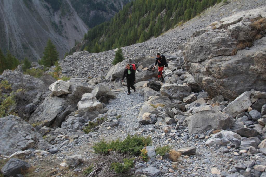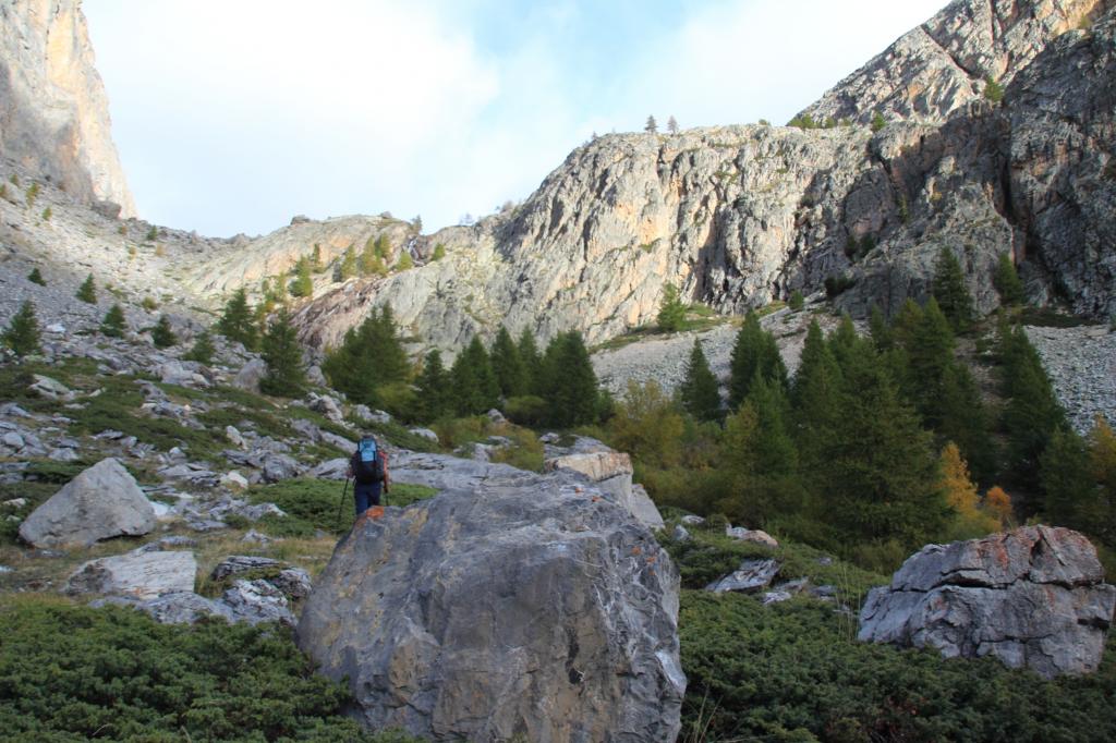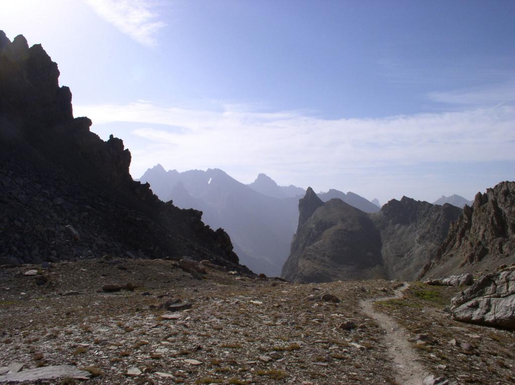 Il sentiero prende quota abbastanza rapidamente, salendo verso destra si esce dal bosco e si prosegue in un tratto cosparso da grossi pietroni e blocchi rocciosi, entrando in una conca a quota 2275 m. quasi pianeggiante posta tra le cime del Sommet Rouge (a sinistra) e la Tete du Sanglier (a destra). Il Vallon des Houerts ora diventa decisamente più ampio, Il sentiero prosegue verso destra, superando un breve pianoro erboso, qui si trova la breve deviazione che sulla sinistra conduce al piccolo ricovero, nota come Cabane de Houerts m. 2300. Superato il pianoro erboso si entra nella parte di vallone che è veramente “lunare”, grandi chine detritiche, dove però sale sempre il sentiero che rimane agevole (sempre segnalato da segnavia biancorossi e ometti).