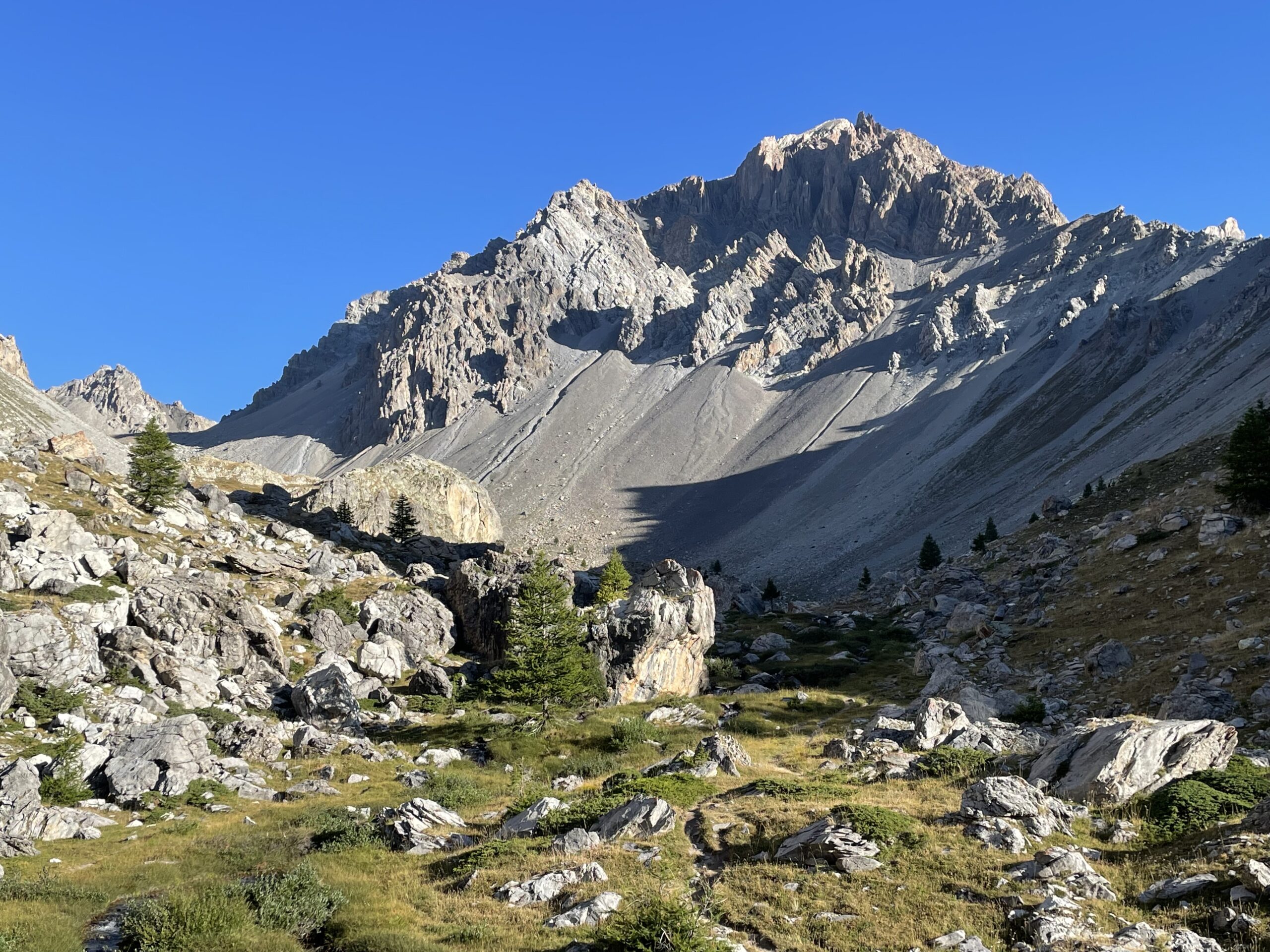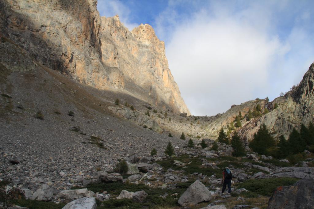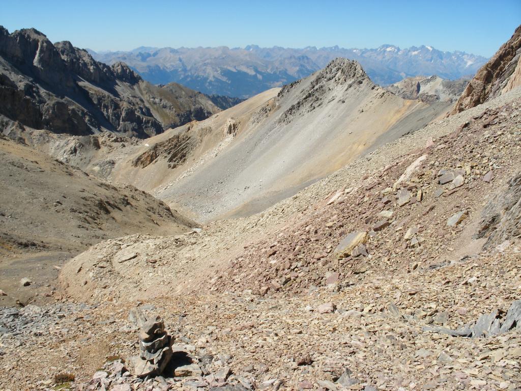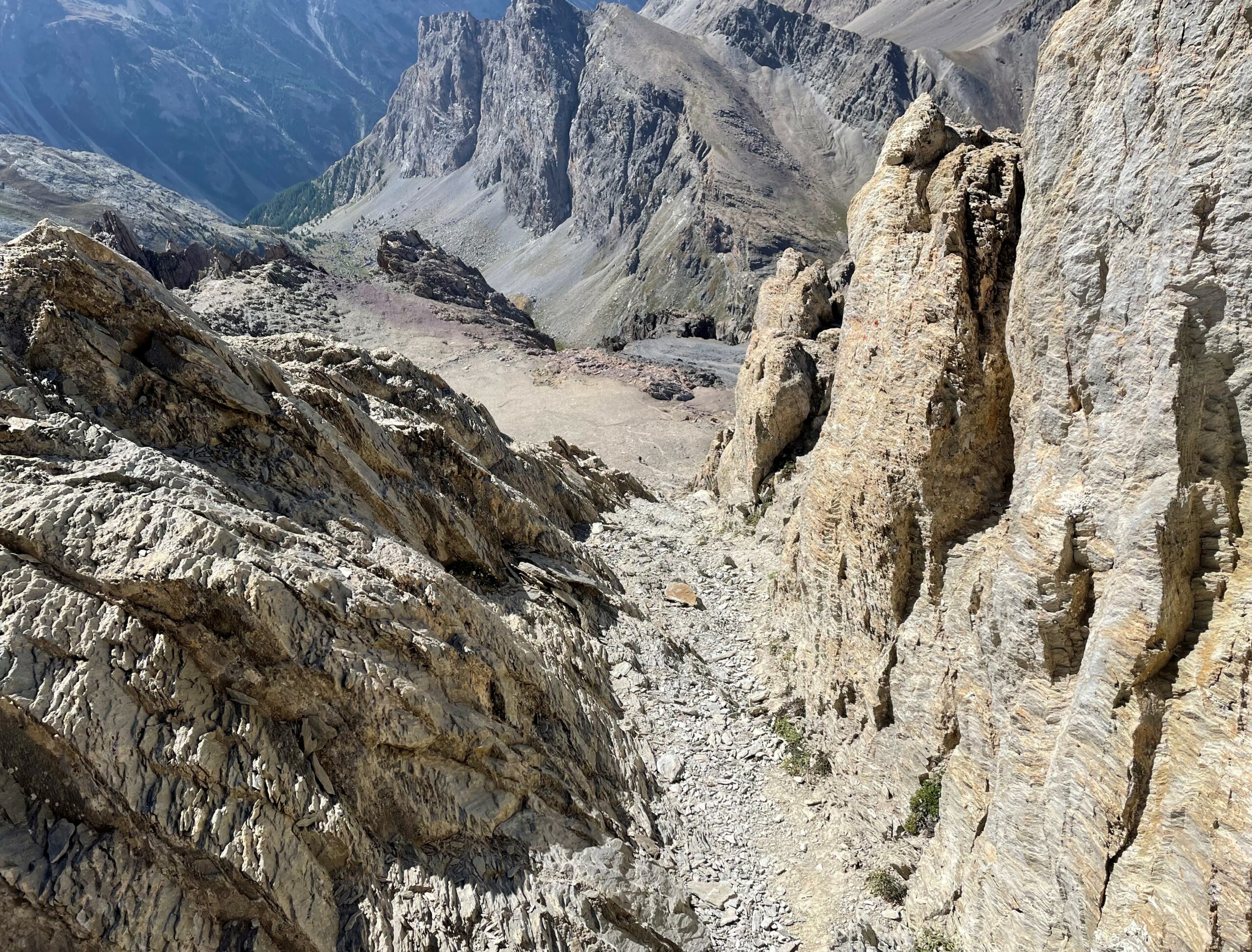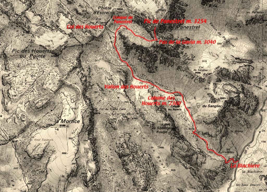 Segue una ripida rampa detritica che consente di prendere gradualmente quota, salendo sul lato destro del vallone, a quota 2650 m. si trascura un sentiero che si stacca sulla sinistra e porta ai Laghi Vert e Bleu e si risale la china detritica di destra puntando all’ampia conca sottostante il circo terminale che conduce al Col des Houerts. Raggiunto l’ampia conca, si tralascia il sentiero di sinistra che conduce al colle e si piega a destra su una traccia di sentiero (freccia di vernice rossa e ometto) che contorna uno sperone roccioso entrando nel vallone sospeso e nascosto, la Conque de Panestrel.