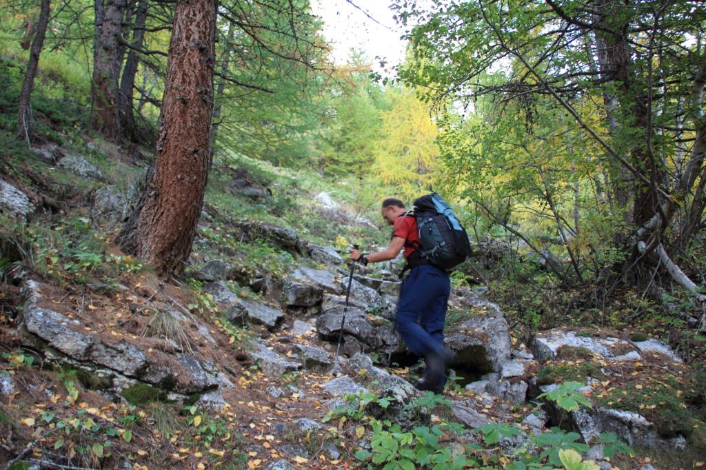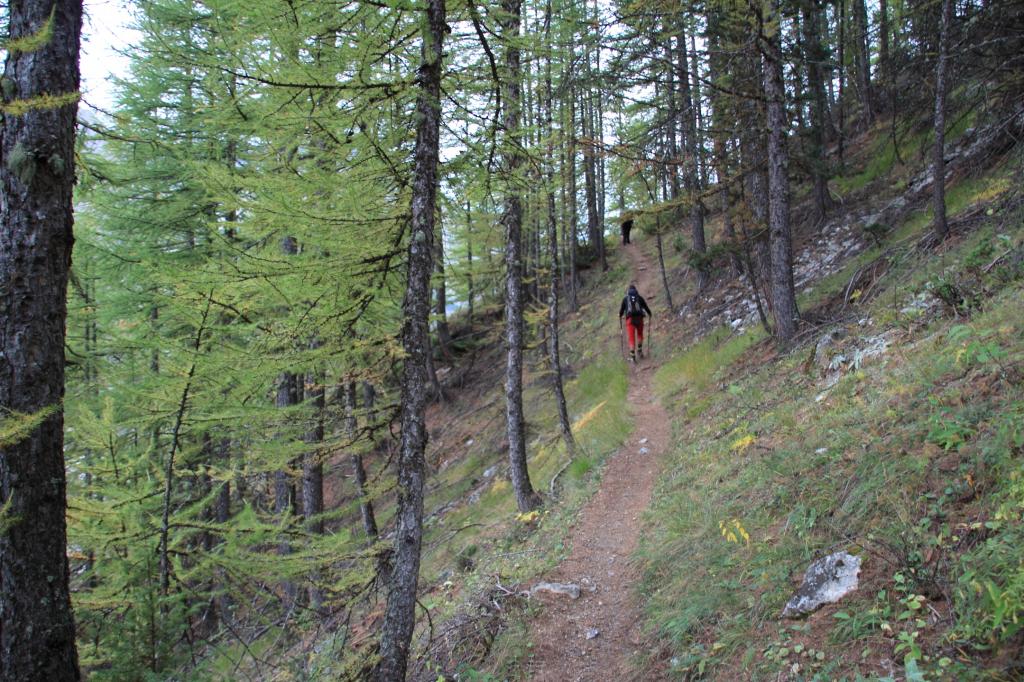 Dal parcheggio si ritorna brevemente indietro (verso S. Paul) fino al cartello indicatore in legno (indicazioni per il Col des Houerts). Il sentiero sale subito con una fitta serie di serpentine su terreno abbastanza ripido ma non malagevole, nel fitto bosco di larici.