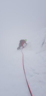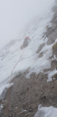 Si attacca sotto la verticale della vetta tenendosi alla sinistra di una evidente spalla di roccia, dove la salita originale si sarebbe dedicata ad una bela sezione di misto noi abbiamo dovuto deviare a sinistra causa delle deteriorate condizioni della neve e del ghiaccio.
