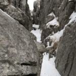 Con un traverso in diagonale ascendente, delicato solo nei primi metri in sali scendi, si entra in un caratteristico invaso dal quale partono altri due itinerari indipendenti “Jack mani di m***a” a sinistra e “Borra ghiacciata a destra”.