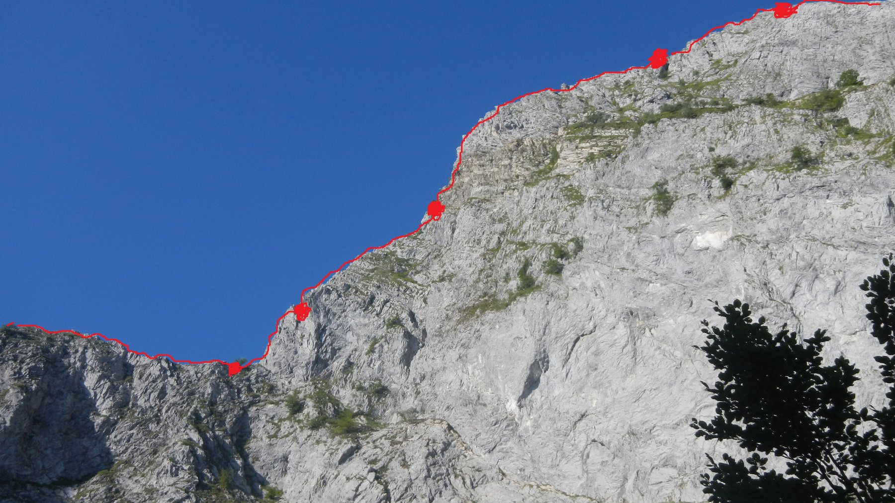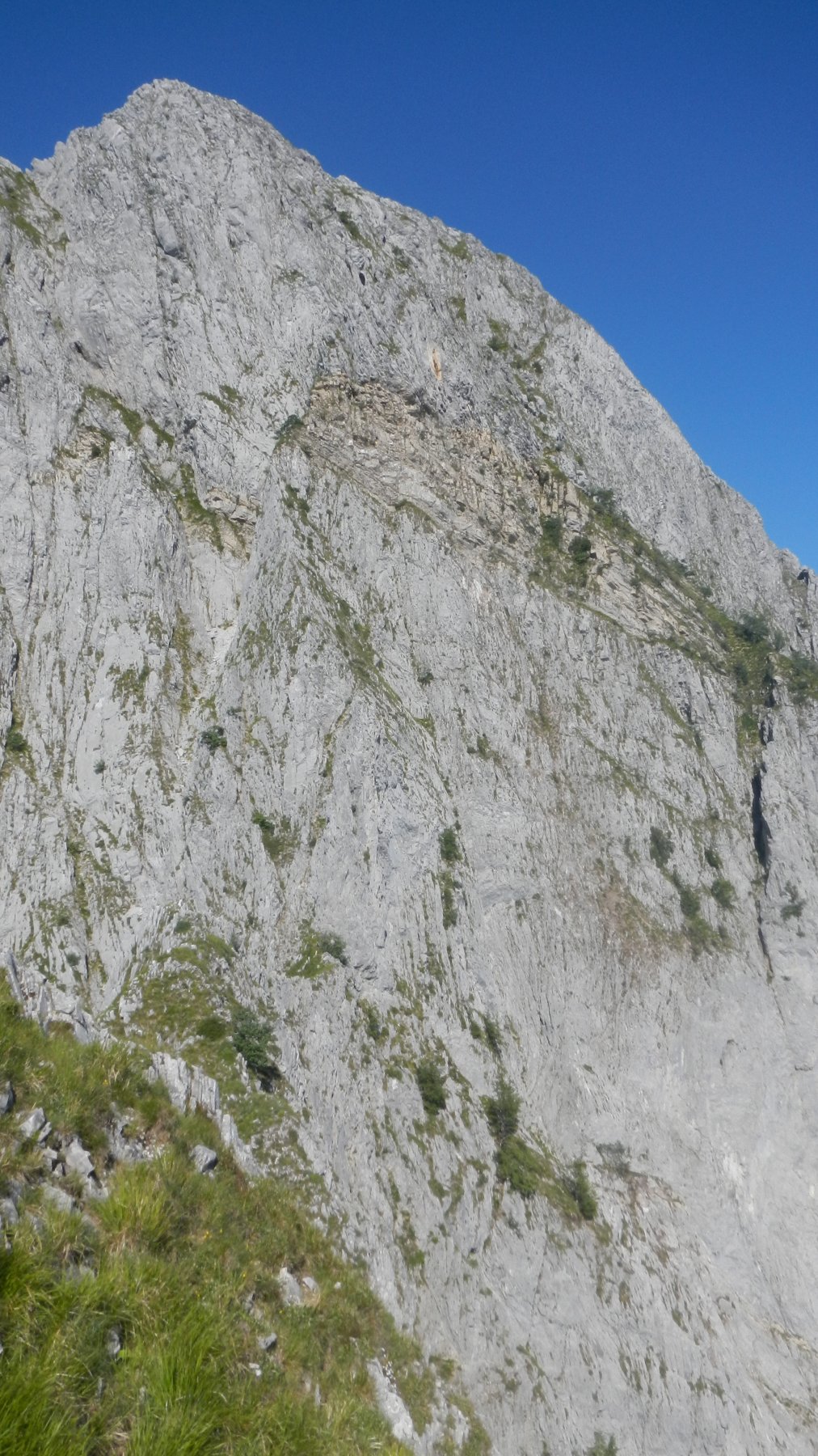 L3: Proseguire il filo di cresta e vincere un piccolo tratto verticale sulla sinistra attenzione rocce dubbie, passare in mezzo agli alberellie poi ritornare a destra e riprendere il filo della cresta attenzione grossi piastroni pericolanti salire verticalmente tra rocce ed erbe fino a raggiungere la sommità della cresta dove comincia a spianare qui allestire una sosta 60m IV.