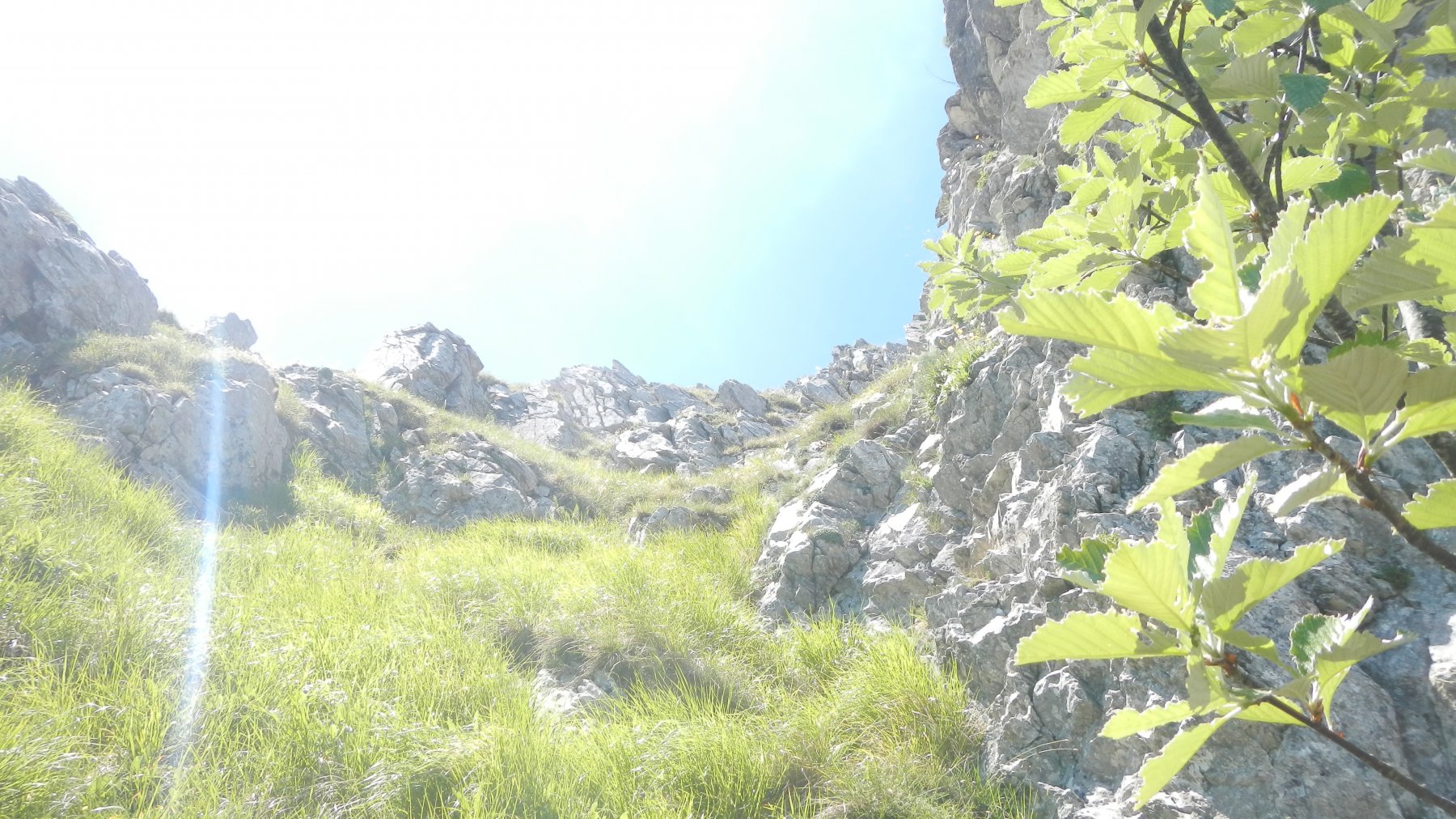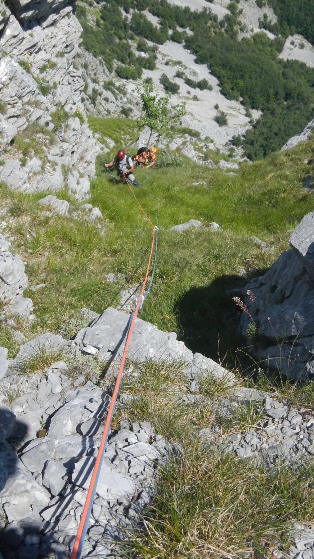 L6: da qui la via si ricongiunge con la via della parete nord est presente spit subito a destra dell’alberello e poco sotto una catena. Salire per ampio camino erboso,fino a trovare una sosta catena. 30 m II 3spit.