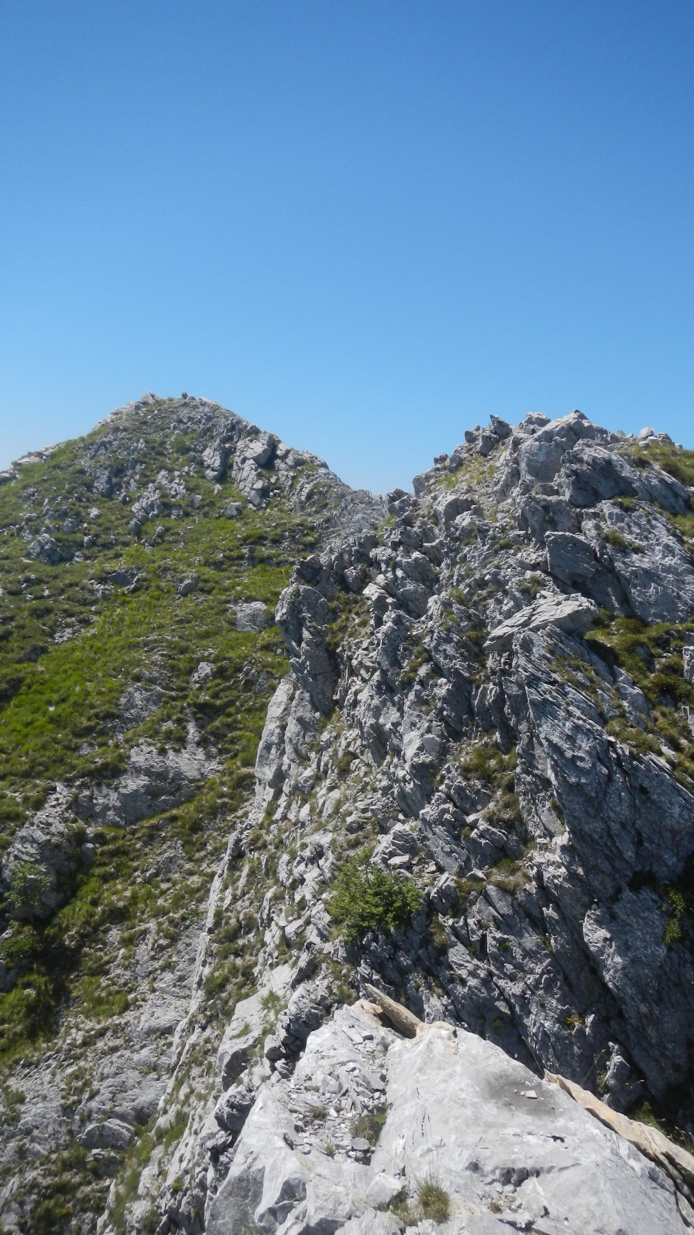 L2: salire a destra e riprendere il filo della cresta, si trovano un paio di vecchi cordini su spuntoni pericolanti ignorarli e proseguire poco più avanti e sostare su due grossi spuntoni stabili, sosta da allestire III 55m.