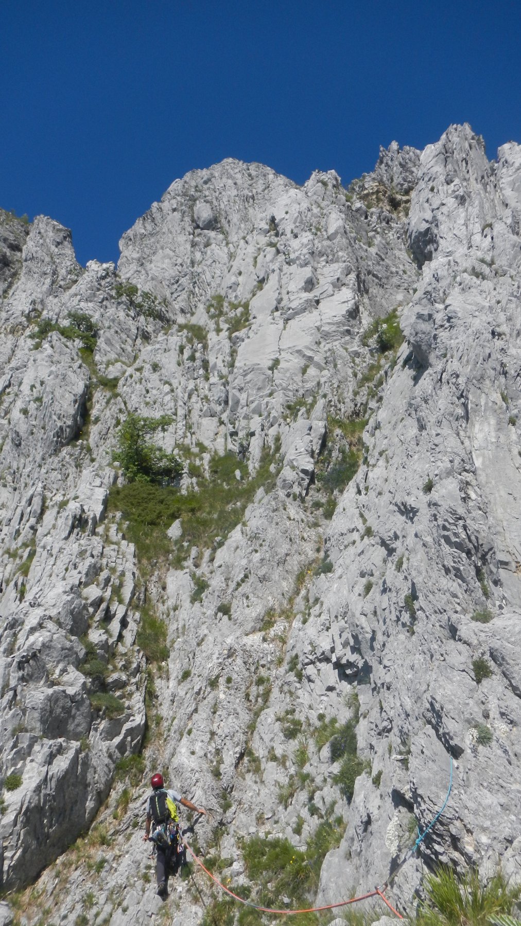 Da qui con pochi passi siamo sull’anticima, con calata in doppia (sosta attrezzata in loco) si arriva all’intaglio, e si risale per facili rocce fino alla cima II 30m . Dall’intaglio dove sono presenti due spit è posibile attrezzare una sosta e fare un tiro ed in cima sostare su grosso masso.