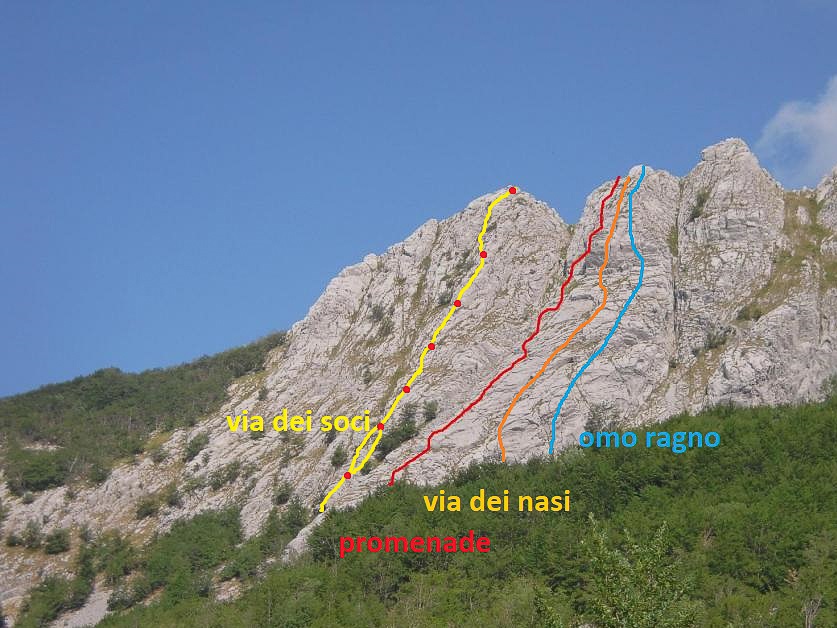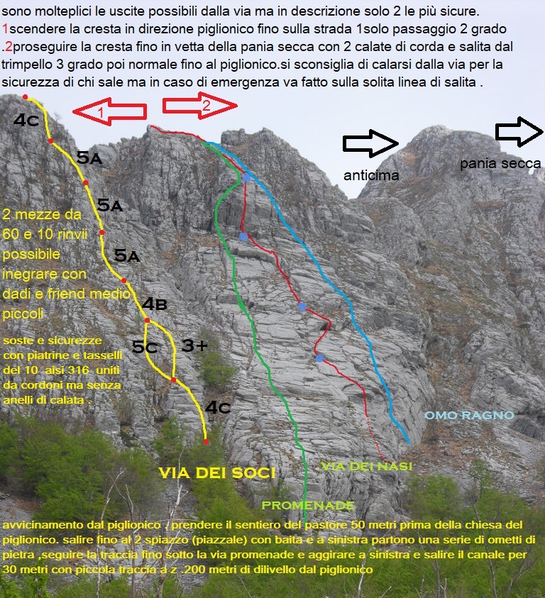 - 2 si tiene la cresta nord (detta dei denti ) fino in vetta della pania secca con 2 calate su corda e risalita nel canale del trimpello 2+ poi normale fino al piglionico .