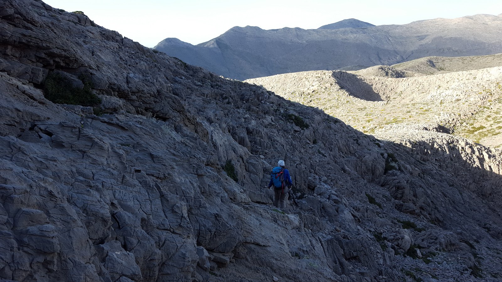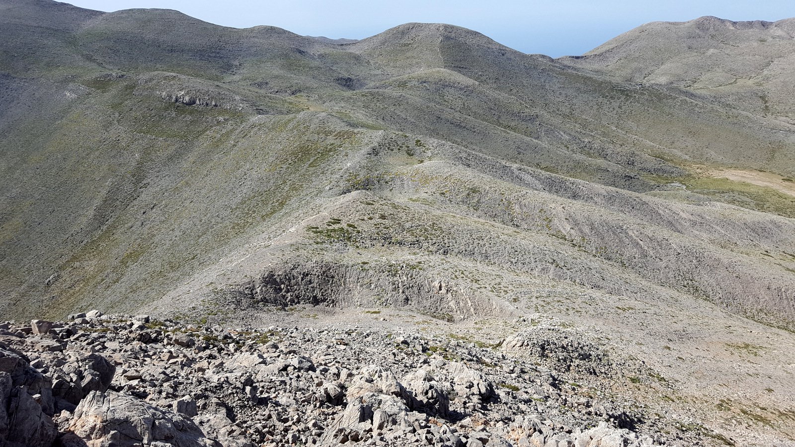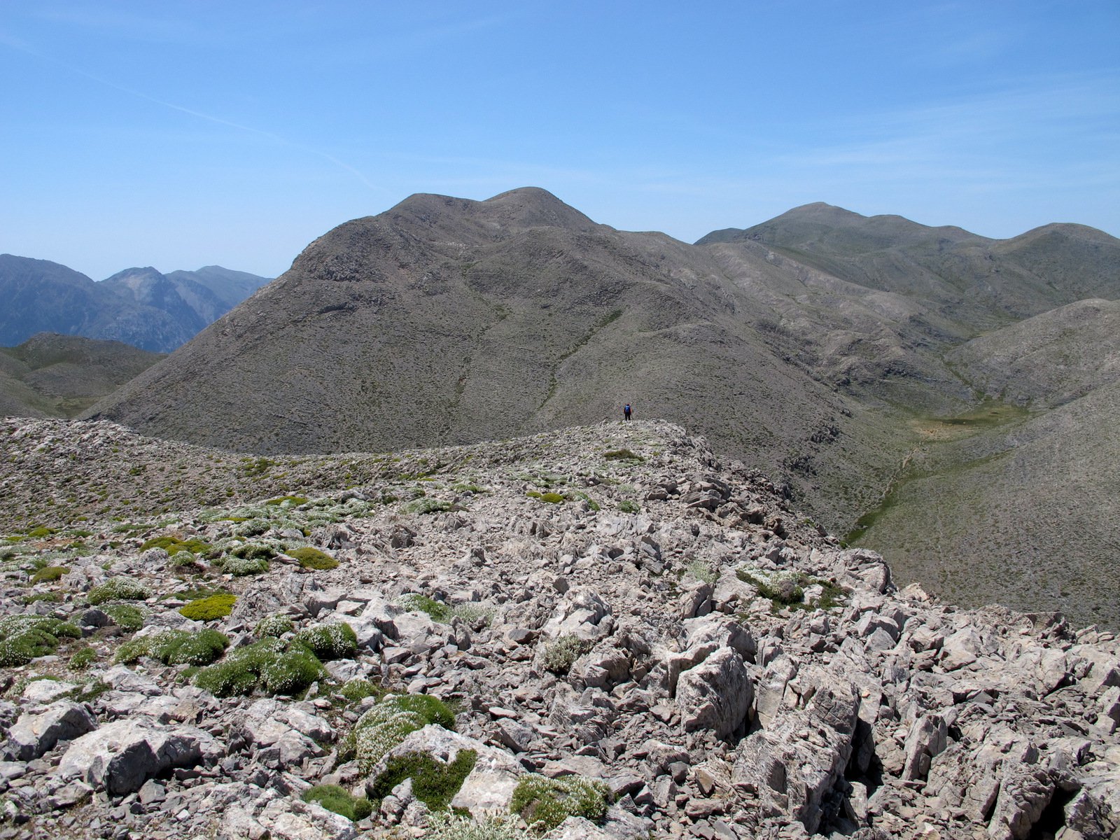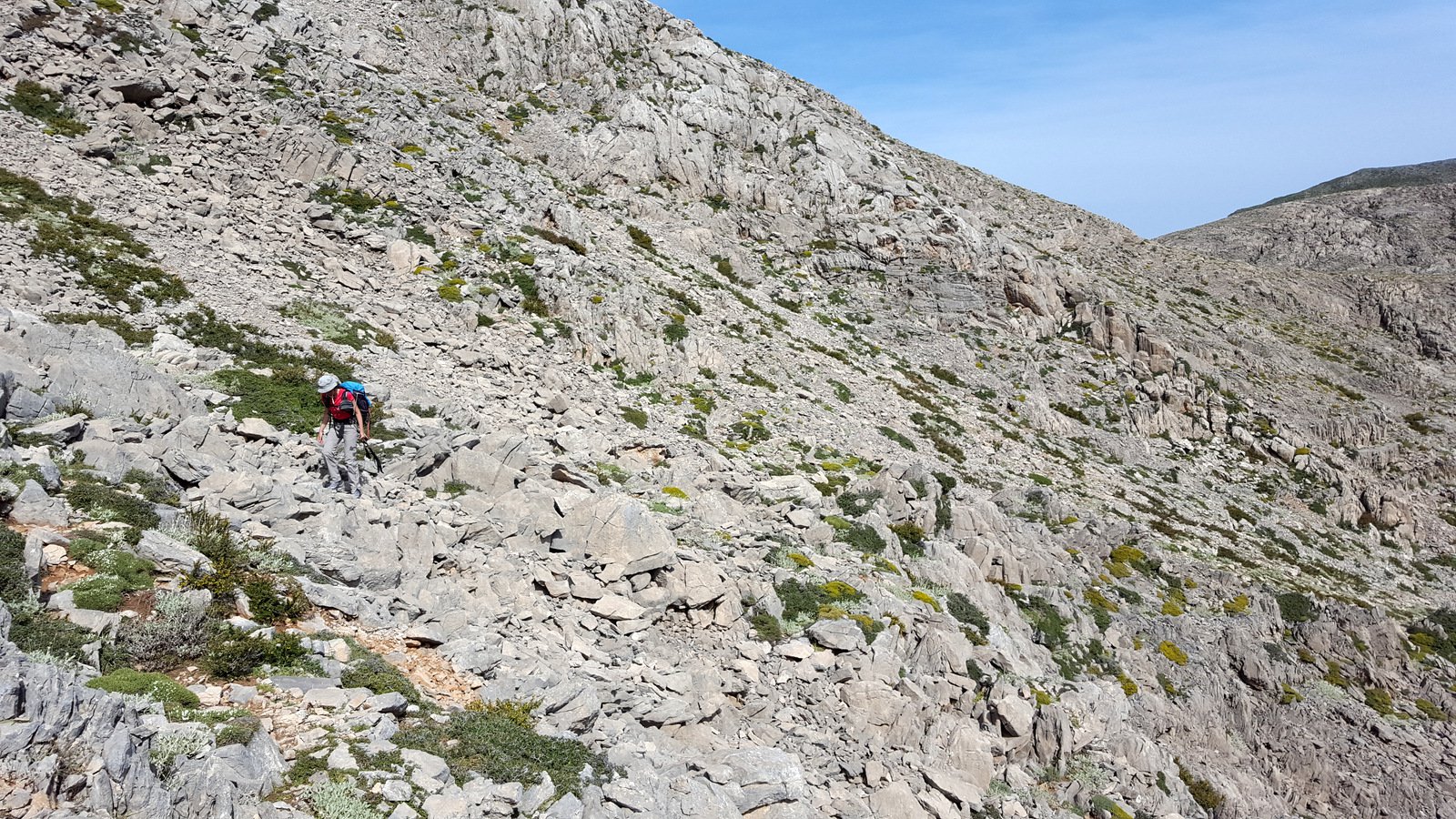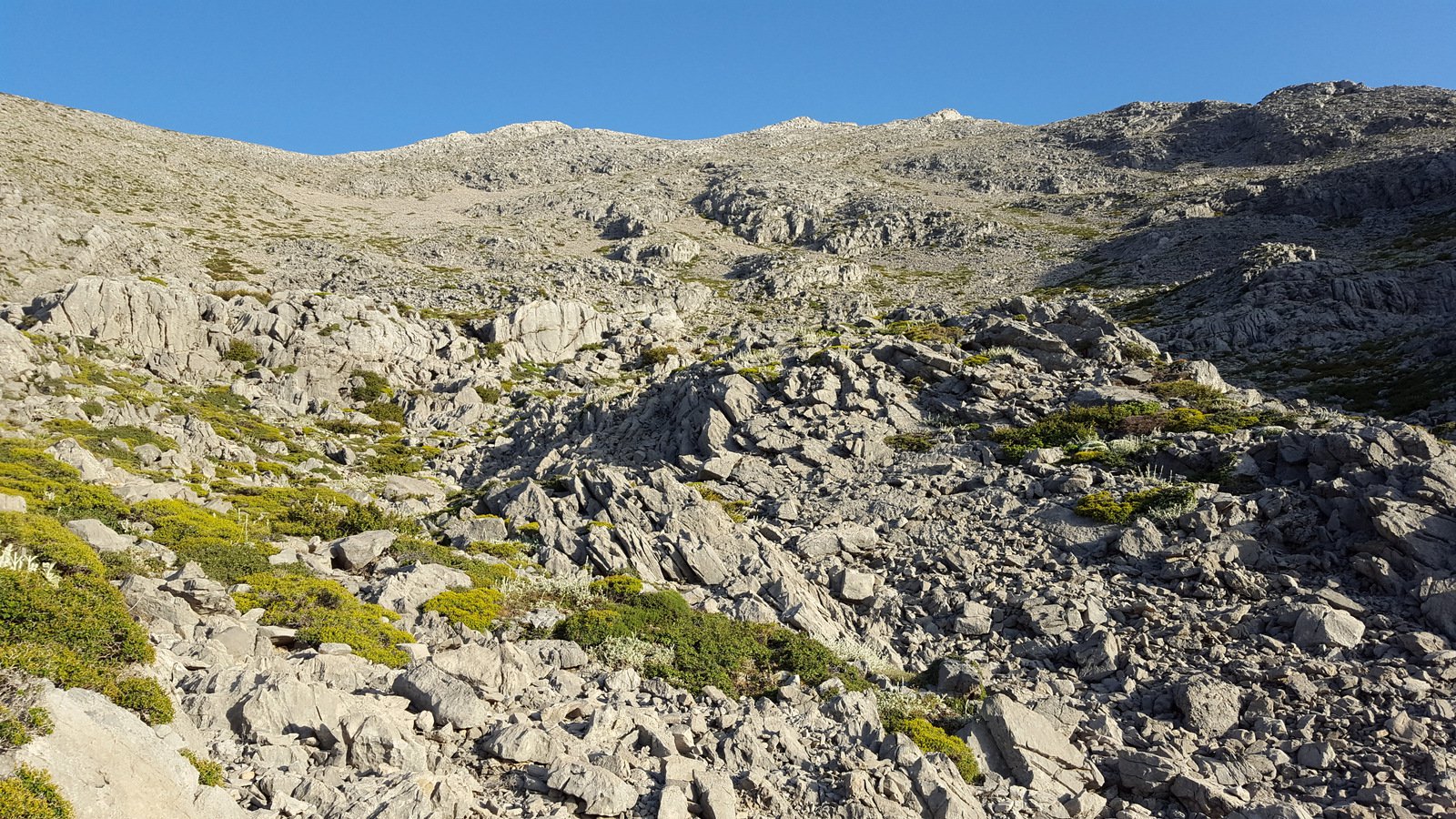 Dallo spiazzo si rimonta la dorsale in direzione est fino al bordo di una dolina e ad un mitato in cattivo stato. Il colle di fronte si raggiunge con ampio semicerchio sinistra-destra. Dal colle, che difende il piccolo mitato Tria Matia, ci si dirige verso Sud e si compie un lungo traverso in costa sopra le doline di Tzelias. Consistenti tracce di capre facilitano la progressione. Arrivati a Ovest del Vassilikì, si risale l’ampia dorsale che porta alla vetta (metri 2010, ometto).