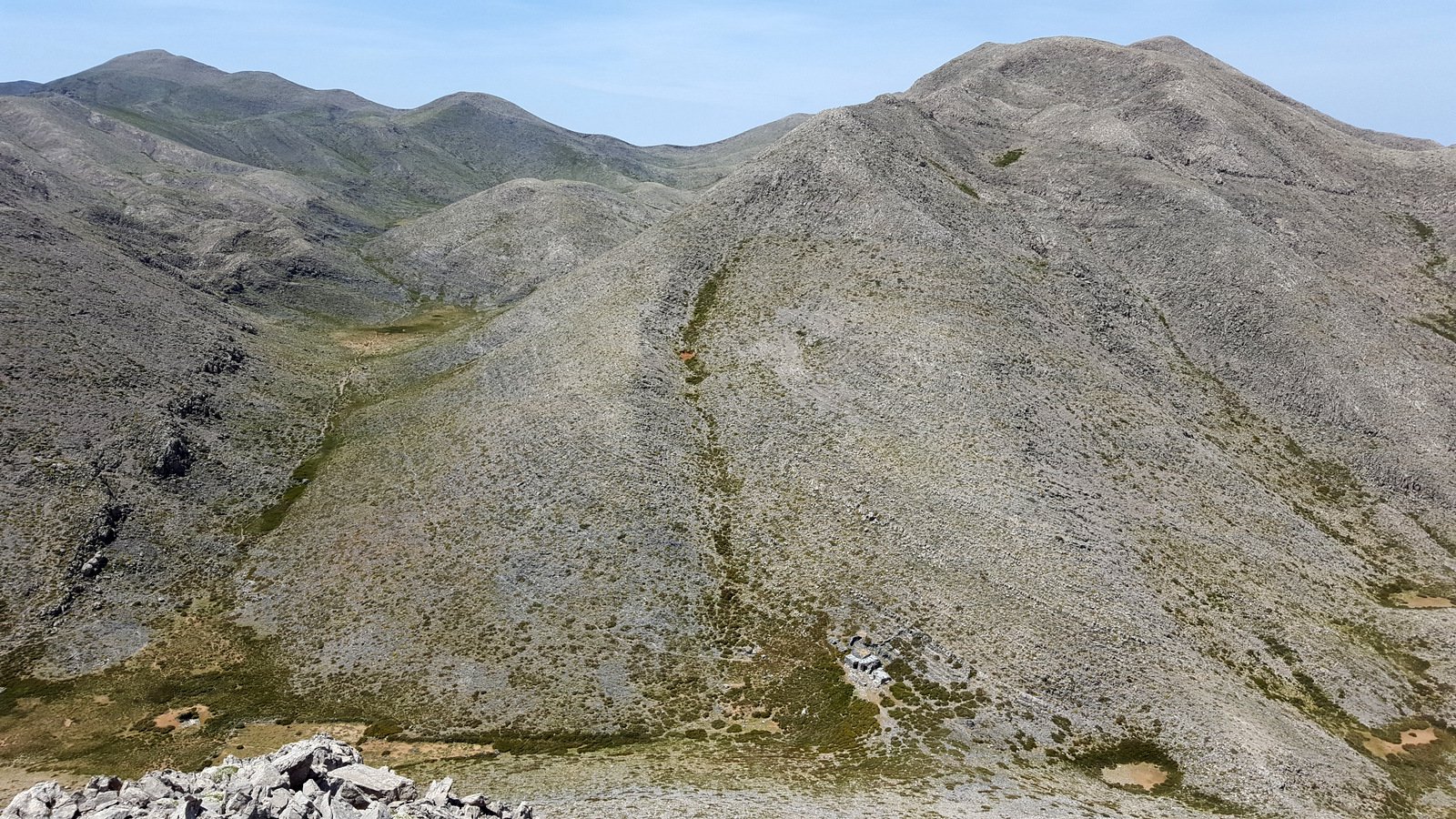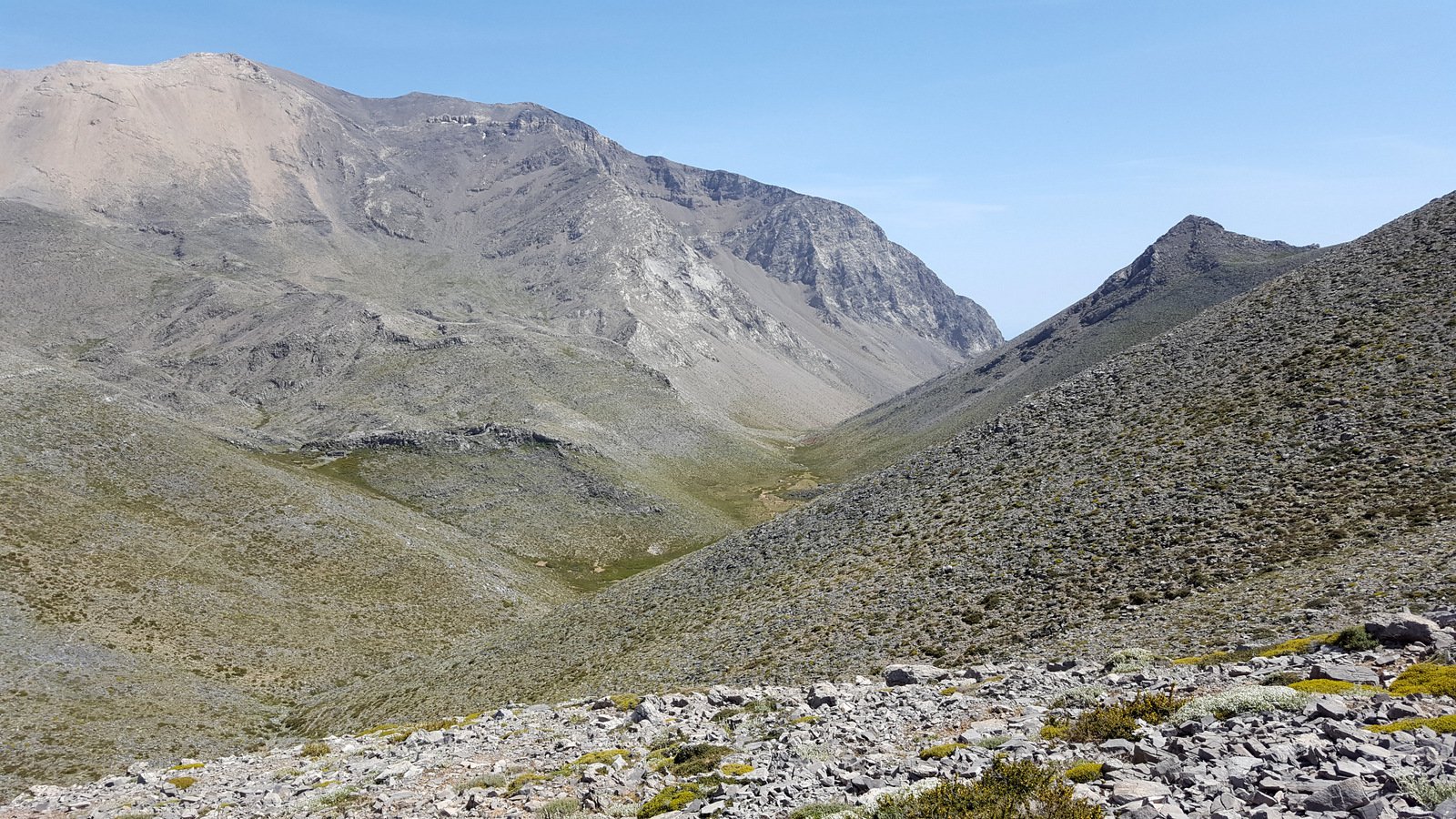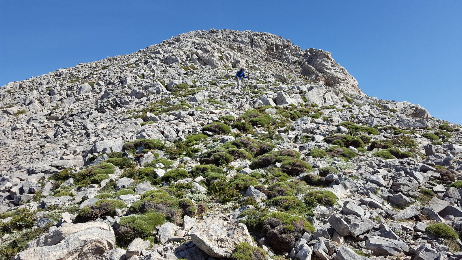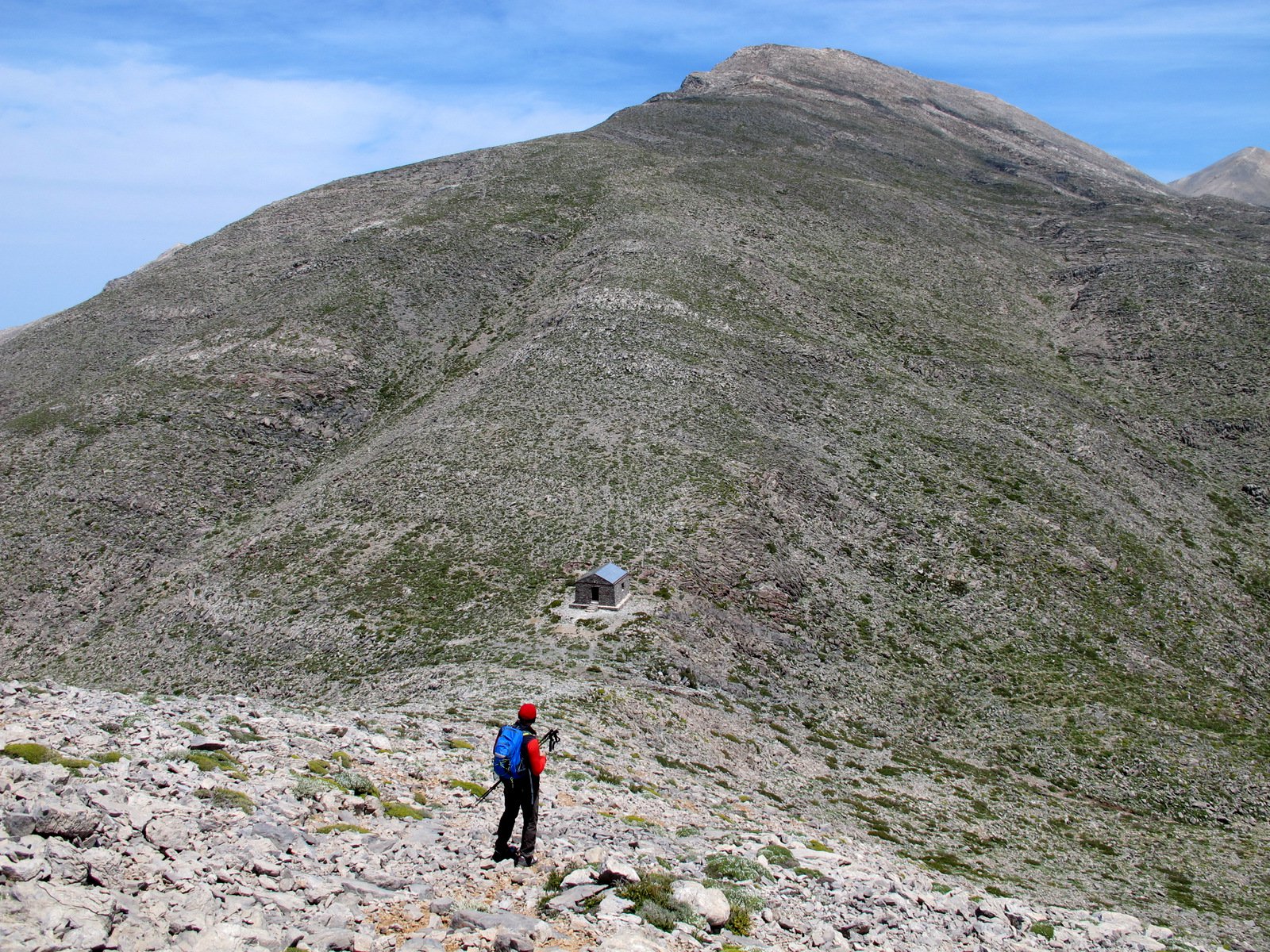 Dallo spiazzo si rimonta la dorsale in direzione est fino al bordo di una dolina e ad un mitato in cattivo stato. Il colle di fronte si raggiunge con ampio semicerchio sinistra-destra. Dal colle, che difende il piccolo mitato Tria Matia, ci si dirige verso Sud e si compie un lungo traverso in costa sopra le doline di Tzelias. Consistenti tracce di capre facilitano la progressione. Arrivati a Ovest del Vassilikì, si risale l’ampia dorsale che porta alla vetta (metri 2010, ometto).