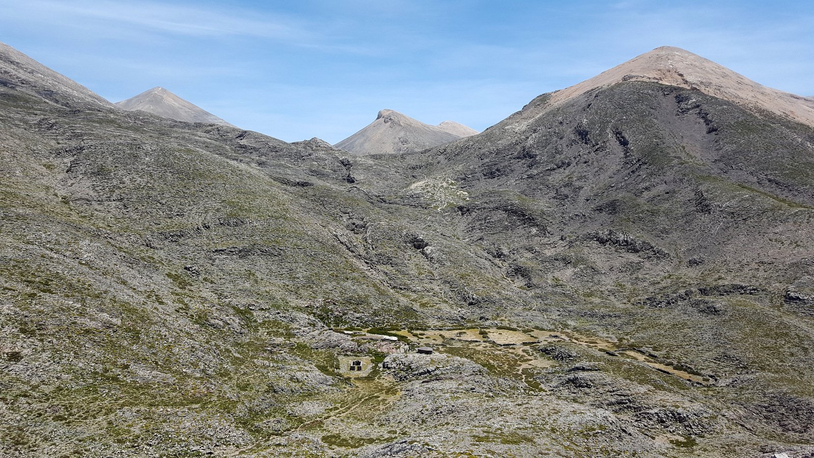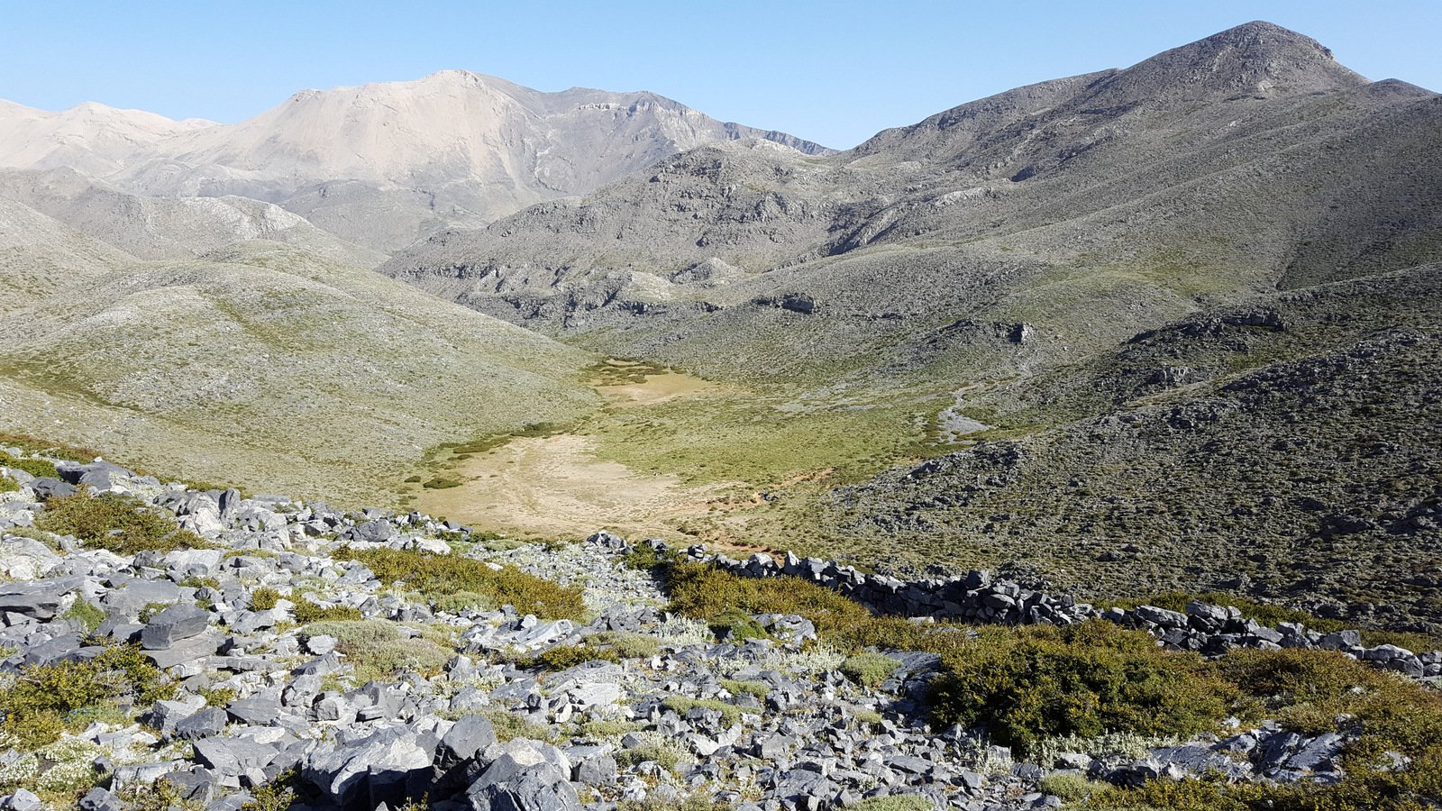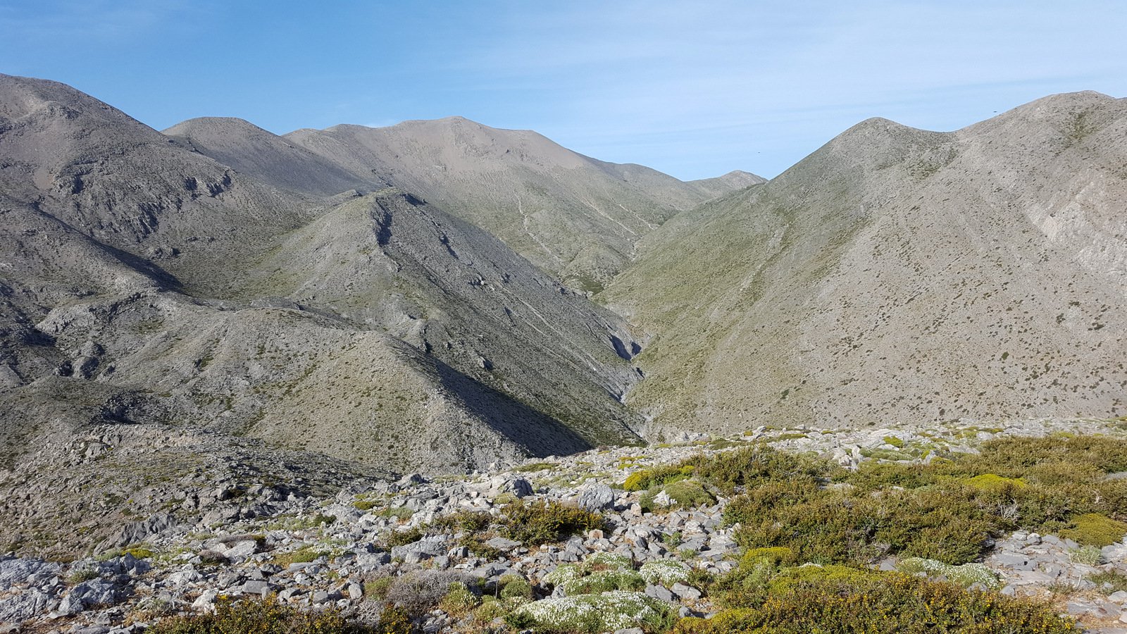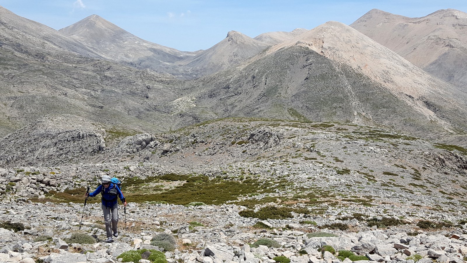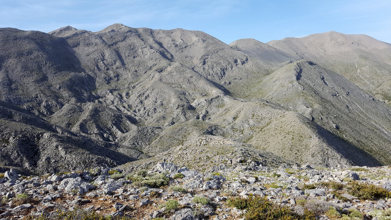 Dallo spiazzo si rimonta la dorsale in direzione est fino al bordo di una dolina e ad un mitato in cattivo stato. Il colle di fronte si raggiunge con ampio semicerchio sinistra-destra. Dal colle, che difende il piccolo mitato Tria Matia, ci si dirige verso Sud e si compie un lungo traverso in costa sopra le doline di Tzelias. Consistenti tracce di capre facilitano la progressione. Arrivati a Ovest del Vassilikì, si risale l’ampia dorsale che porta alla vetta (metri 2010, ometto).