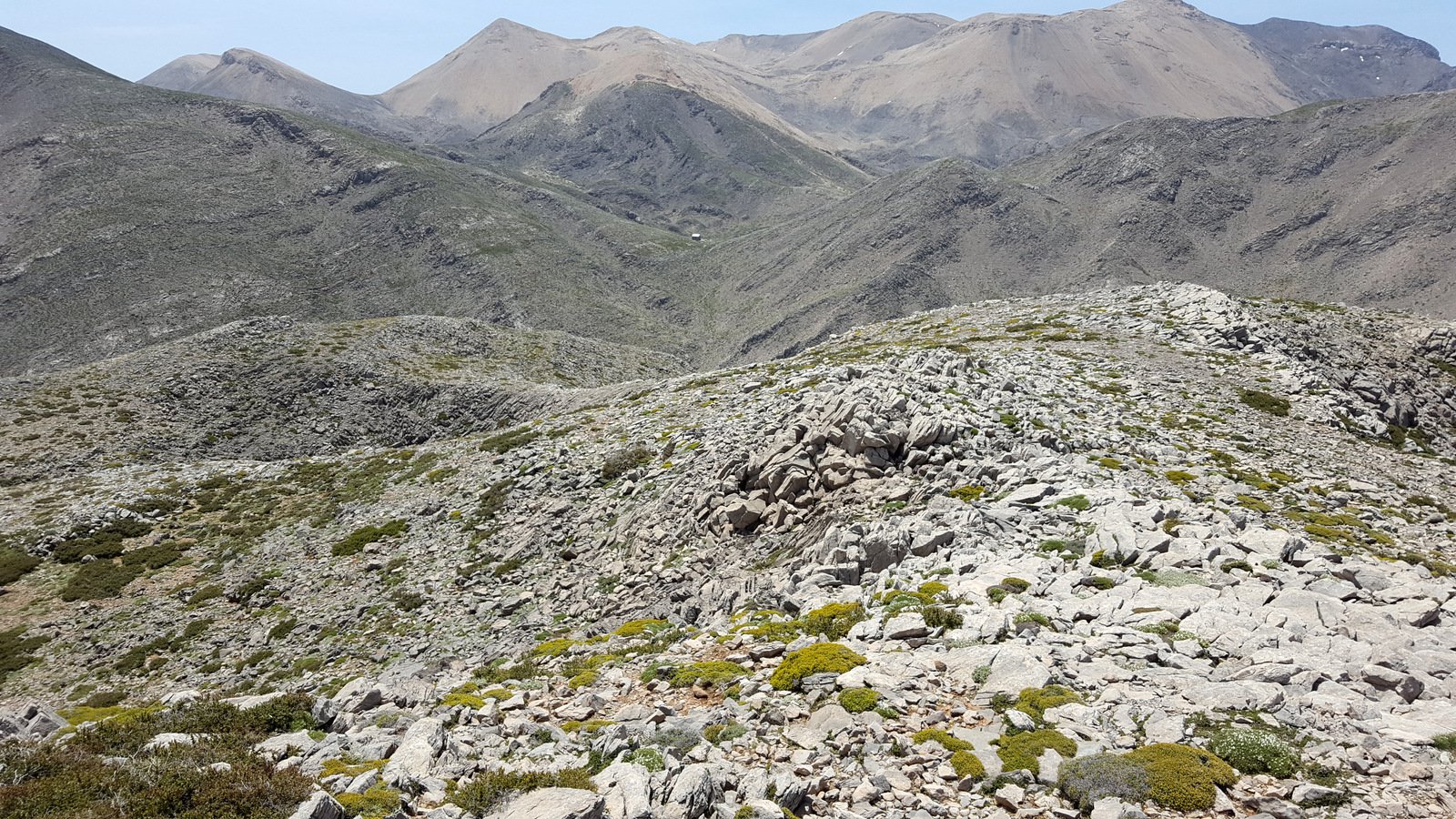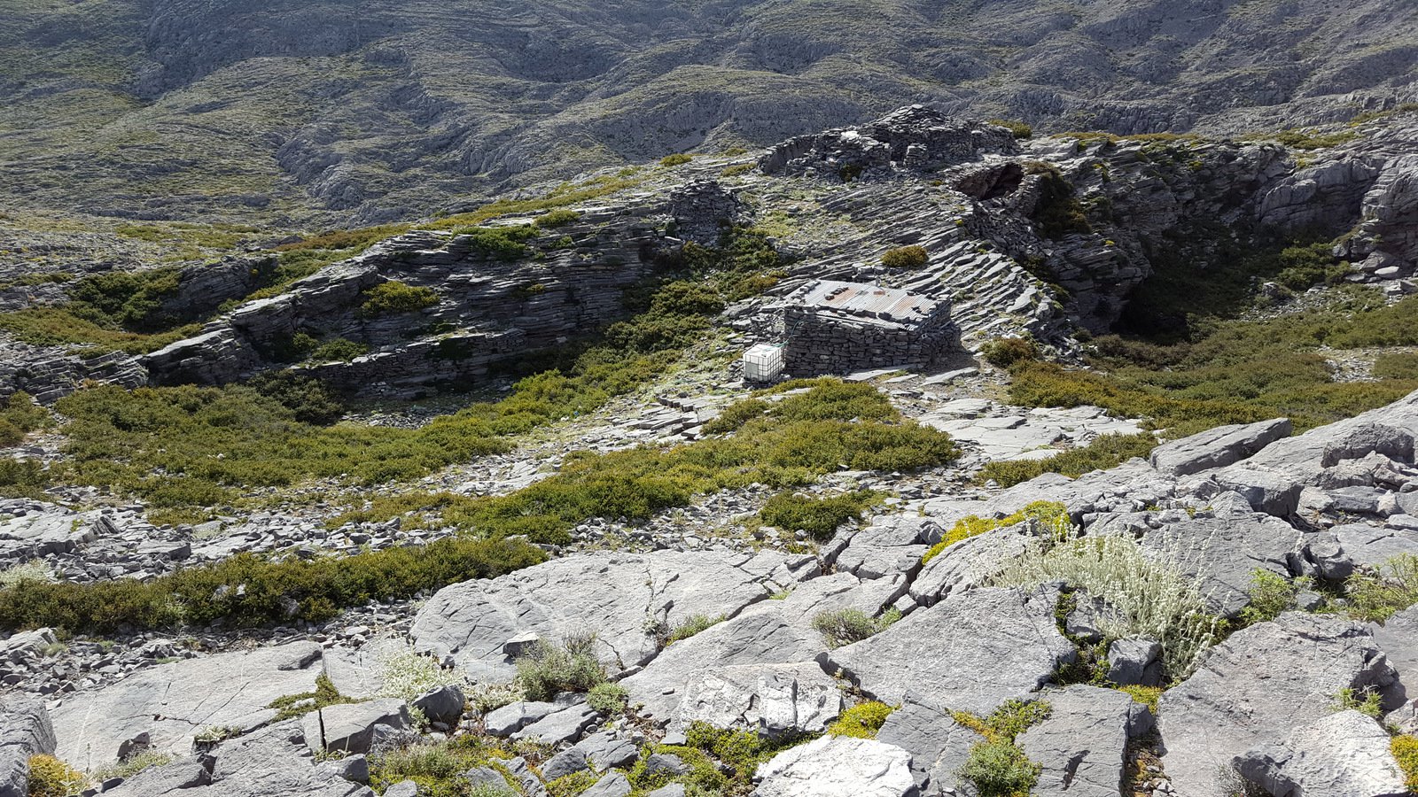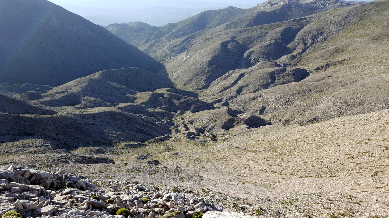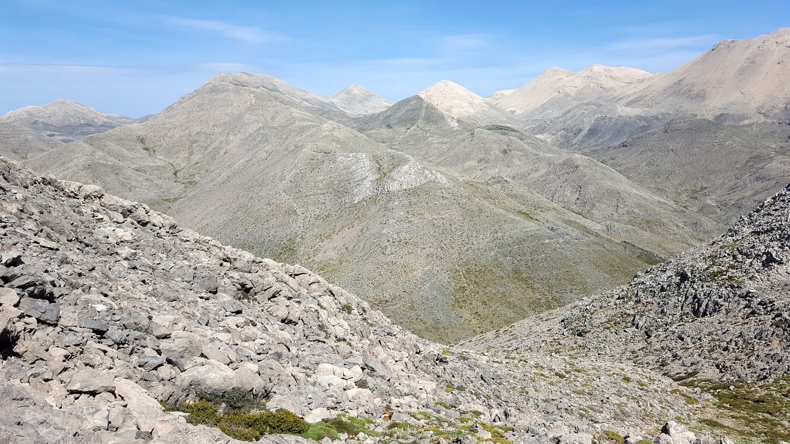 Dallo spiazzo si rimonta la dorsale in direzione est fino al bordo di una dolina e ad un mitato in cattivo stato. Il colle di fronte si raggiunge con ampio semicerchio sinistra-destra. Dal colle, che difende il piccolo mitato Tria Matia, ci si dirige verso Sud e si compie un lungo traverso in costa sopra le doline di Tzelias. Consistenti tracce di capre facilitano la progressione. Arrivati a Ovest del Vassilikì, si risale l’ampia dorsale che porta alla vetta (metri 2010, ometto).