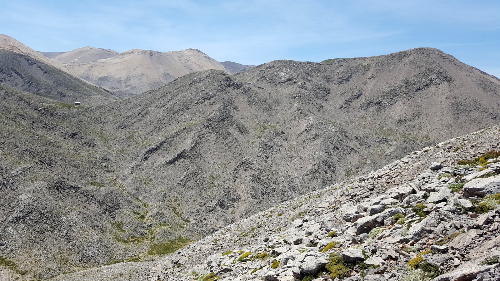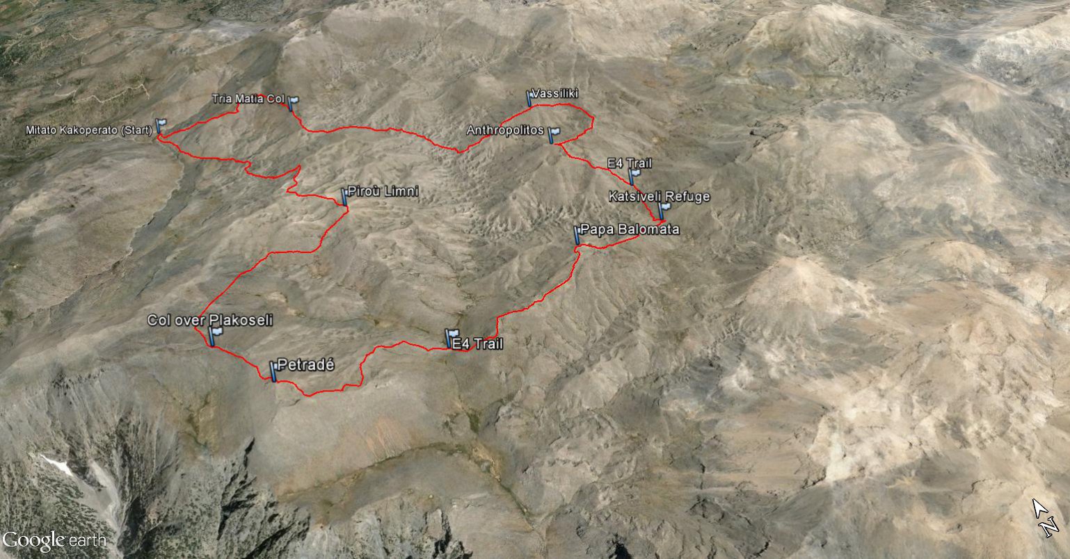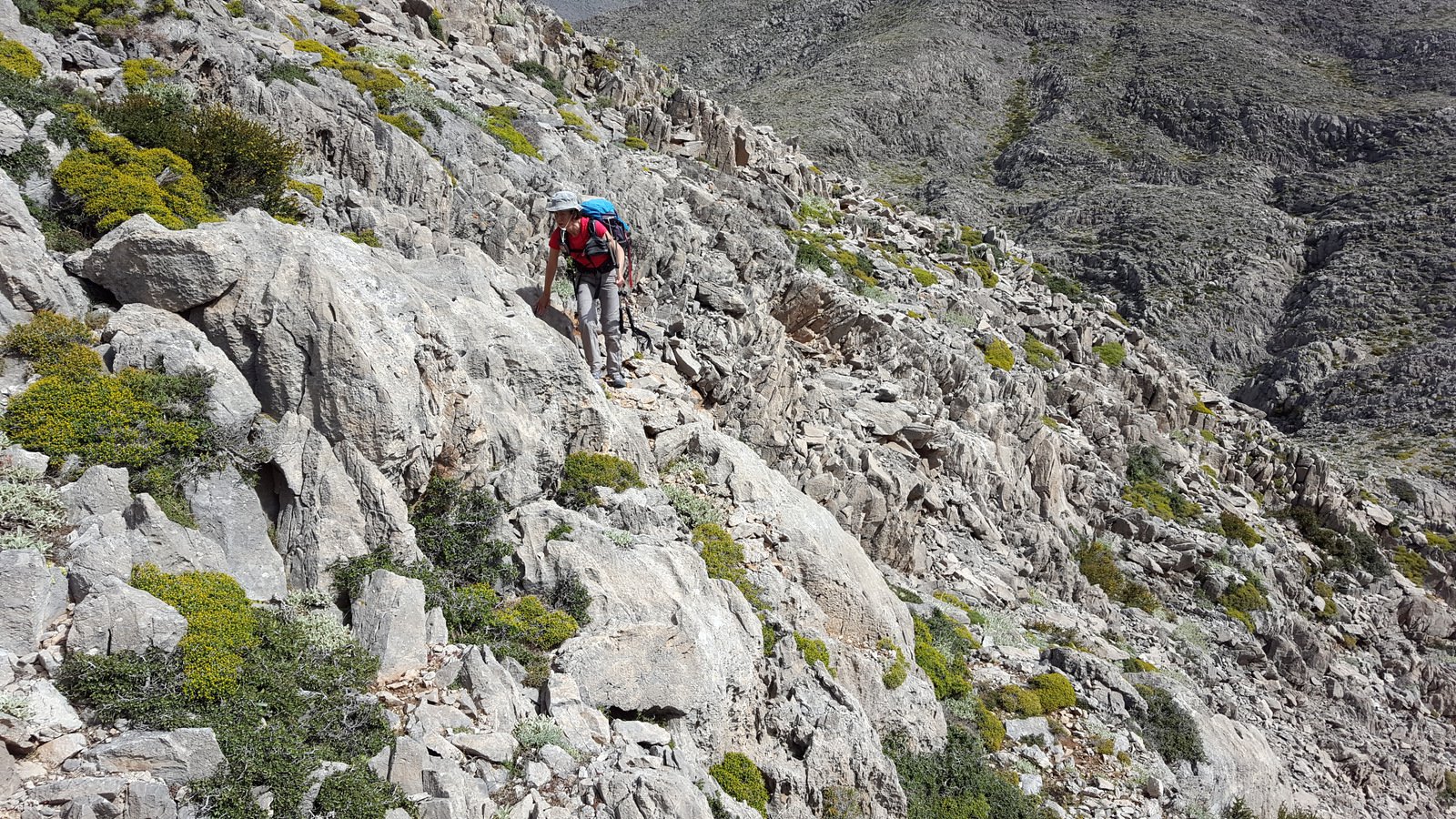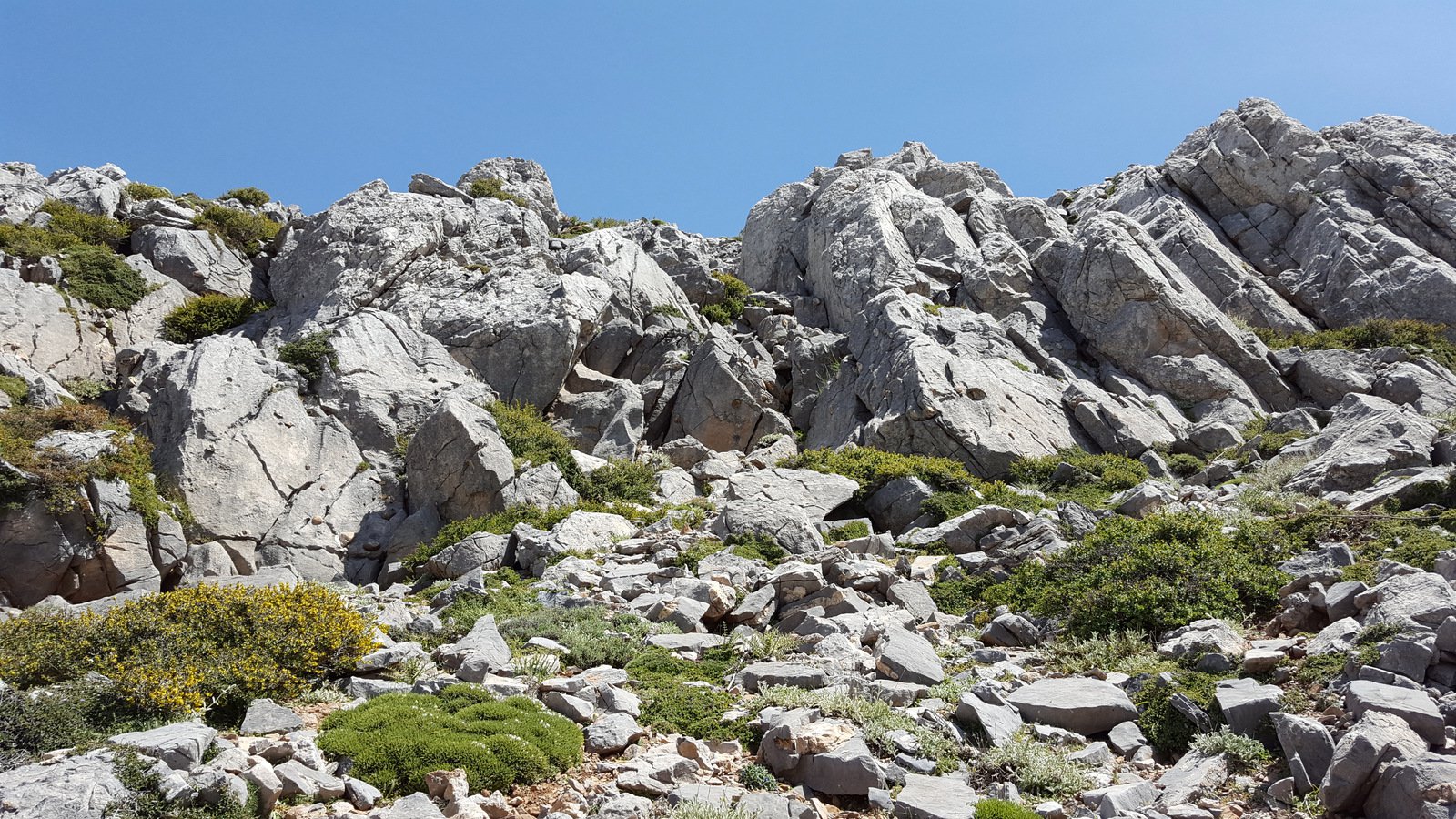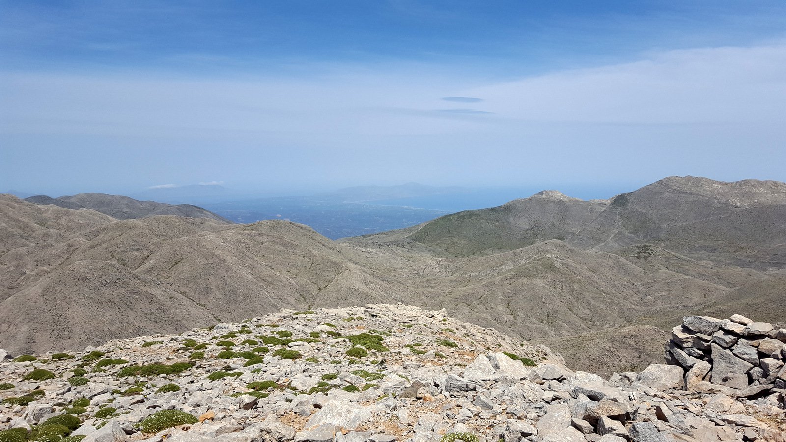 Dallo spiazzo si rimonta la dorsale in direzione est fino al bordo di una dolina e ad un mitato in cattivo stato. Il colle di fronte si raggiunge con ampio semicerchio sinistra-destra. Dal colle, che difende il piccolo mitato Tria Matia, ci si dirige verso Sud e si compie un lungo traverso in costa sopra le doline di Tzelias. Consistenti tracce di capre facilitano la progressione. Arrivati a Ovest del Vassilikì, si risale l’ampia dorsale che porta alla vetta (metri 2010, ometto).