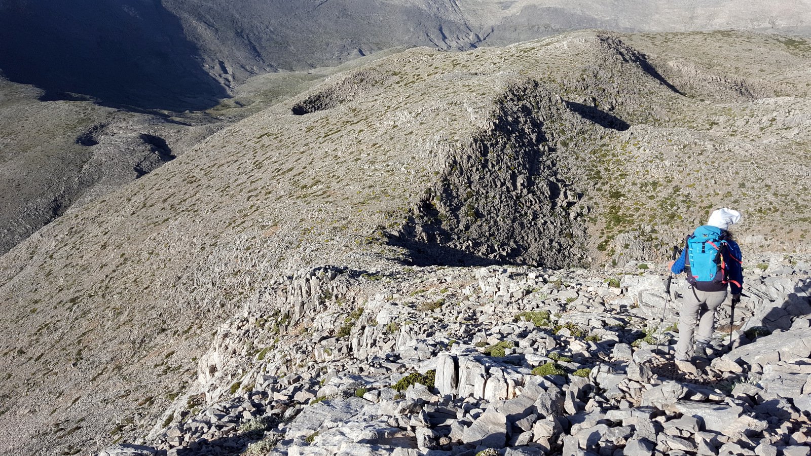 Ci si abbassa per il pendio/dorsale opposto e con ampio semicerchio, perdendo meno quota possibile, si risale per la dorsale ENE del monte Anthropolithos (metri 2098, piccolo muretto).