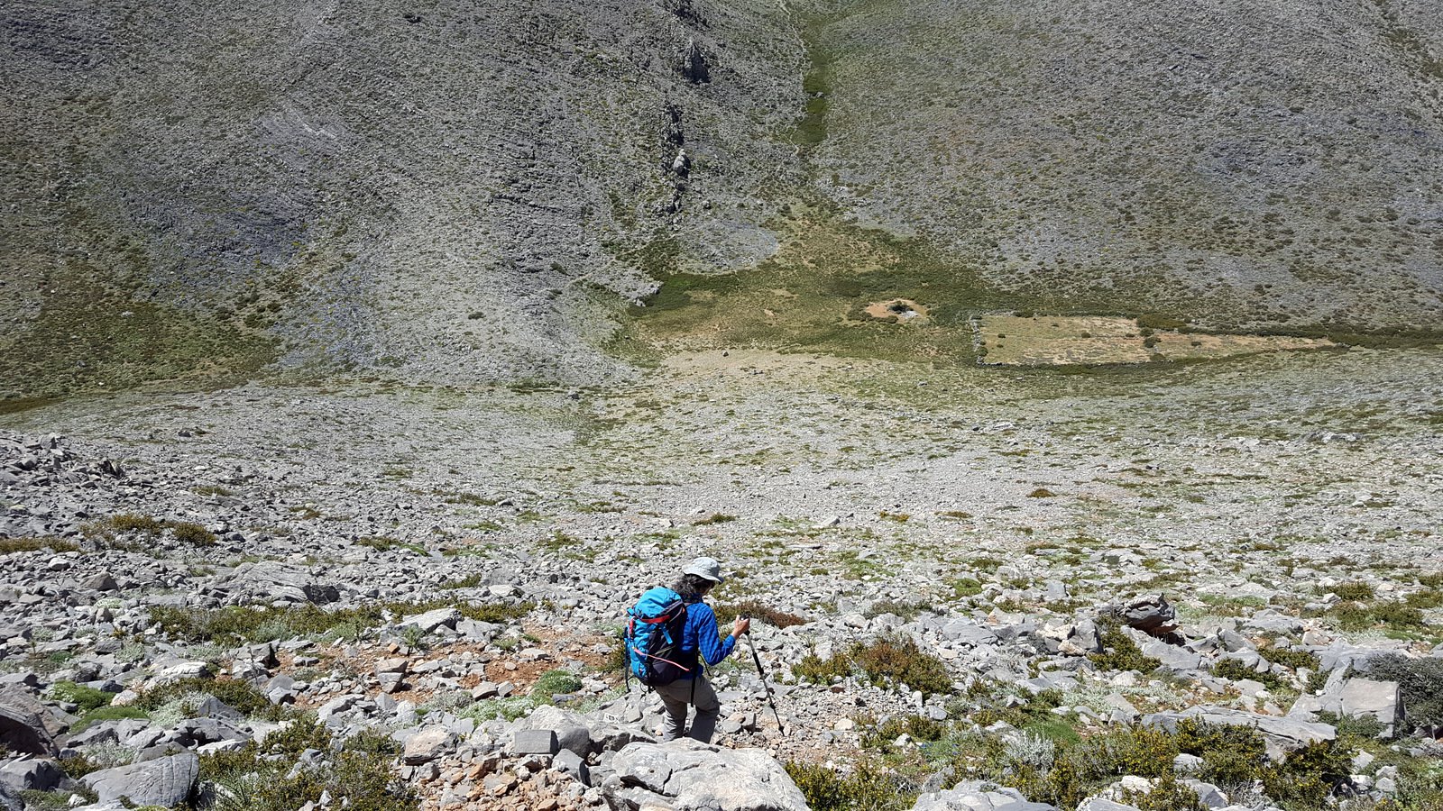 Si inizia la discesa su mobili detriti puntando al centro della valle e, giunti alla base del pendio, si bordeggiano alcune doline mantenendosi sulla sx idrografica. Superate le doline, la valle spiana formando un piccolo pianoro utilizzato come pascolo per le pecore. Lo si attraversa e là dove la valle torna a restringersi, si reperisce sulla destra un buon sentiero che, rimanendo alto sulla gola sottostante, riporta al Mitato Kakoperato.