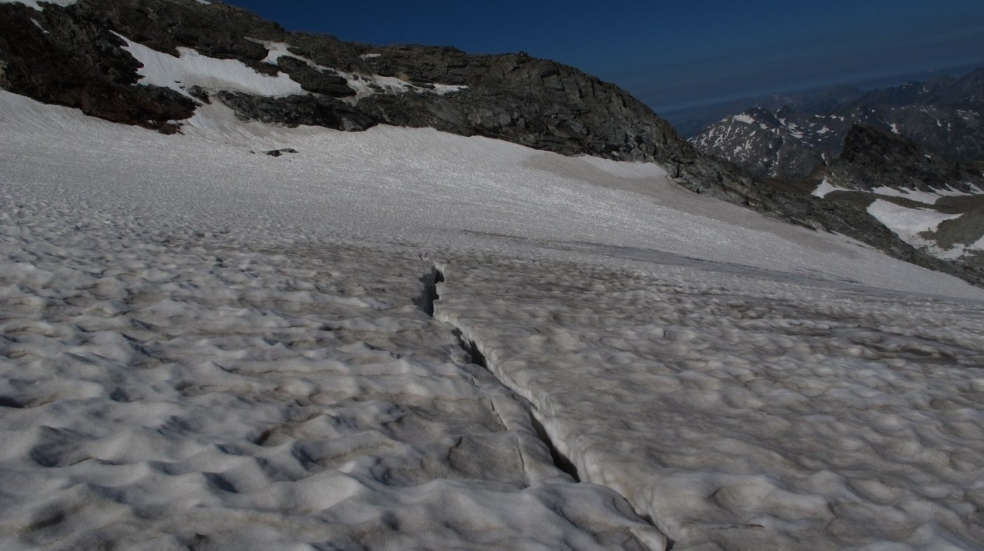 Sceso lungo la cresta e,arrivato al colle,attraversato centralmente il ghiacciaio, notando solo due evidenti crepacci,poi rientro al rifugio sullo stesso percorso di salita,l’idea di salire anche il Paramont me la sono fatta subito passare,solo sfasciumi instabili e rotolanti in ogni dove…………un postaccio.