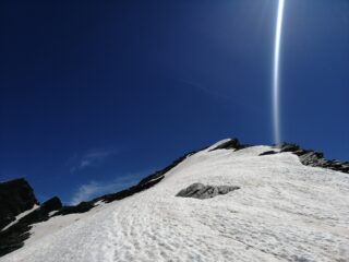 La salita ‘normale’ ovvero quella dal colle, che è anche rappresentata nella traccia gpx allegata alla relazione, non vi permette di arrivare in cima alle condizioni attuali. Avendo intuito tutto questo, seguo l’itinerario 2 e arrivo facilmente in cima. Effettivamente dall’alto si vede la cornice marcia, scollata e pronta a crollare. Itinerario strepitoso per ambiente, panorami e isolamento. Difficile trovare un posto tanto grazioso, selvaggio e mai estremo. Dal rifugio conviene scendere al ponticello e dopo circa 10 metri salire seguendo la condotta dell’acqua. Numerosi ometti portano ai laghi e alle morene superiori. Sul ghiacciaio, davvero difficile sbagliare senza nebbia. In discesa ho traversato per andare sulla cima di Invergneus, la più alta delle due.