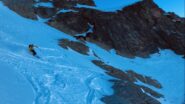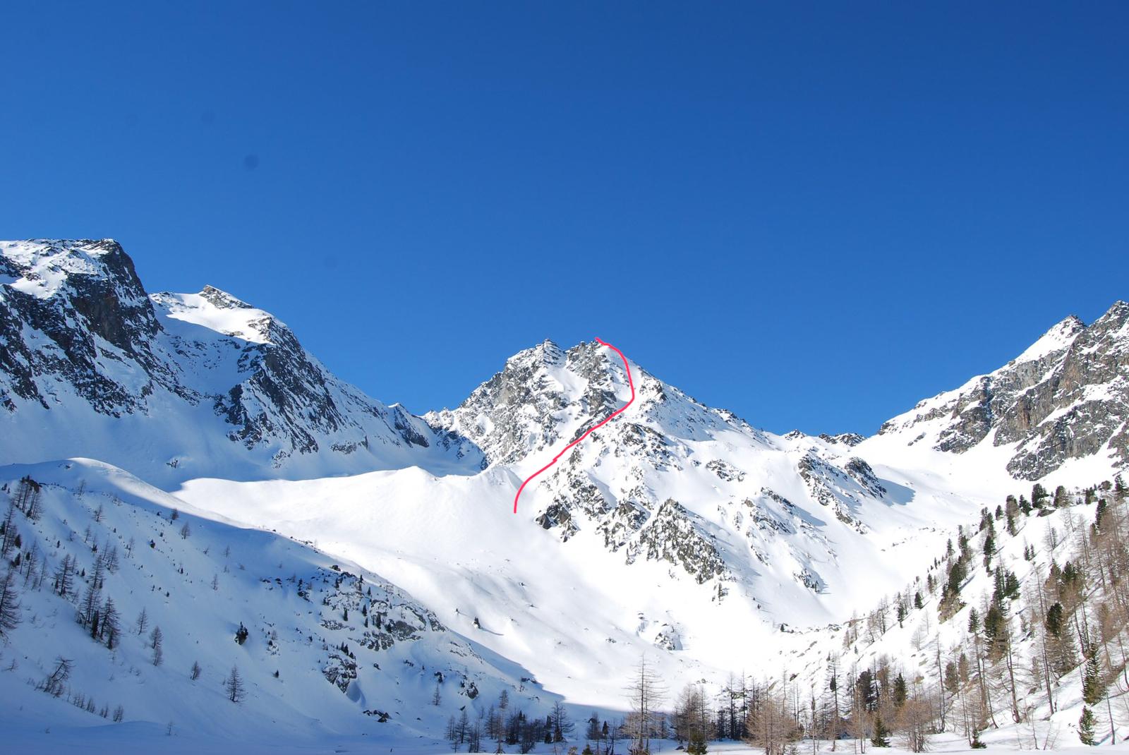 Da qui proseguire oltre i laghi, fino all’evidente imbocco del canale che parte a destra del canale dell’Incisivo. Il canale poi arriva ad una sella dove inizia verso sinistra l’evidente paretina che porta all’anticima ovest. Questo tratto è più pendente rispetto al canale (oltre 45 gradi) e presenta sotto il manto nevoso parecchie placche di roccia, che con poco innevamento potrebbero essere insidiose.