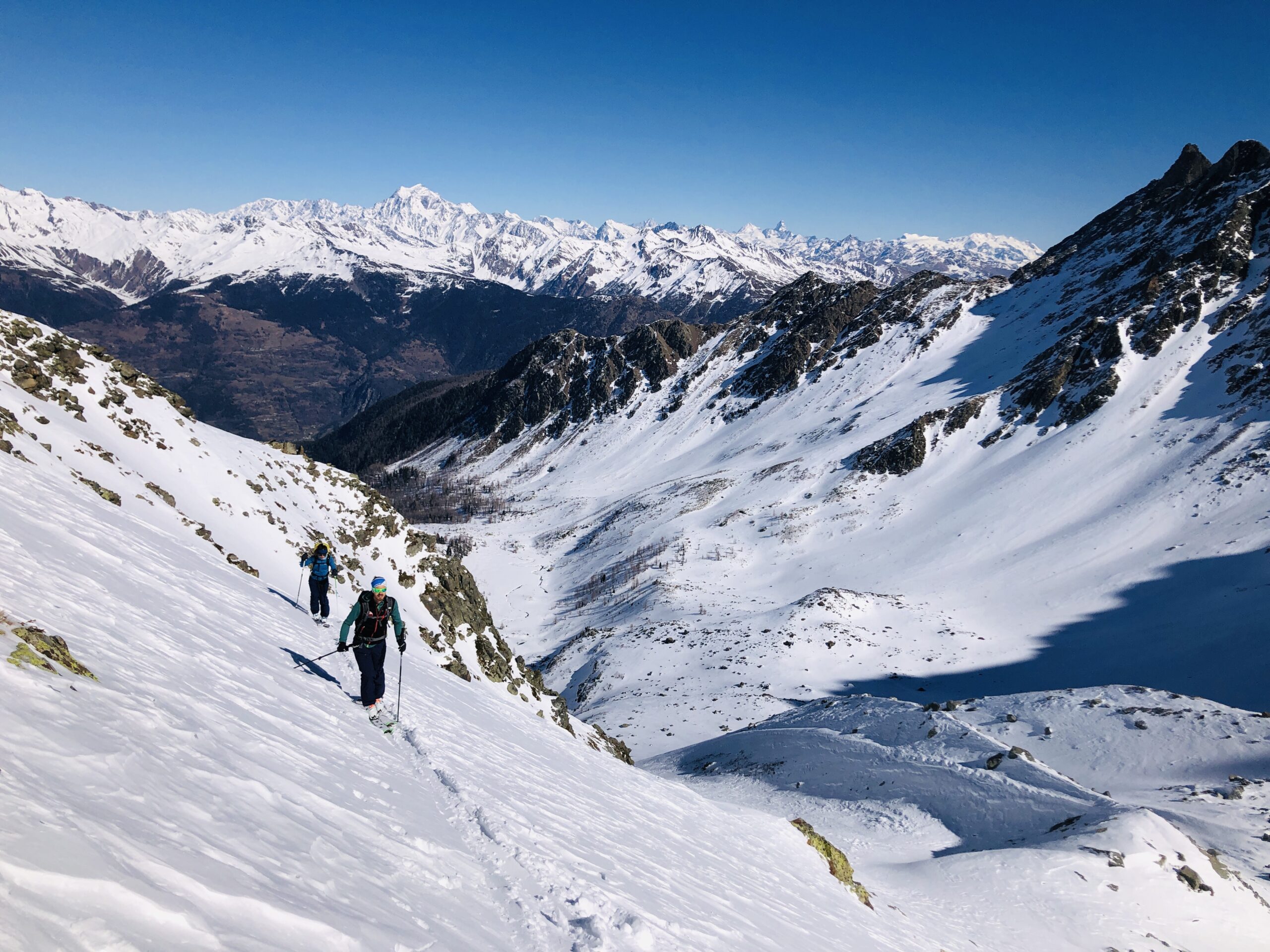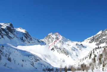 Neve riportata dal vento nel canale, in alcuni punti una leggera crosticina superficiale. Dopo la selletta, in parete neve inconsistente che poggiava in alcuni punti su placche di roccia. In altri punti, neve dura grippante. Discesa iniziale un po’ abbottonata, poi si può lasciare andare fino a dopo il conoide. Molti spazi con neve buona.