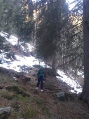 Arrivati al piano di Promoud, si spinge un po’ per poi seguire il sentiero innevato ancora con la tavola ai piedi fino quando conviene mettersela sulle spalle e scendere a piedi fino alla strada e poi alla macchina.