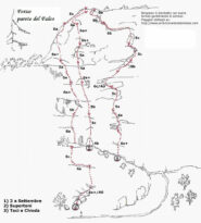 Via varia (placche, diedri, strapiombi), ben chiodata, con soste attrezzate (5c obbligatorio). La discesa in doppia è preferibile su una della due vie di sinistra.