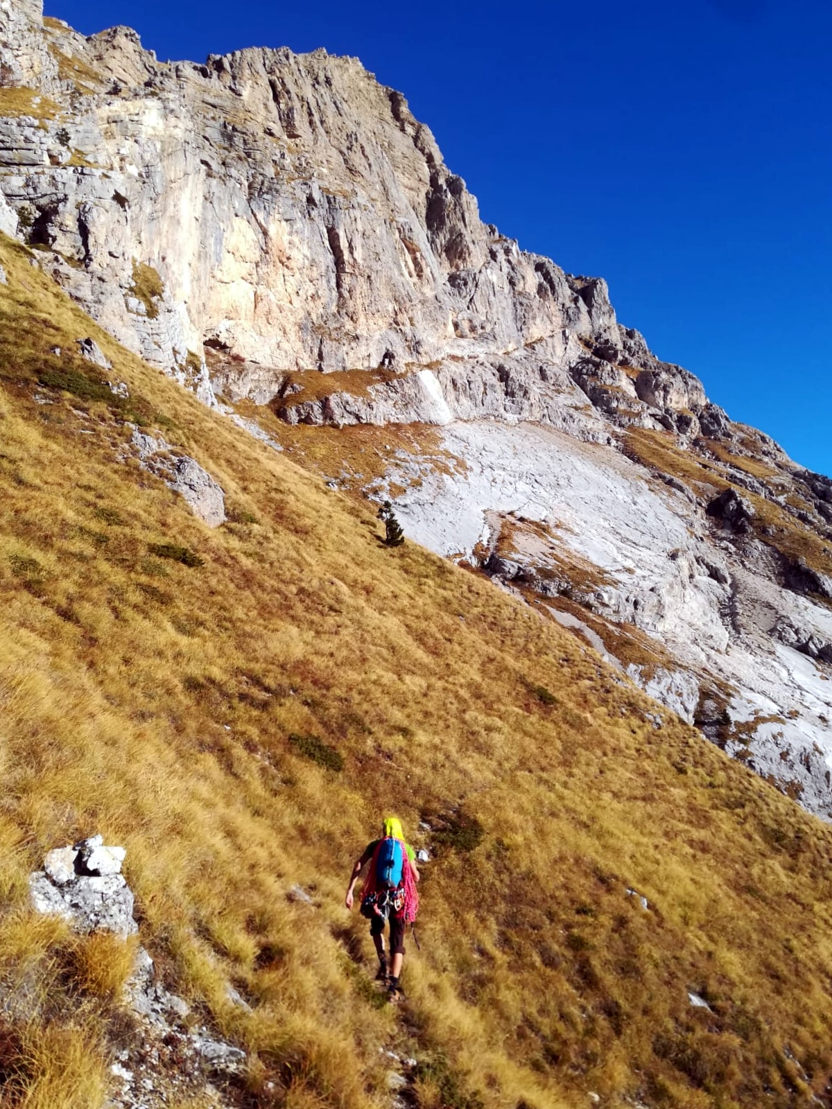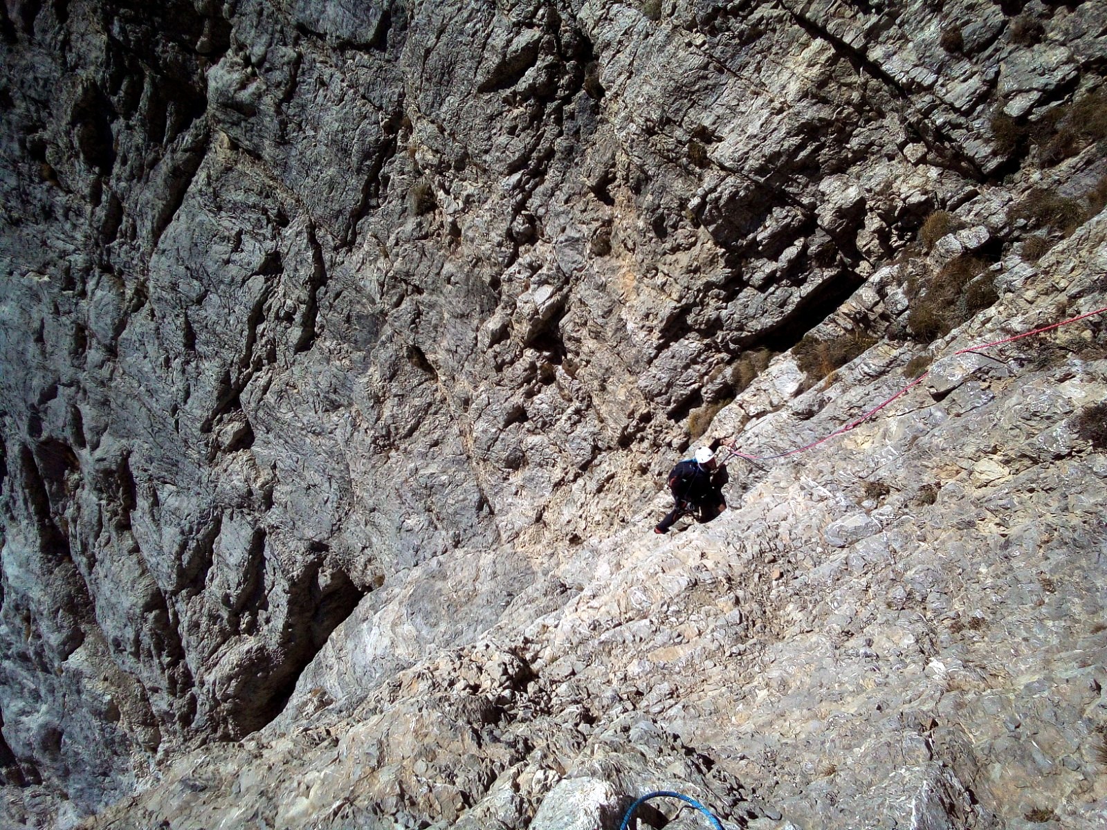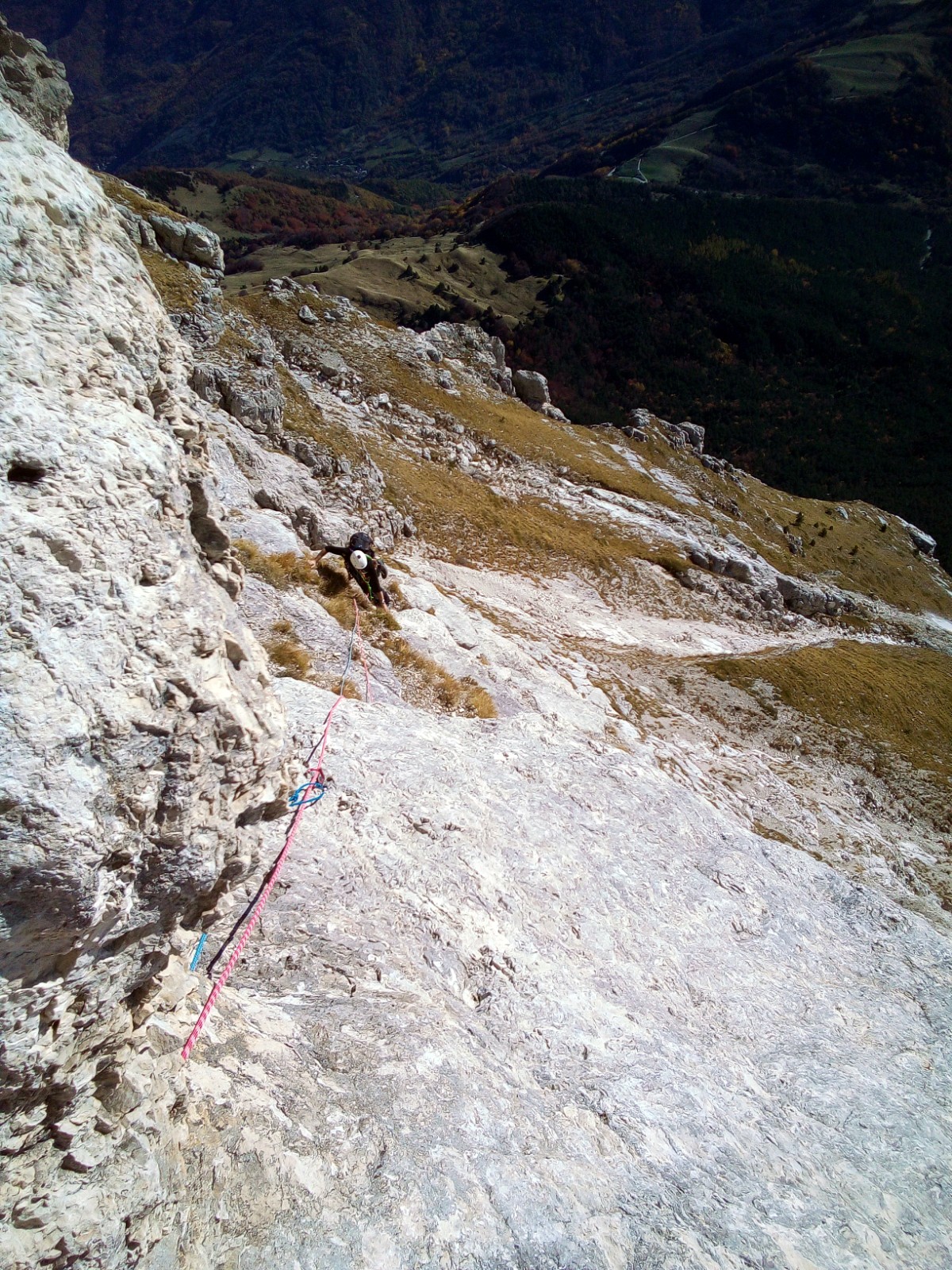 Verso la fine di L4 seguire, come relazionato, la rampa che traversa a destra e dopo pochi metri si trova la sosta (due chiodi con cordino); continuando invece a salire nel diedro/camino, senza intercettare la rampa, abbiamo trovato un vecchio chiodo ma non conviene passar di lì.