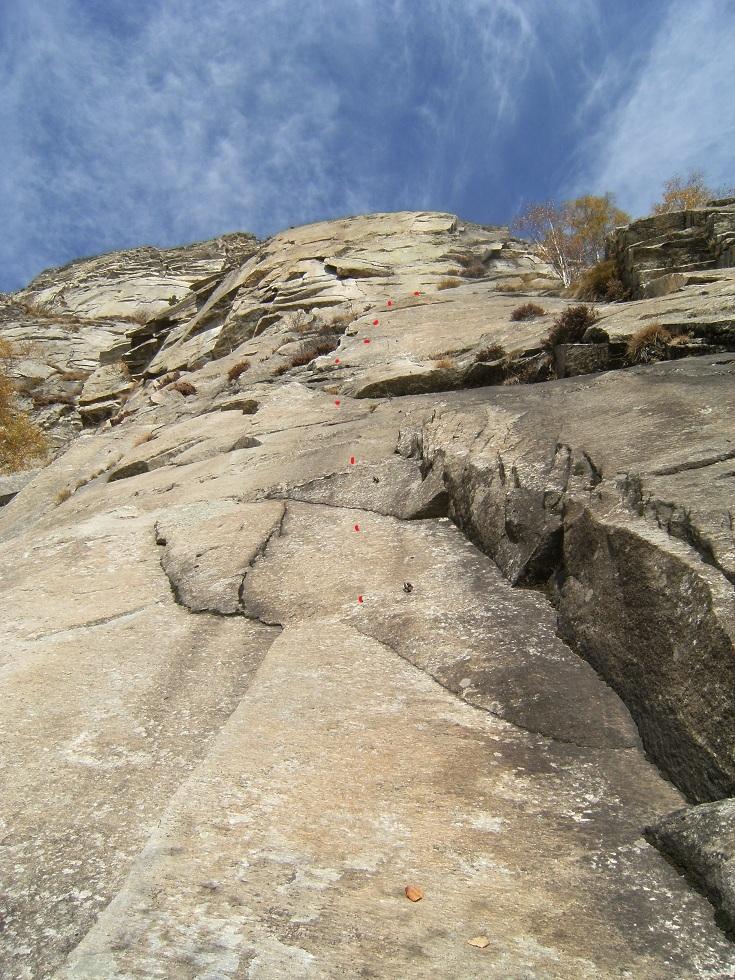 - primo tiro con passo delicato in partenza e passo chiave sulla placca finale (6a), molti evitano questo passo passando a sinistra degli spit su un diedrino più facile.