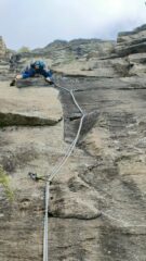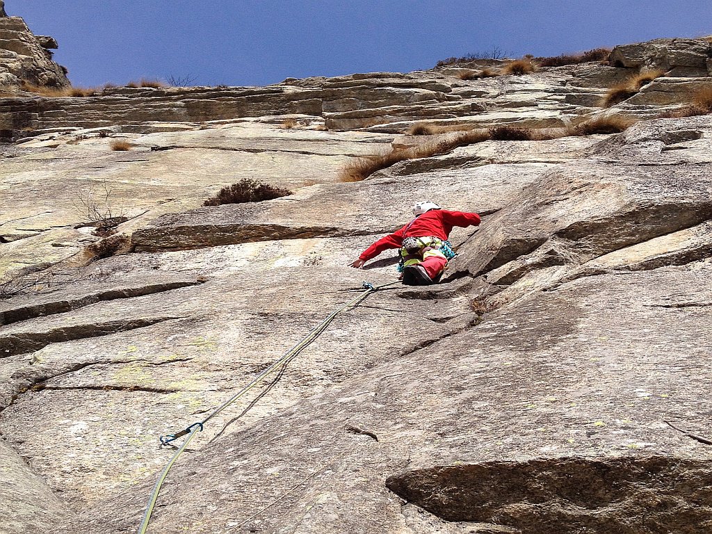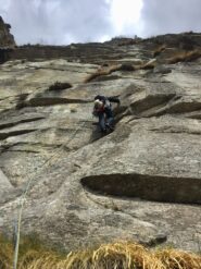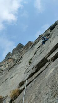 L3: tiro chiave, per i passi obbligatori anche se ottimamente protetti. Diedrino, fessura da raggiungere con un lancio iniziale (!), boulder per ribaltarsi su una placca (5c6a e passi 6b)