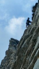 Primo tiro che schiva fortuitamente le colate d’acqua e fa subito capire quale sarà l’andazzo. Secondo tiro praticamente di trasferimento. Terzo tiro che è il capolavoro della via: più di 40 metri di linee che si susseguono con abbondanza di fessure e lame che consentono di proteggersi qualora non si voglia correre rischi. Intensità sempre sostenuta che necessita di un grado bello solido. Quarto tiro breve ma con un passo delicato nella sezione centrale. Tiro finale un po’ lichenoso (come generalmente succede alla Parey) che richiede un movimento più fisico per uscire da un tettino.