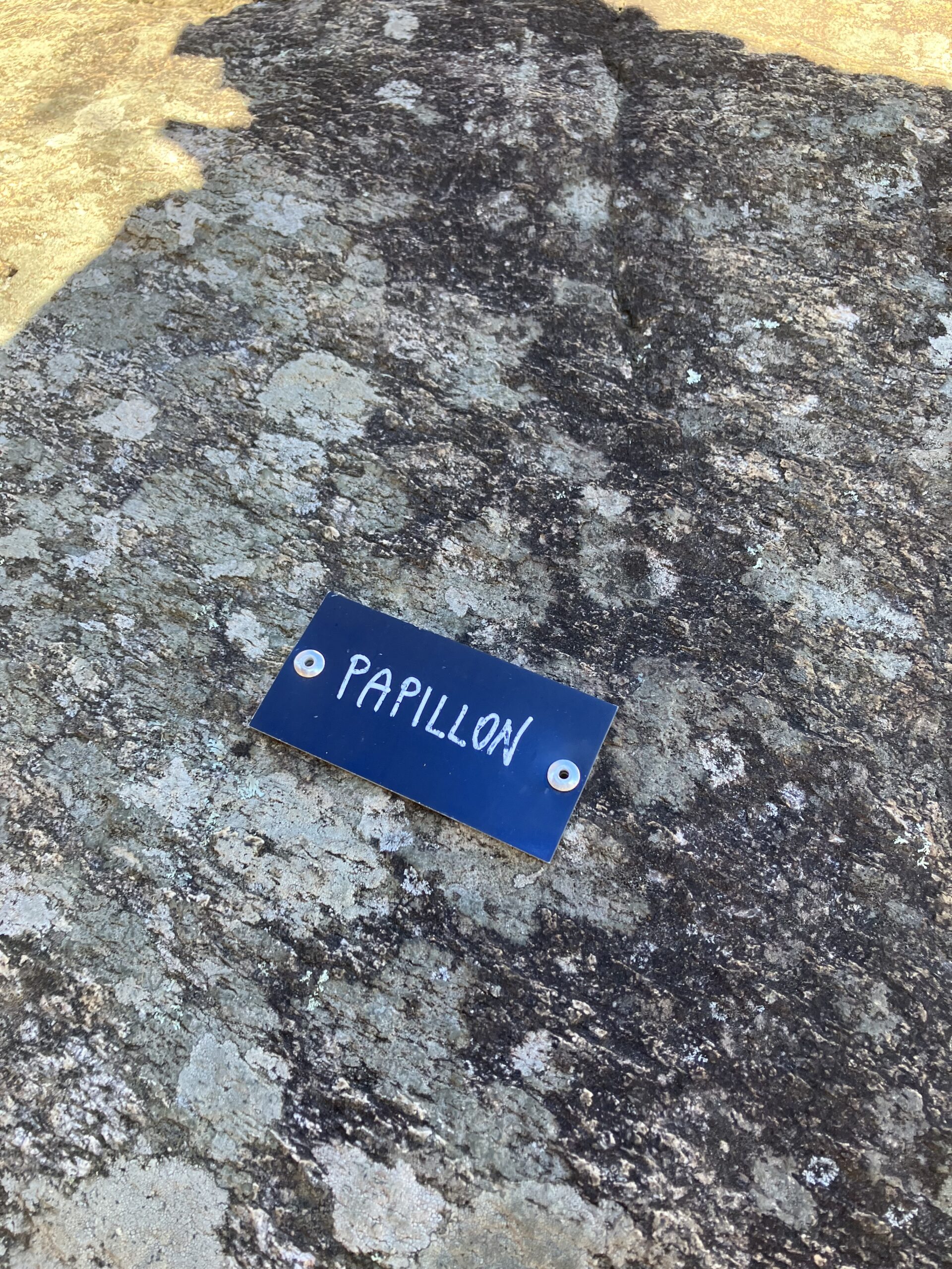 L1 bel tiro continuo tra muretti e lame – di cui una in dulfer – con traverso finale verso sinistra che richiede un buon impegno psicologico – attenzione a tirare la lama staccata prima del traverso che suona un po’. L2 dalla sosta S1 spostarsi a sinistra su una cengia abbastanza grossa da cui parte il tiro – altra targhetta con nome Papillon – tiro plaisir su risalti ben appigliati.