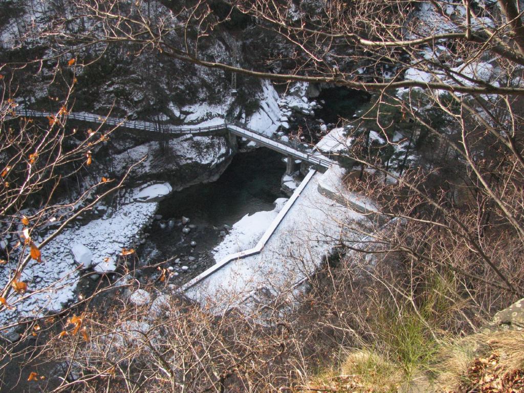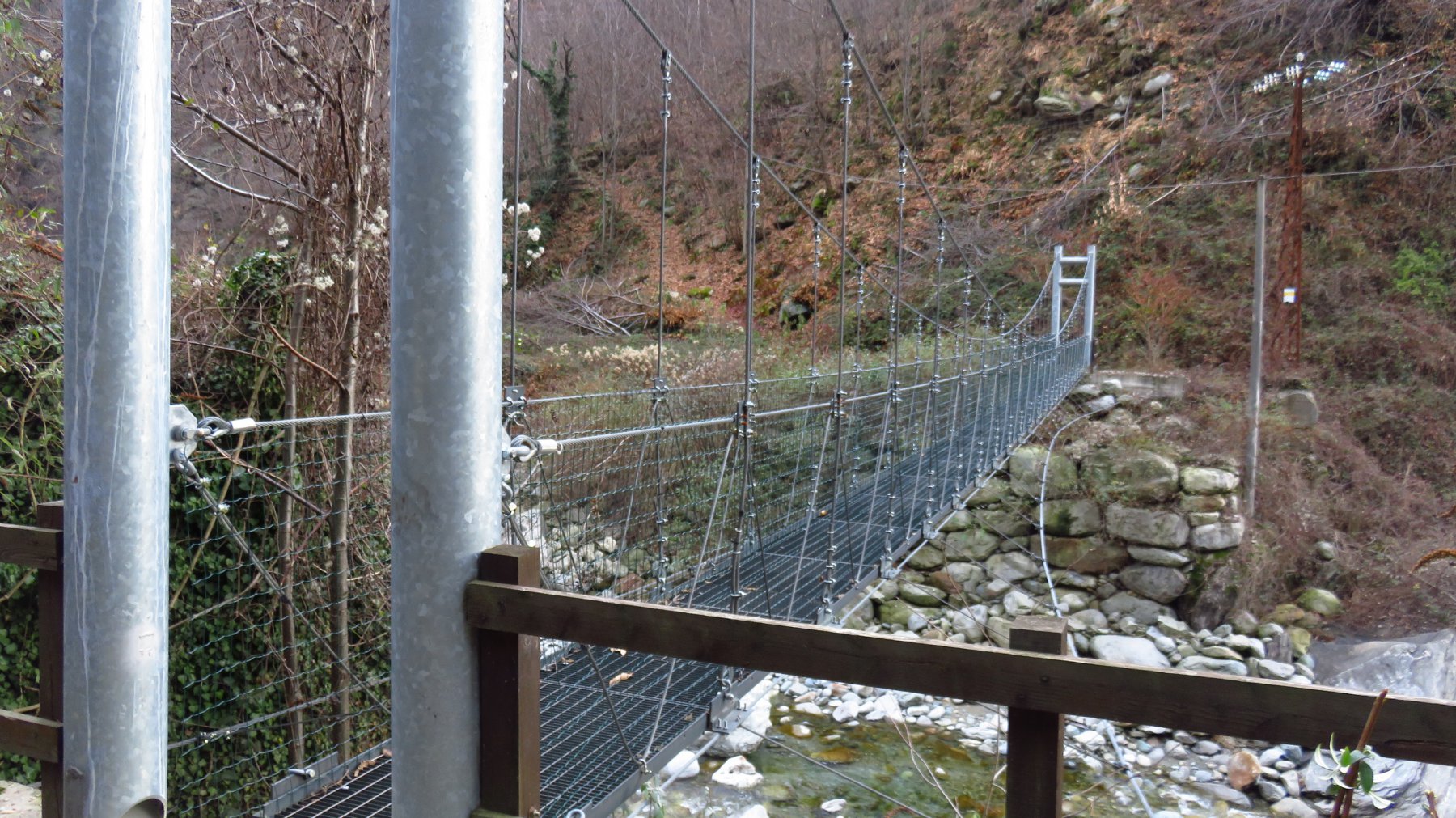 Ora si percorre un tratto di asfalto fino a Stroba 710m e si scende a sx della casa sulla curva dipinta colore rosa, qui la vecchia mulattiera della Val Soana scende alla Centrale e una bella strada passando sotto al Mont d’la Trempia arriva al ponte sopeso sul Soana,lo si attraversa e in poco si risale a Raje chiudendo l’anello.