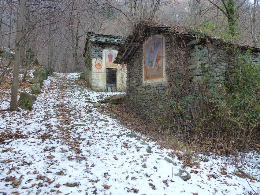 Dalla borgata Raje 550m. senza scendere al borgo si passa a fianco del pilone votivo e proseguendo pressoché in piano si percorre la bella mulattiera fino al rio del Bigio.