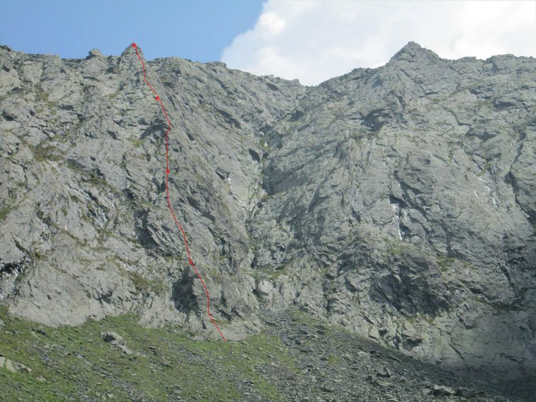 - L1 4c/ 5a si sale per placche e muretti raggiungendo delle cenge erbose sopra un primo spuntone. Roccia discreta 45 mt