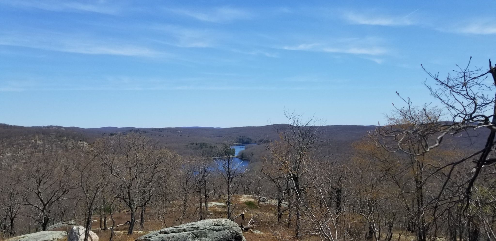 Da Parker Cabin Mountain la vista spazia su Lake Skenonto e Lake Sebago. Qui ci si ricongiunge al sentiero rosso (ma con sforzo ben minore, perche’ si sono evitatre le salite a Pine Hill e Big Pine Hill). Il sentiero conduce in saliscendi ad un grande focolare alla base della vetta di Tom Jones Mountain. Con una ripida risalita tra le rocce e ignorata la deviazione per il bivacco Tom Jones, si guadagna la vetta. Qui il panorama spazia sul Little Long Pond e Lake Kawanauke.