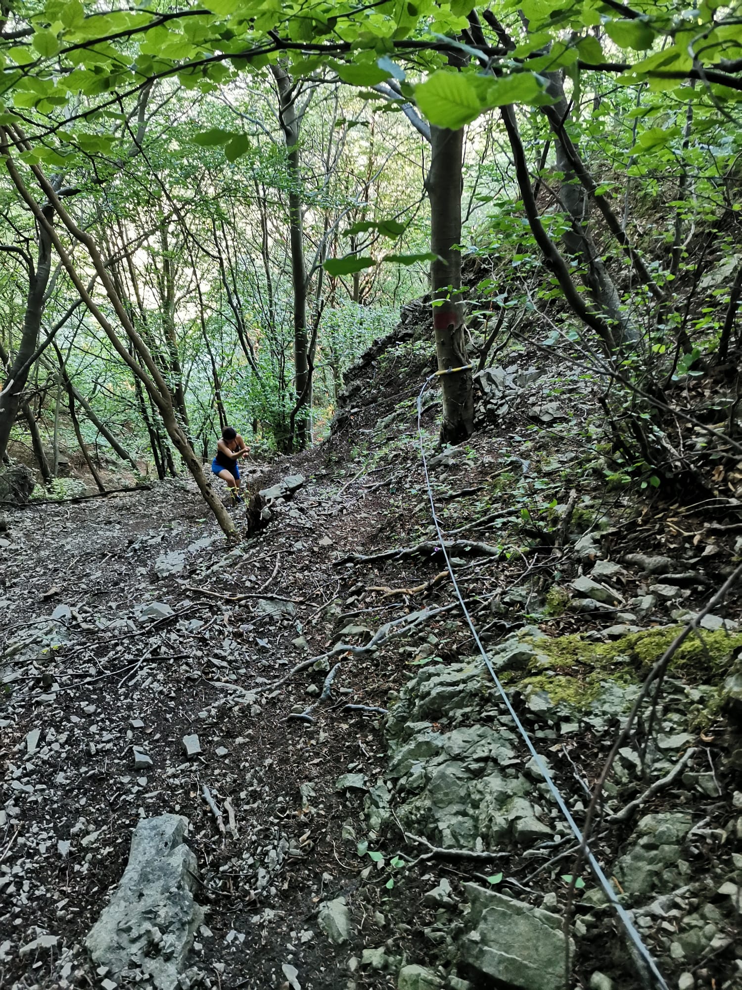 La traccia presentata mostra subito le caratteristiche che l’accompagneranno fino in cima: scarsissima frequentazione, terreno scosceso e smosso, estrema ripidità, ma con buona bollatura specialmente sui tronchi. Si sale zigzagando fra radici affioranti e ghiaie instabili, spesso con l’aiuto di cavi tesi sulla linea di massima pendenza.