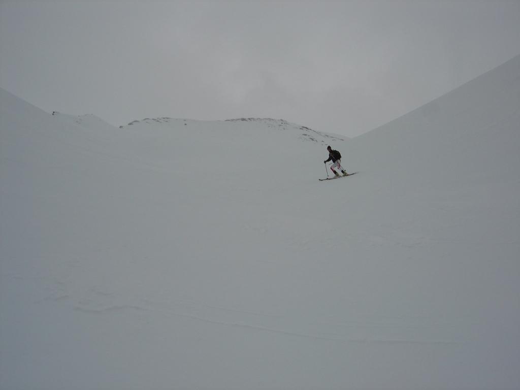 Viste che le condizioni meteo sul versante italiano continuavano ad essere pessime abbiamo riposto le ns/speranze sul versante francese al di là del colle della Maddalena. Scelta azzeccata perchè anche se non c’era il sole, non pioveva o nevicava e le nuvole non erano così minacciose. Ci siamo comunque diretti su una gita semplice e ben conosciuta. Dalla partenza fino a quota 2.200 mt la neve era una via di mezzo tra crosta e marcia ma da poi l’abbiamo trovata tutta portante molto simile a quella primaverile con una leggera spolverata di neve fresca che ne ha migliorato la qualità in discesa. Una stella in meno solo per la visibilità non ottimale (ma oggi non si poteva chiedere di più !!!). Nel complesso discesa più che ottima tanto da indurci a ripellare e risalire la parte alta.